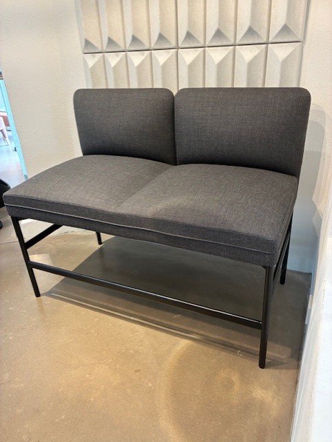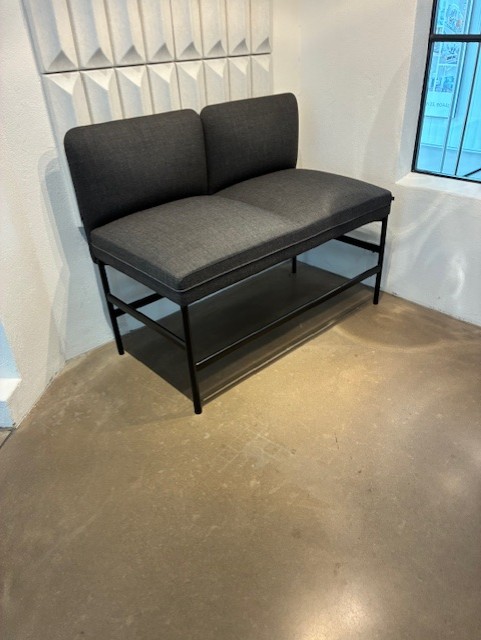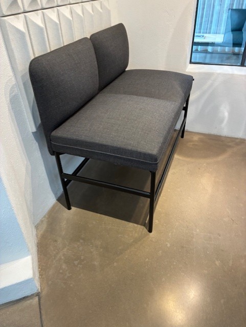 Sits och rygg i tyg (grå). Ben i metall (svart).