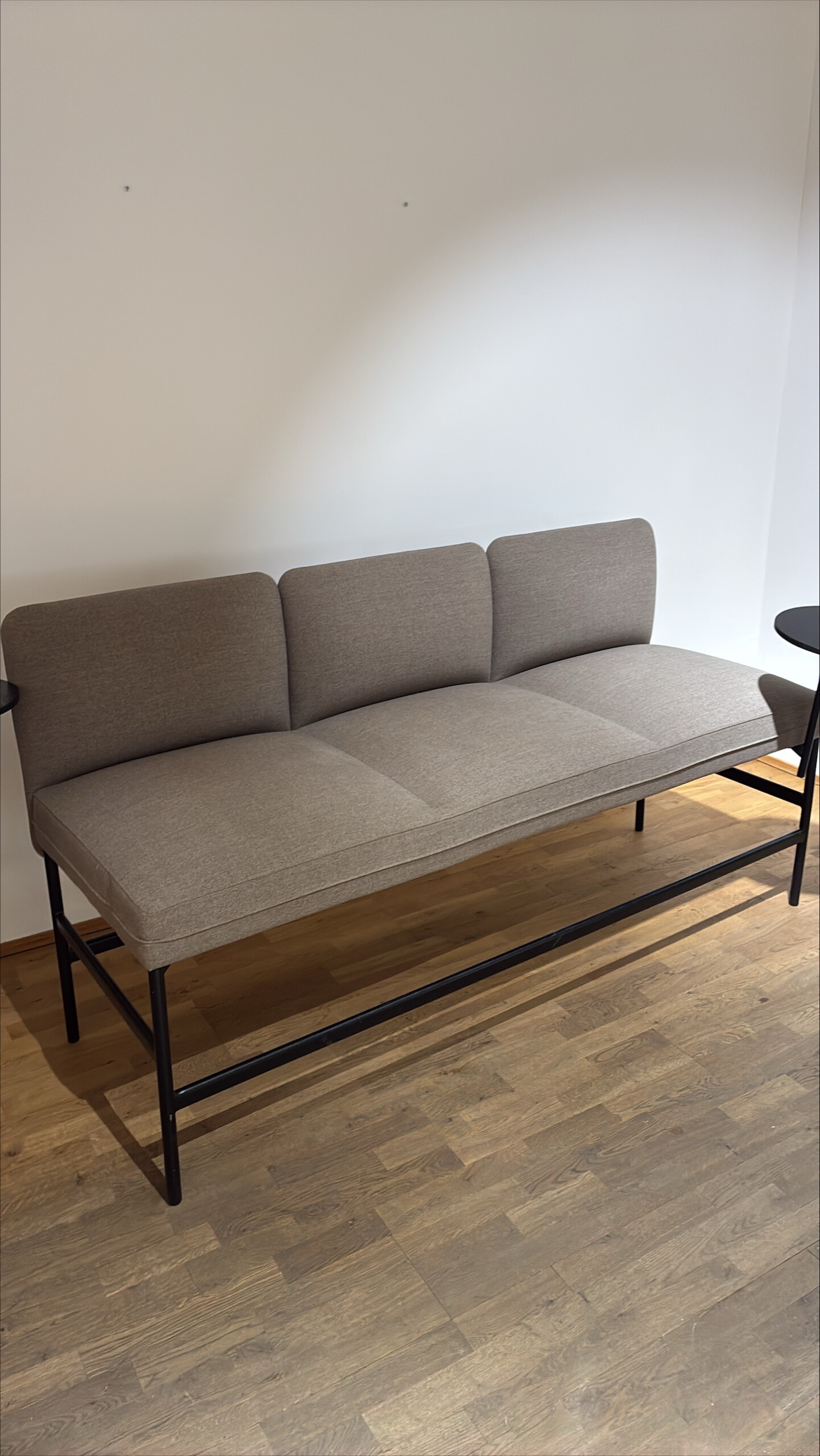 Sits och rygg i tyg (grå). Ben i metall (svart).