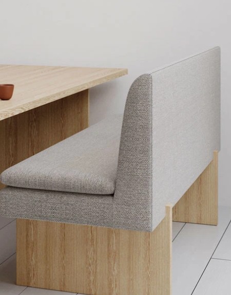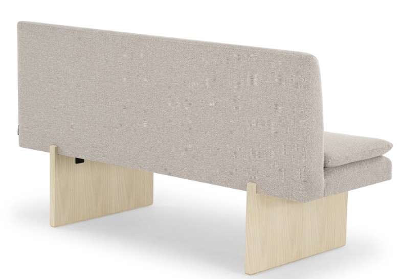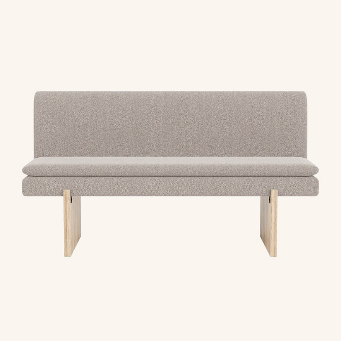 Sits och rygg i tyg (beige). Ben i trä (ek).