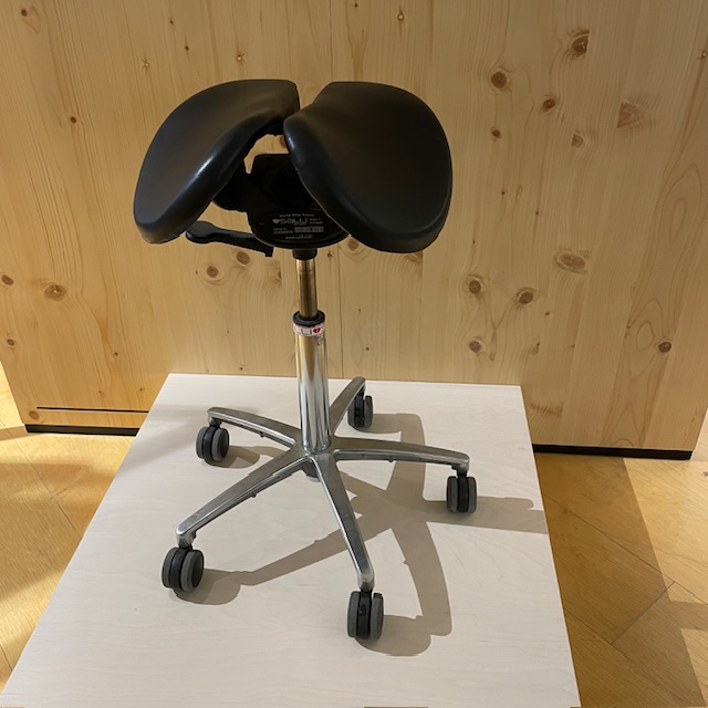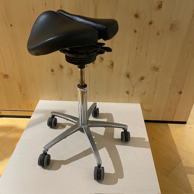 Sits i läder (svart). Kryssfot i metall (krom). Höj- och sänkbar.