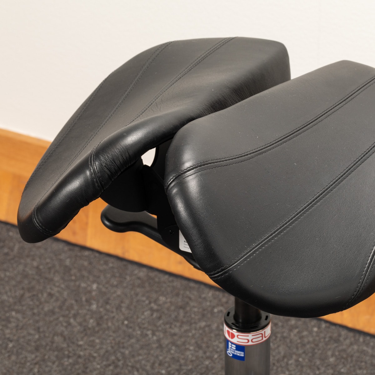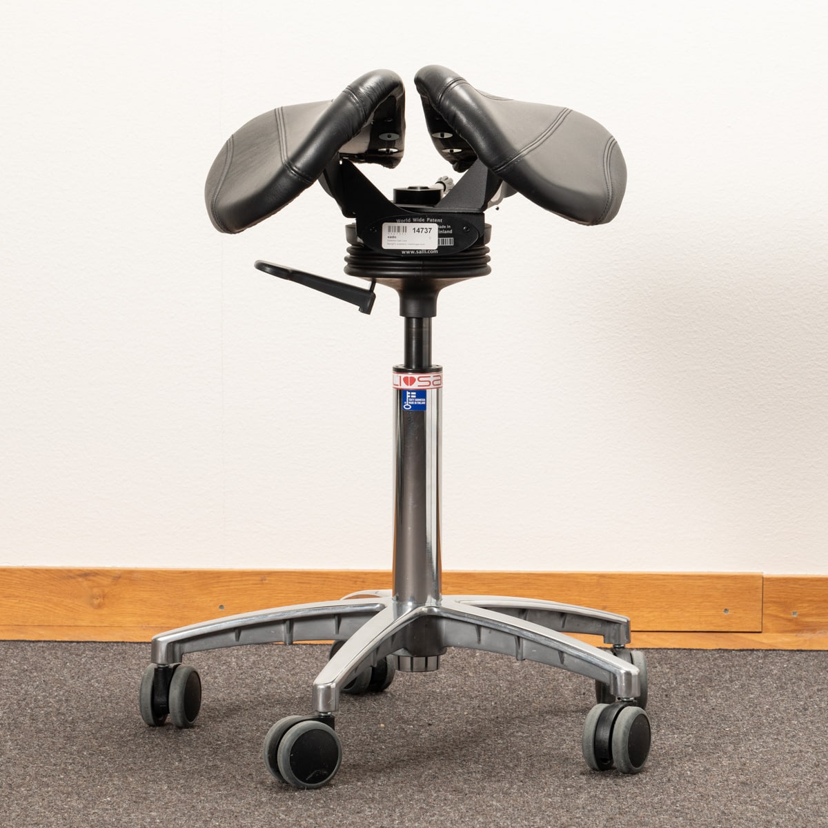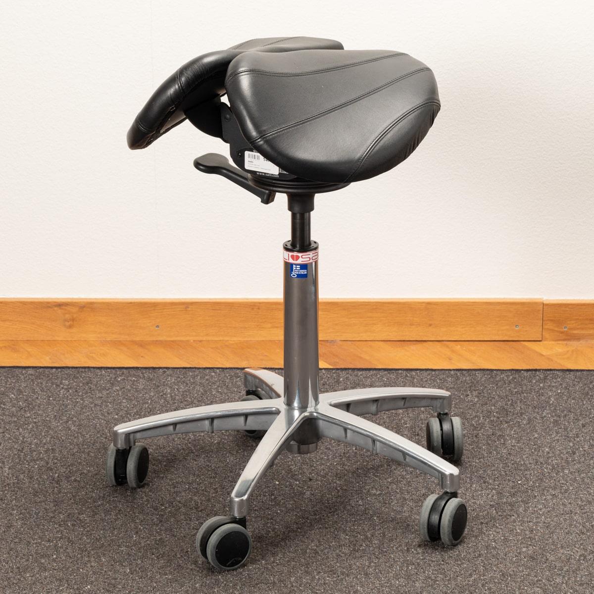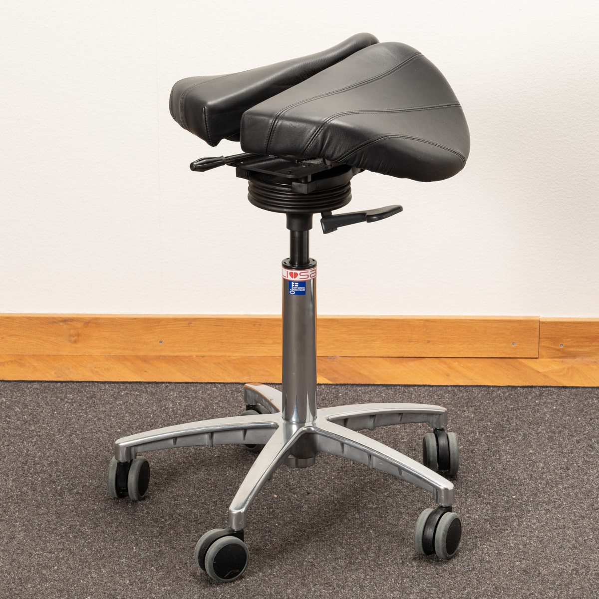 Sits i läder (svart). Kryssfot i metall (krom). Höj- och sänkbar.