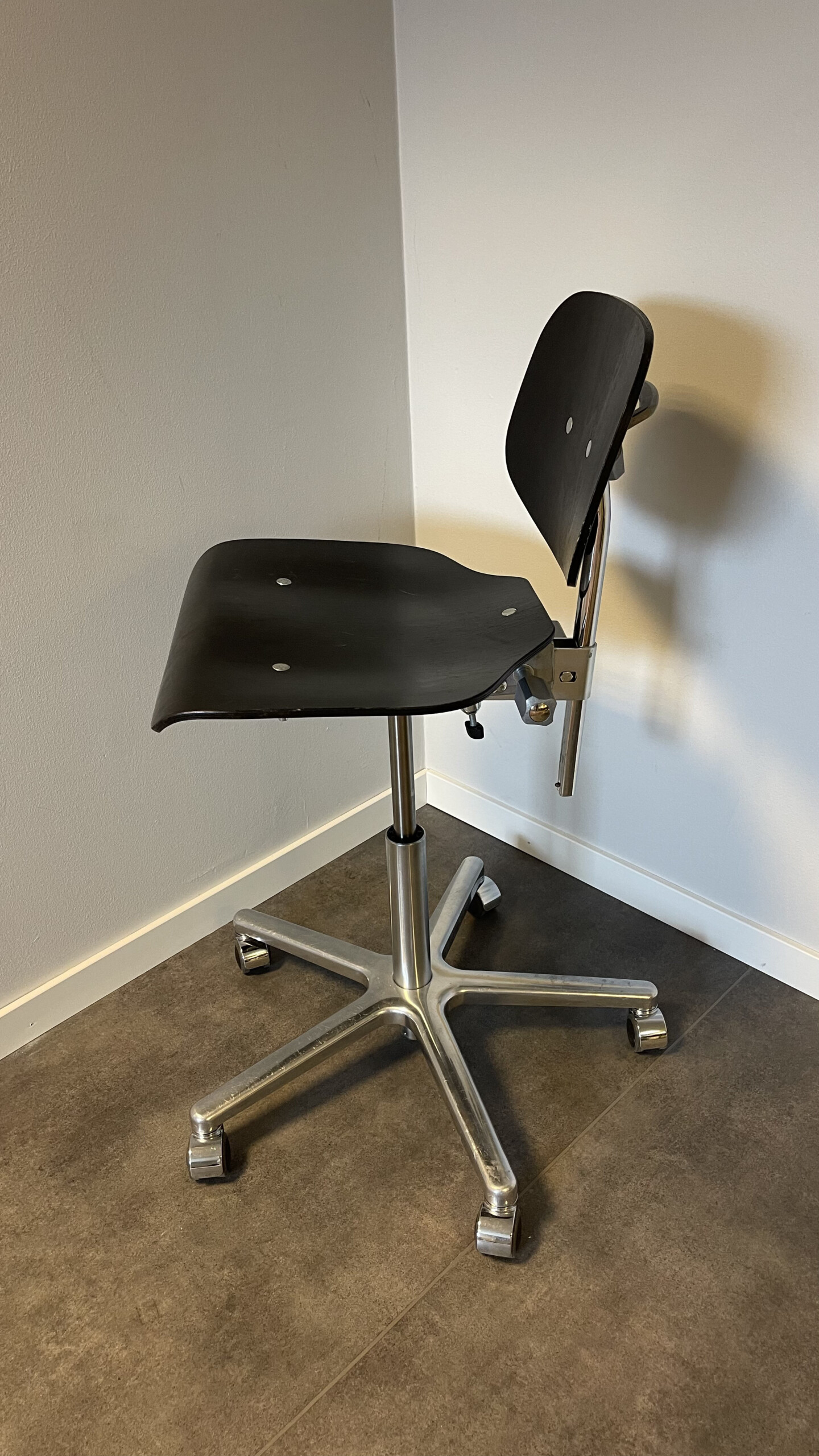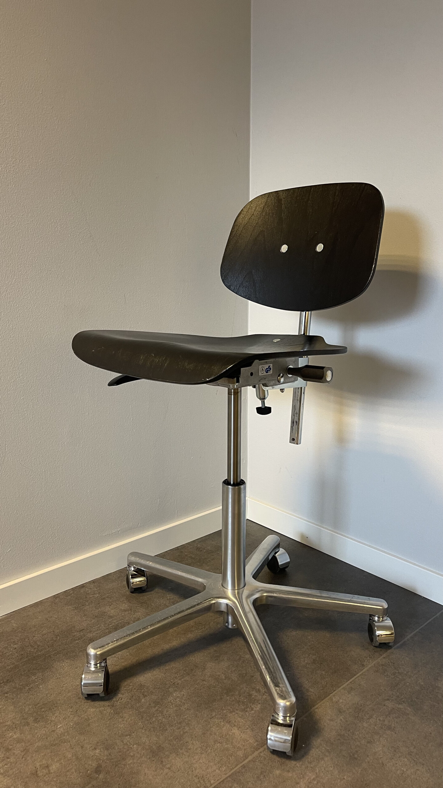 Sits och rygg i trä (svart). Kryssfot i metall (aluminium). Höj- och sänkbar.