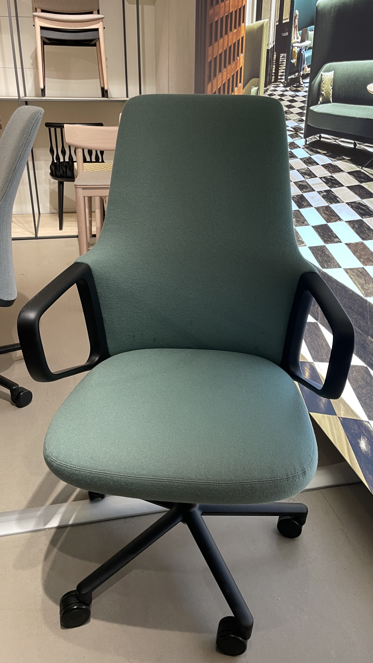 Sits och rygg i tyg (grön). Kryssfot i plast (svart). Höj- och sänkbar.