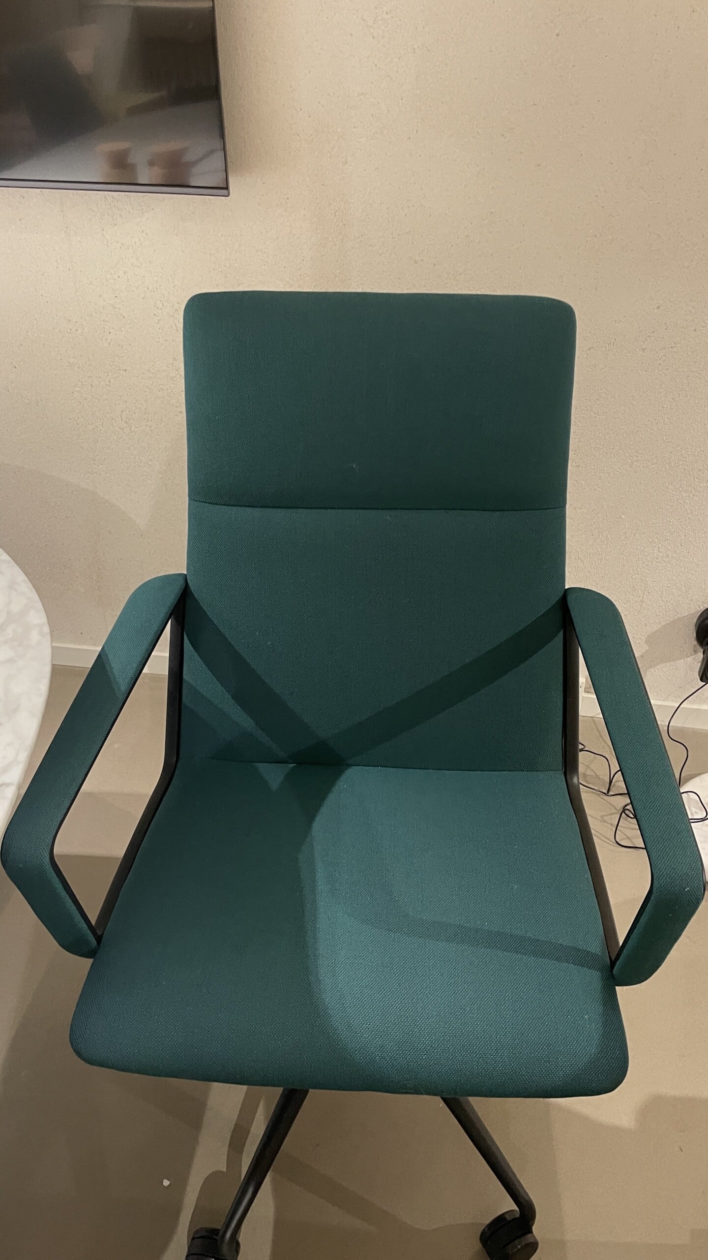 Sits och rygg i tyg. Kryssfot i metall (svart). Höj- och sänkbar.