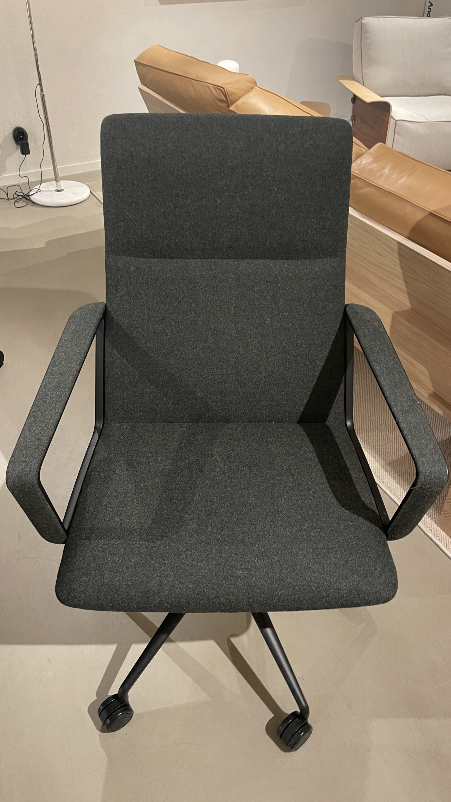 Sits och rygg i tyg. Kryssfot i metall (svart). Höj- och sänkbar.