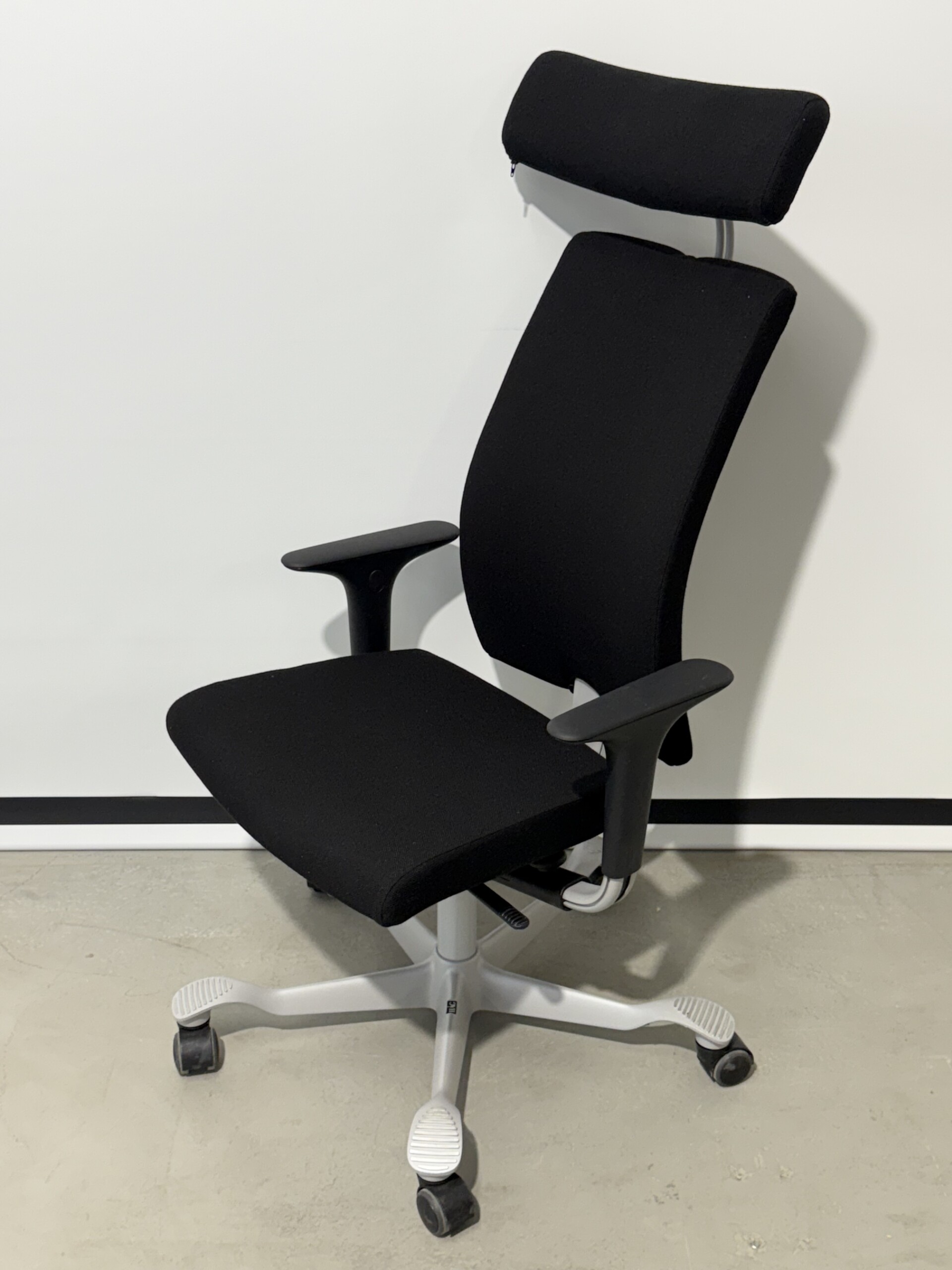 Sits och rygg i tyg (svart). Kryssfot i metall (grå). Höj- och sänkbar.