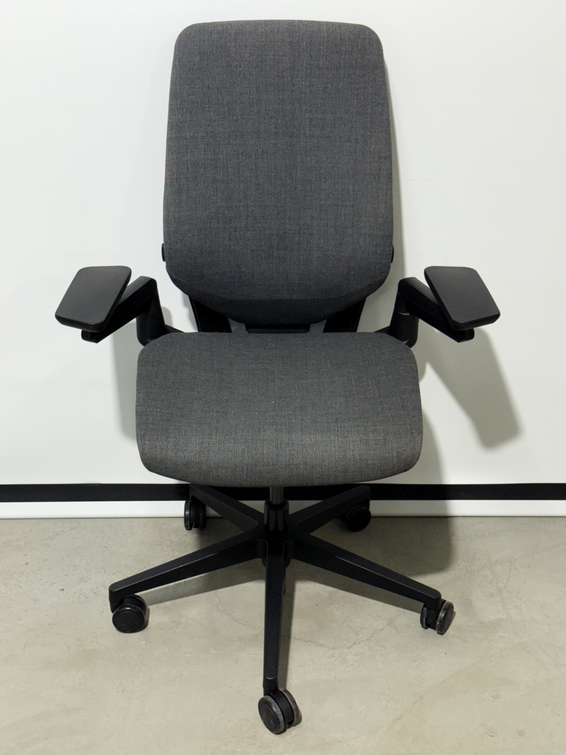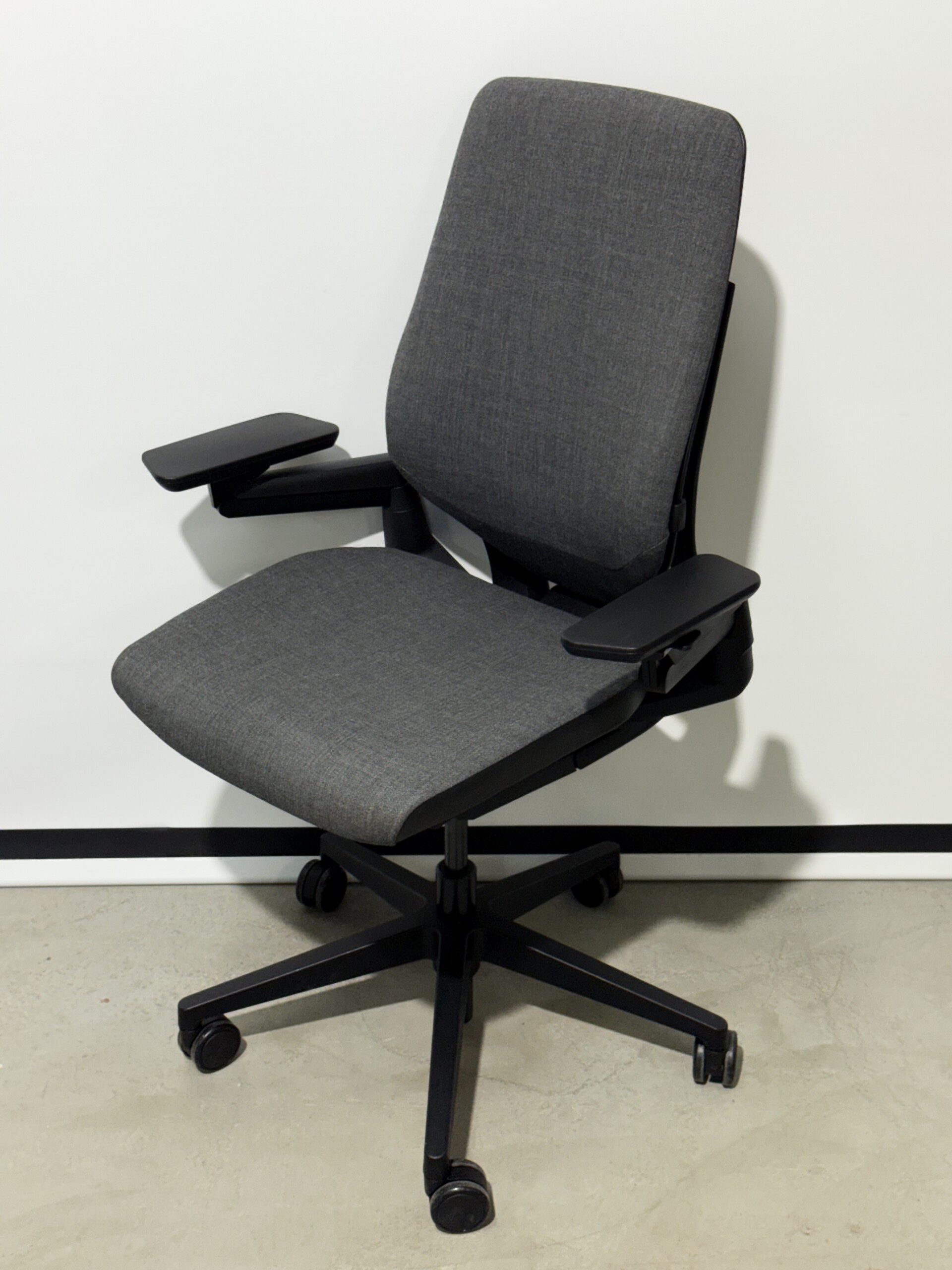 Sits och rygg i tyg (grå). Kryssfot i plast (svart). Höj- och sänkbar.