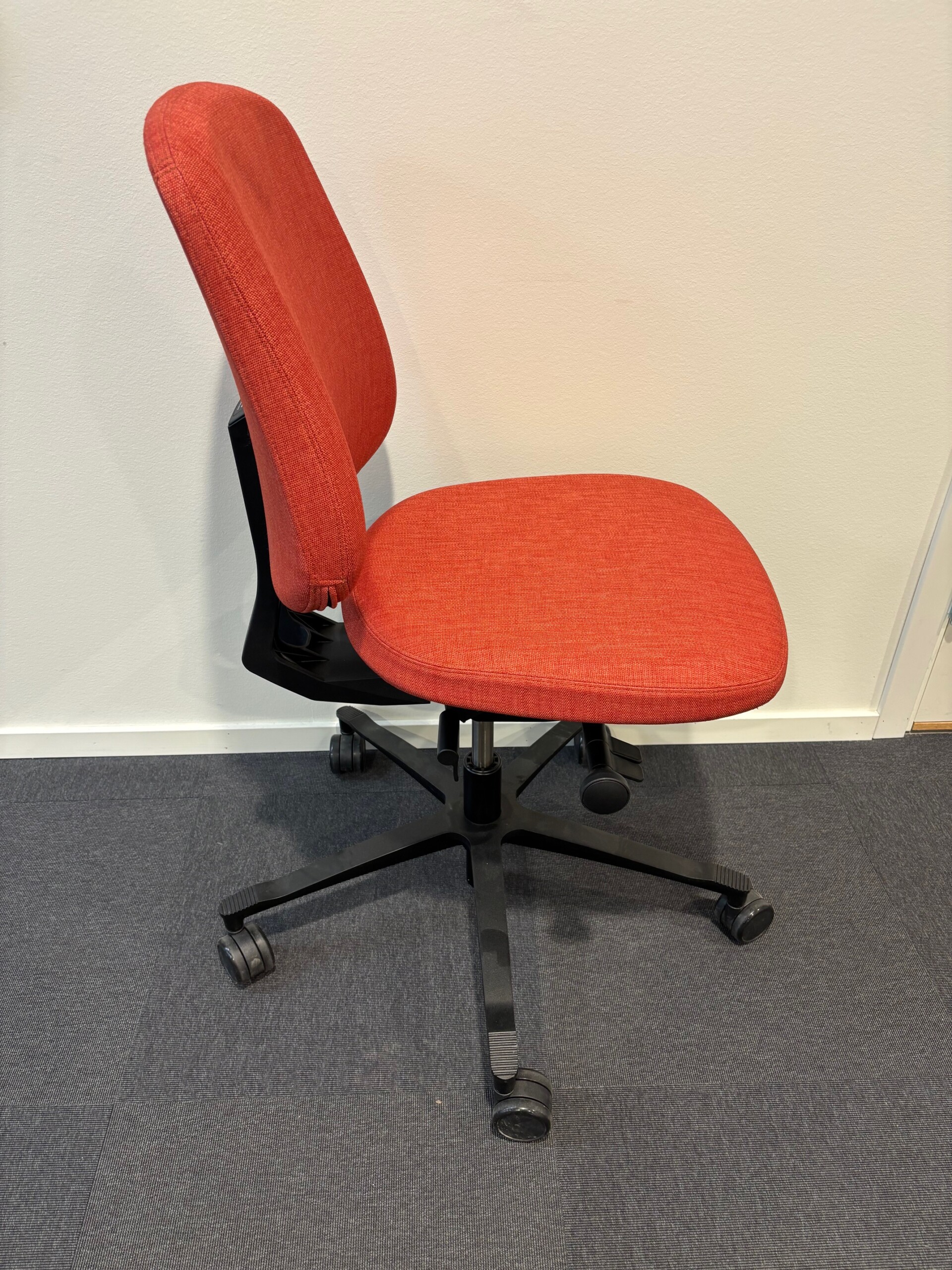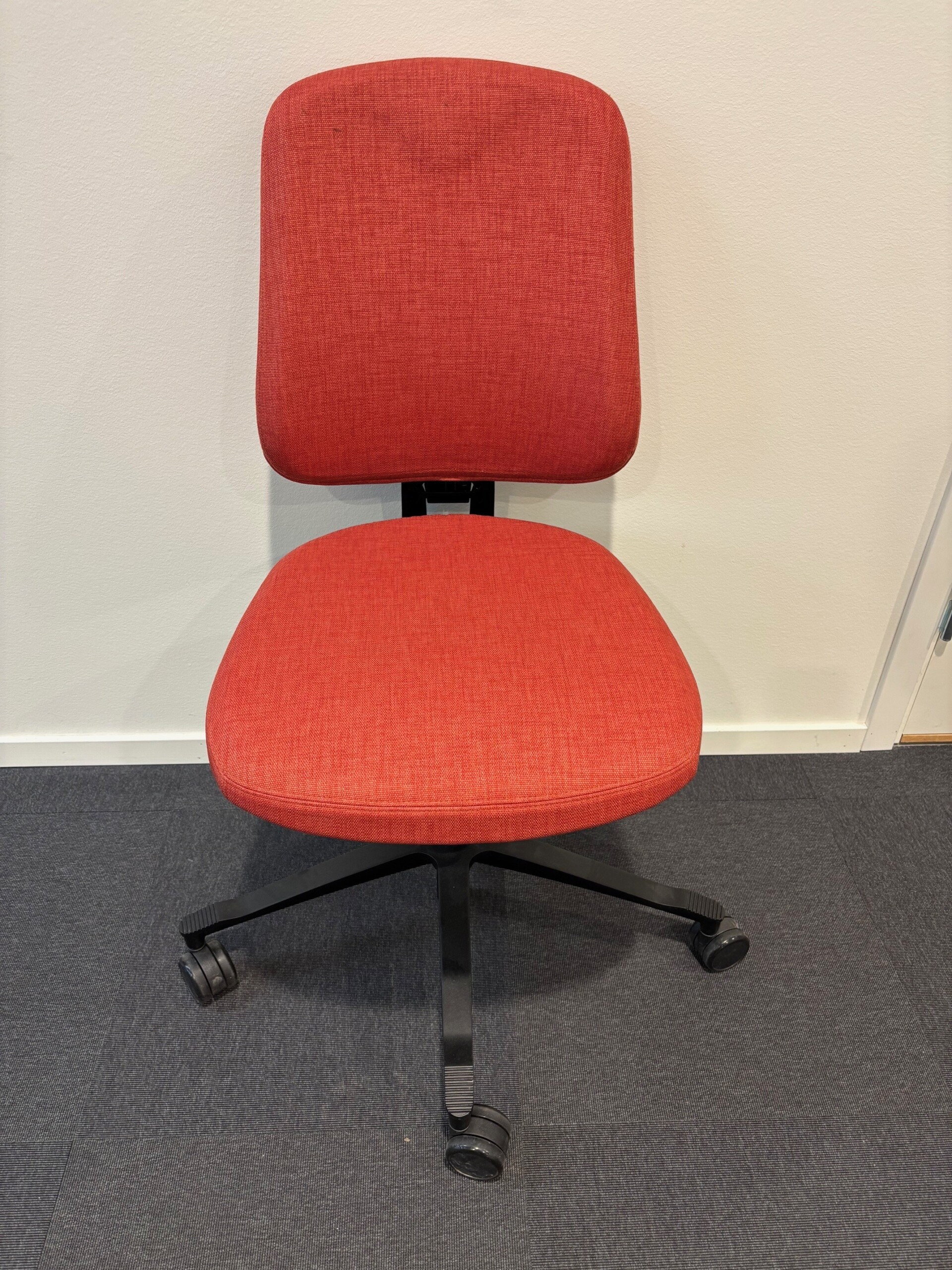 Sits och rygg i tyg (röd). Kryssfot i metall (svart). Höj- och sänkbar.