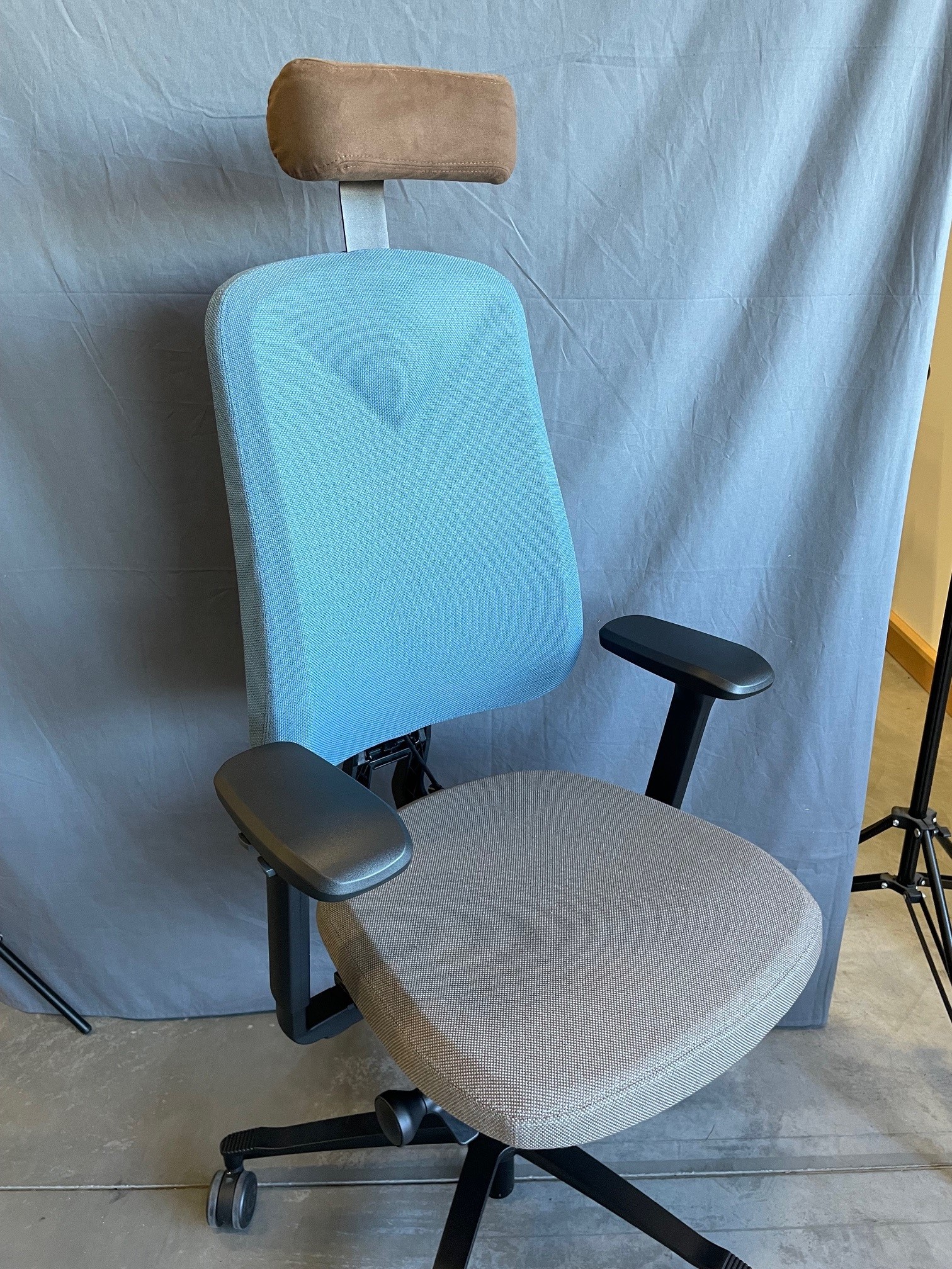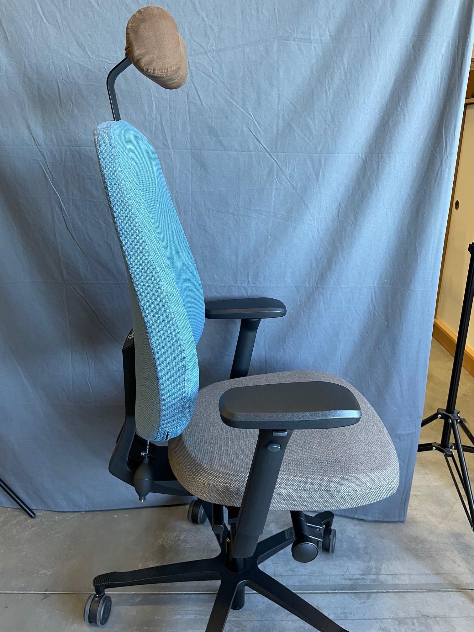 Sits i tyg (grå). Rygg i tyg (blå). Kryssfot i metall (svart). Höj- och sänkbar.