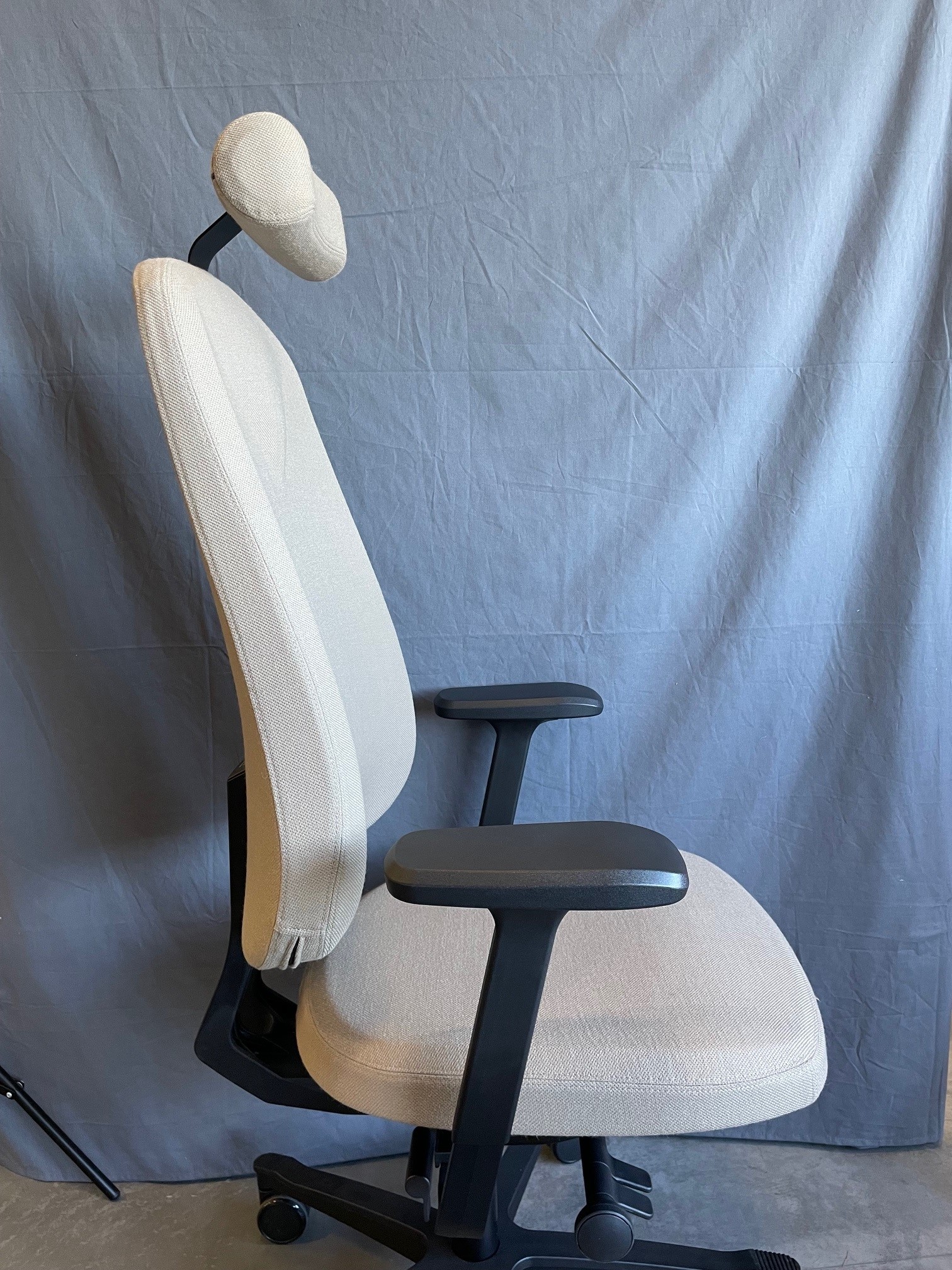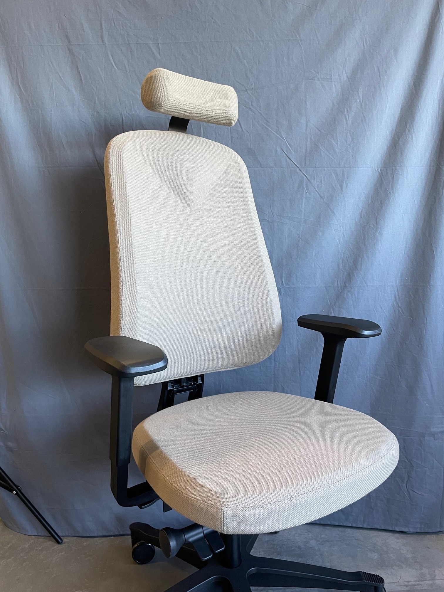 Sits och rygg i tyg (beige). Kryssfot i plast (svart). Höj- och sänkbar.