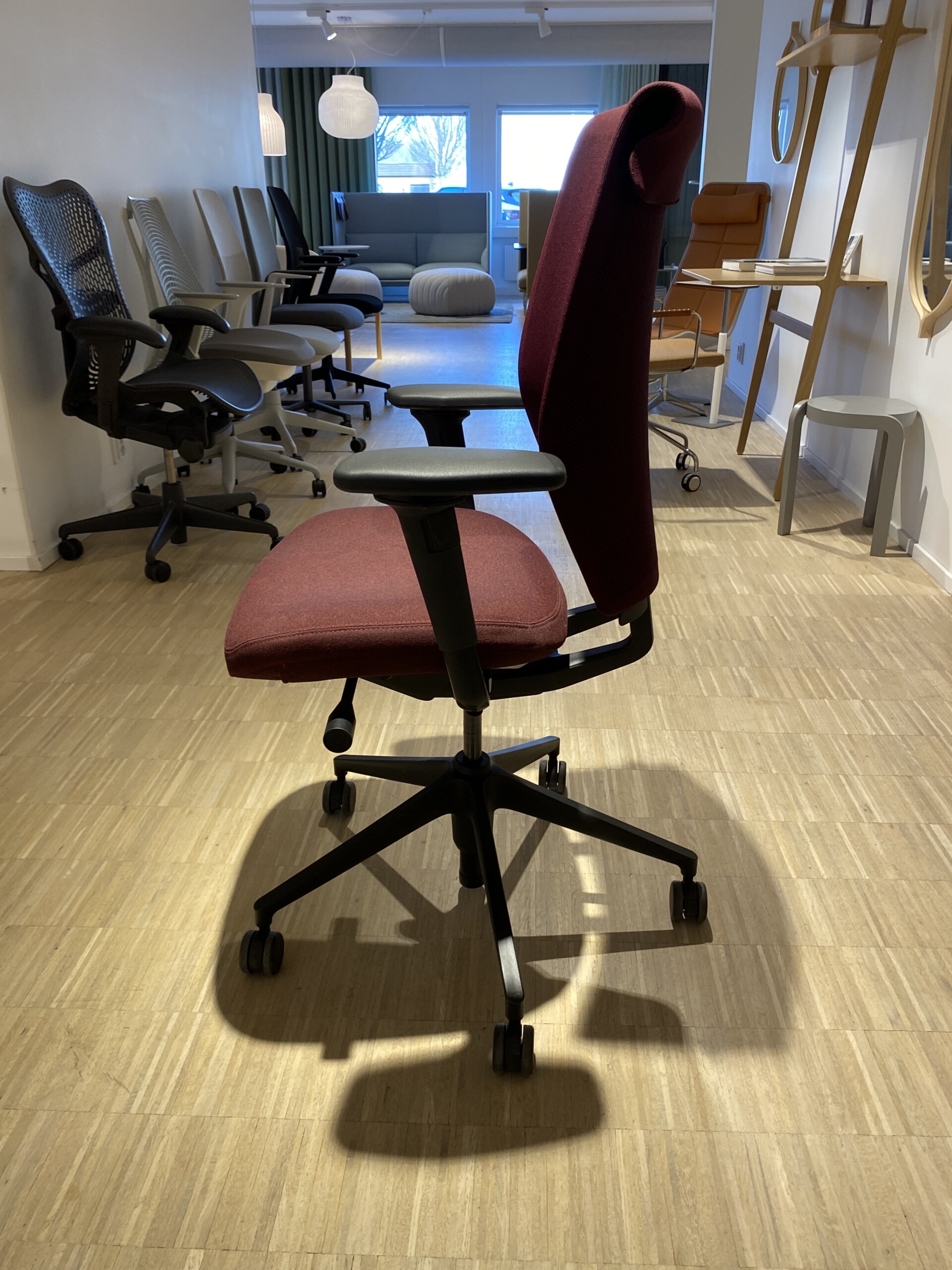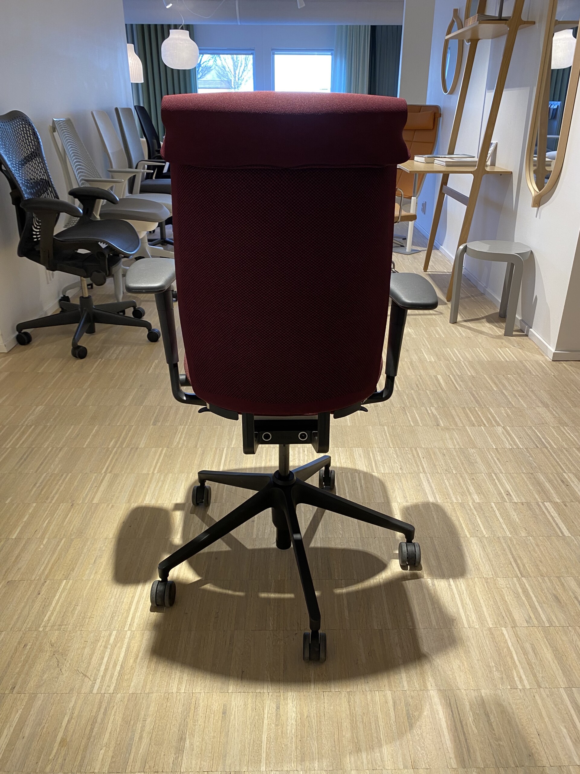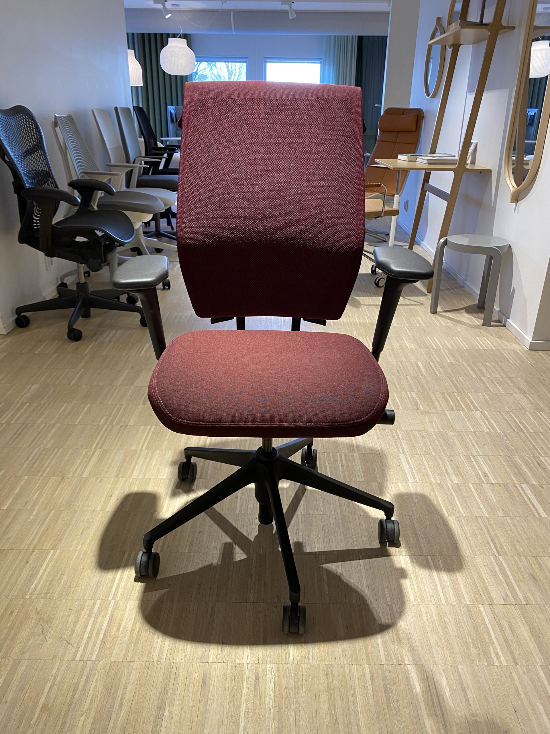 Sits i tyg (röd). Rygg i mesh (röd). Kryssfot i plast (svart). Höj- och sänkbar.