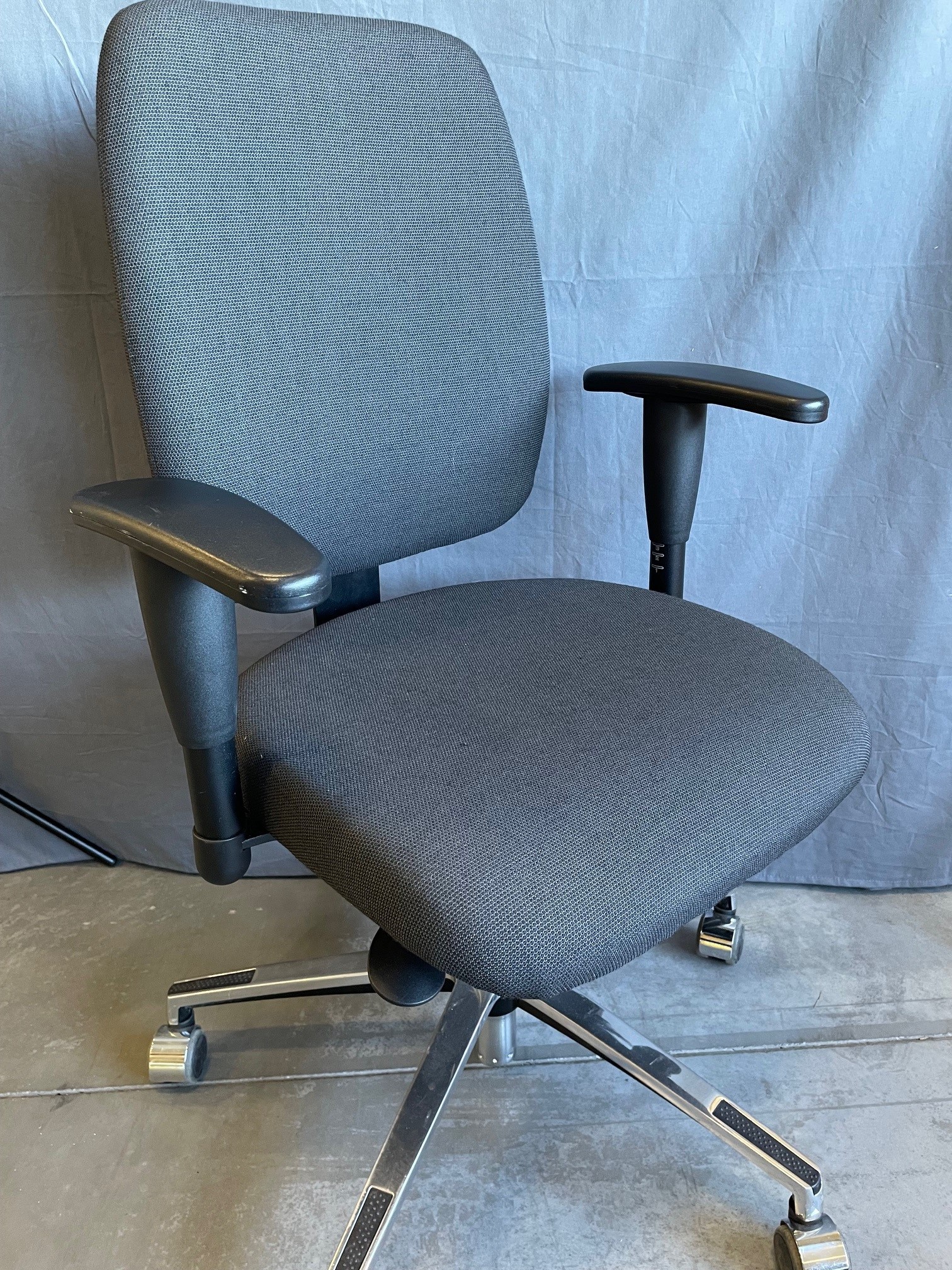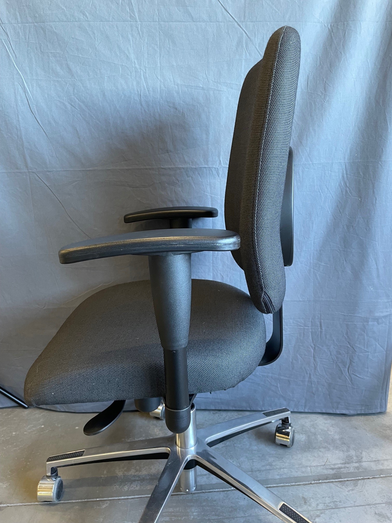 Sits och rygg i tyg (grå). Kryssfot i metall (aluminium). Höj- och sänkbar.