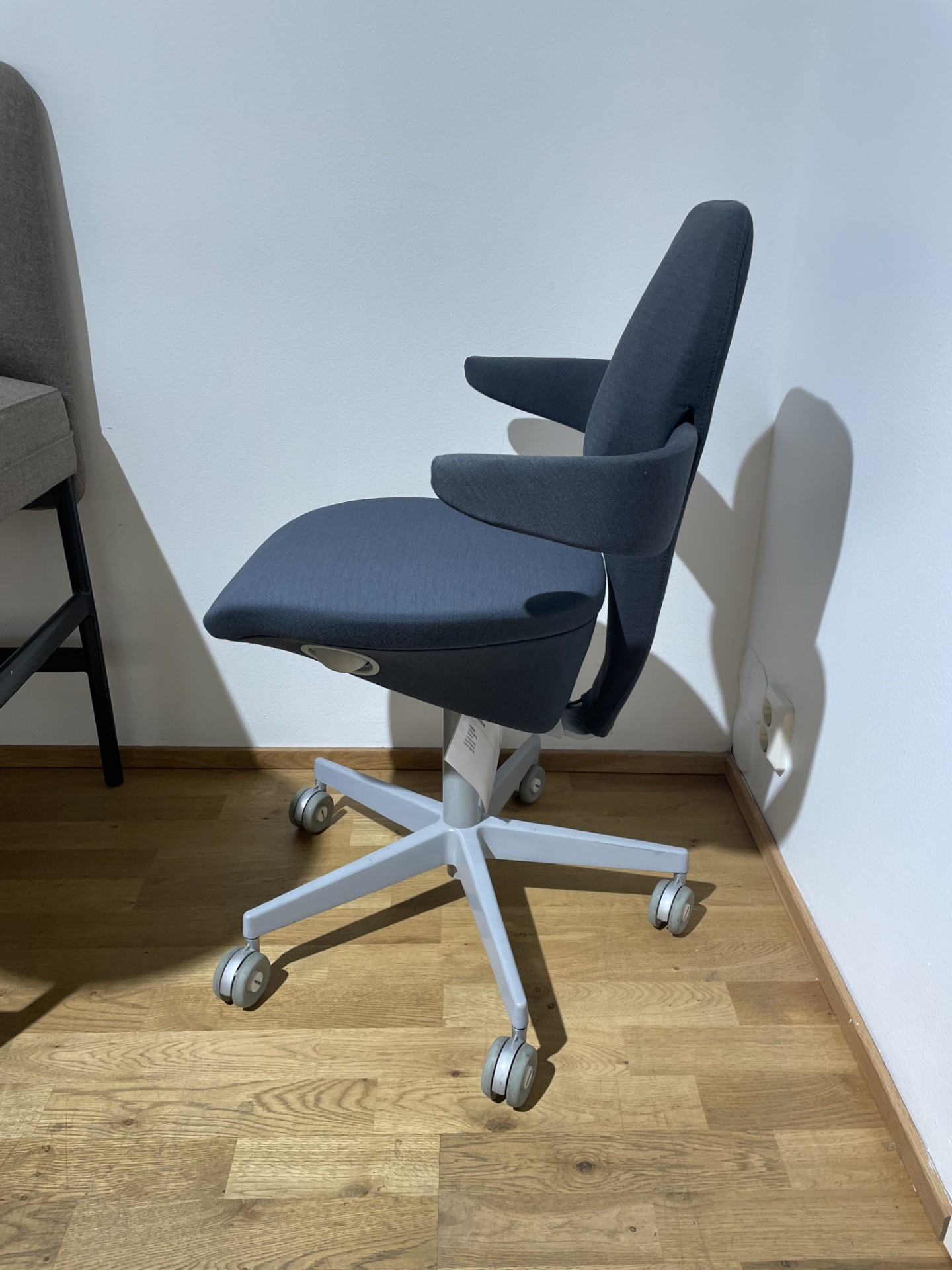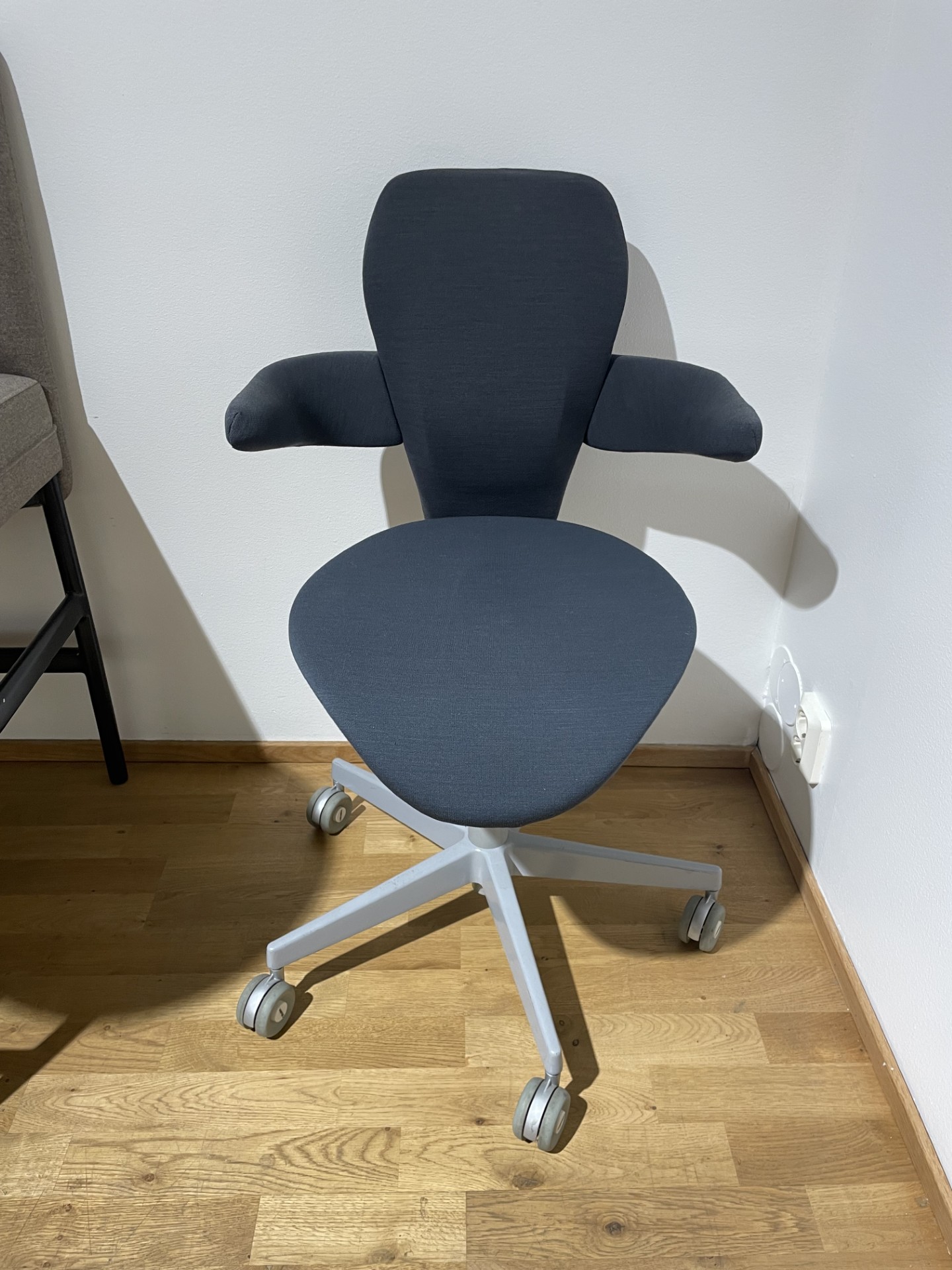 Sits och rygg i tyg (grå). Kryssfot i metall (grå). Höj- och sänkbar.