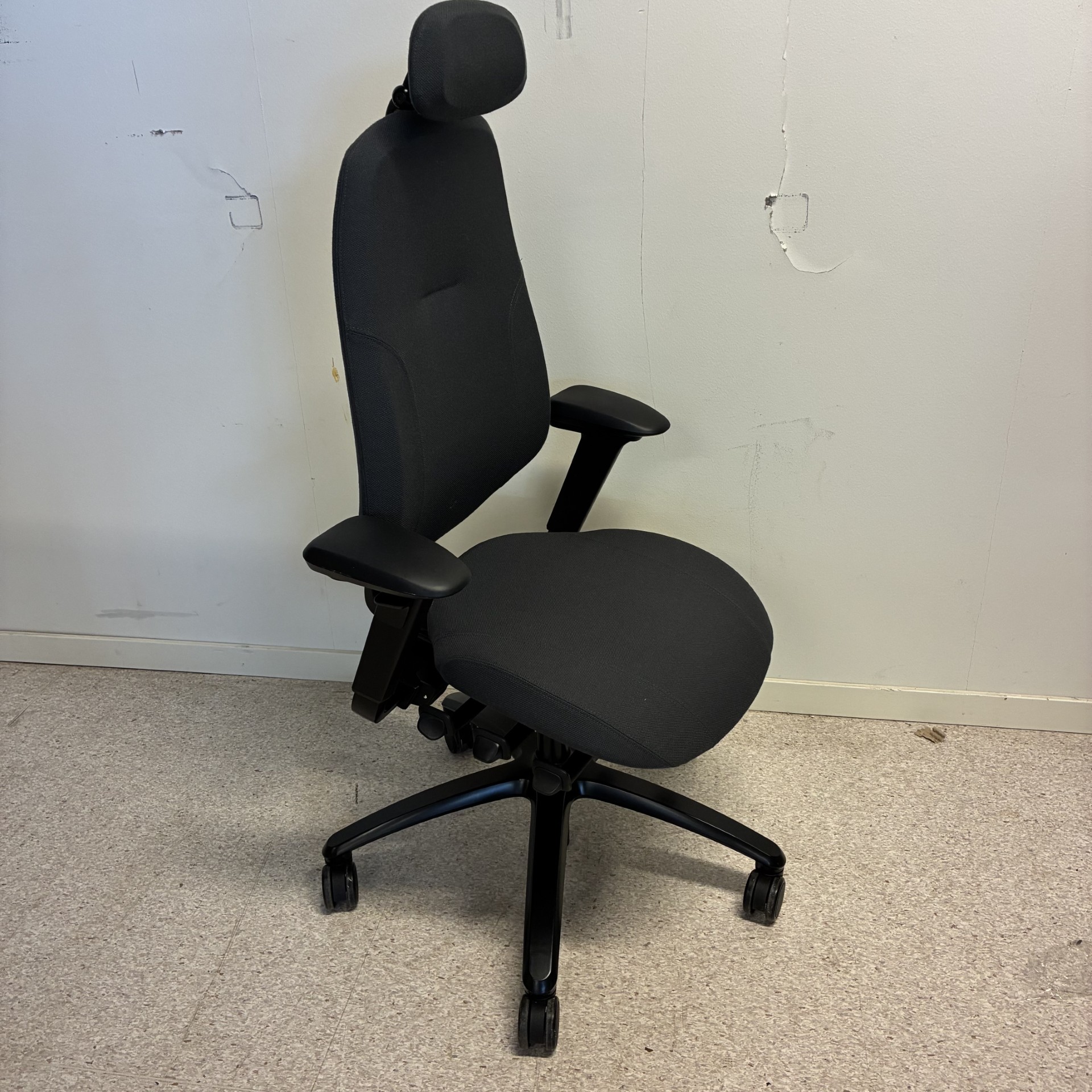 Sits och rygg i tyg (grå). Kryssfot i metall (svart). Höj- och sänkbar.