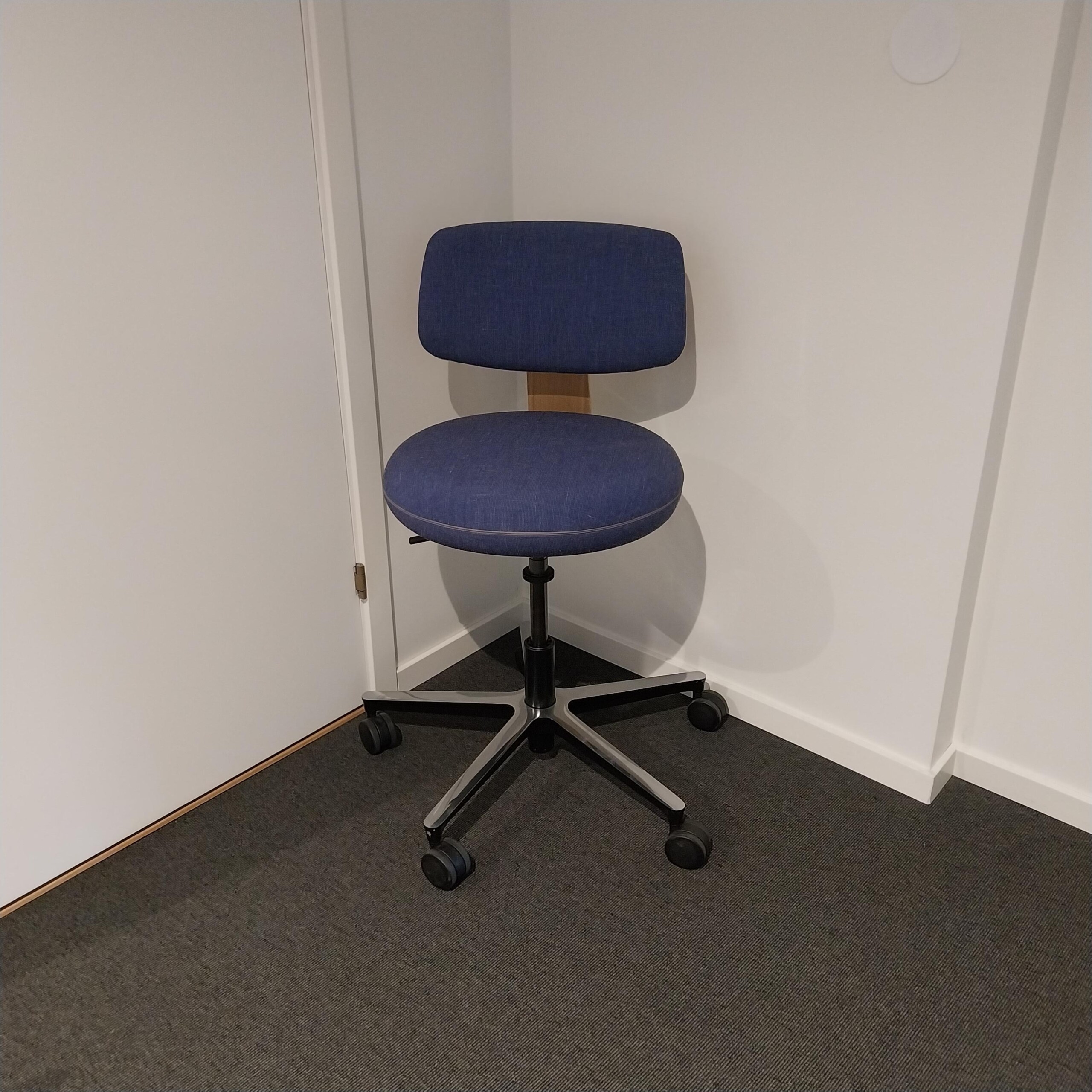 Sits och rygg i tyg (blå). Kryssfot i metall (aluminium). Höj- och sänkbar.