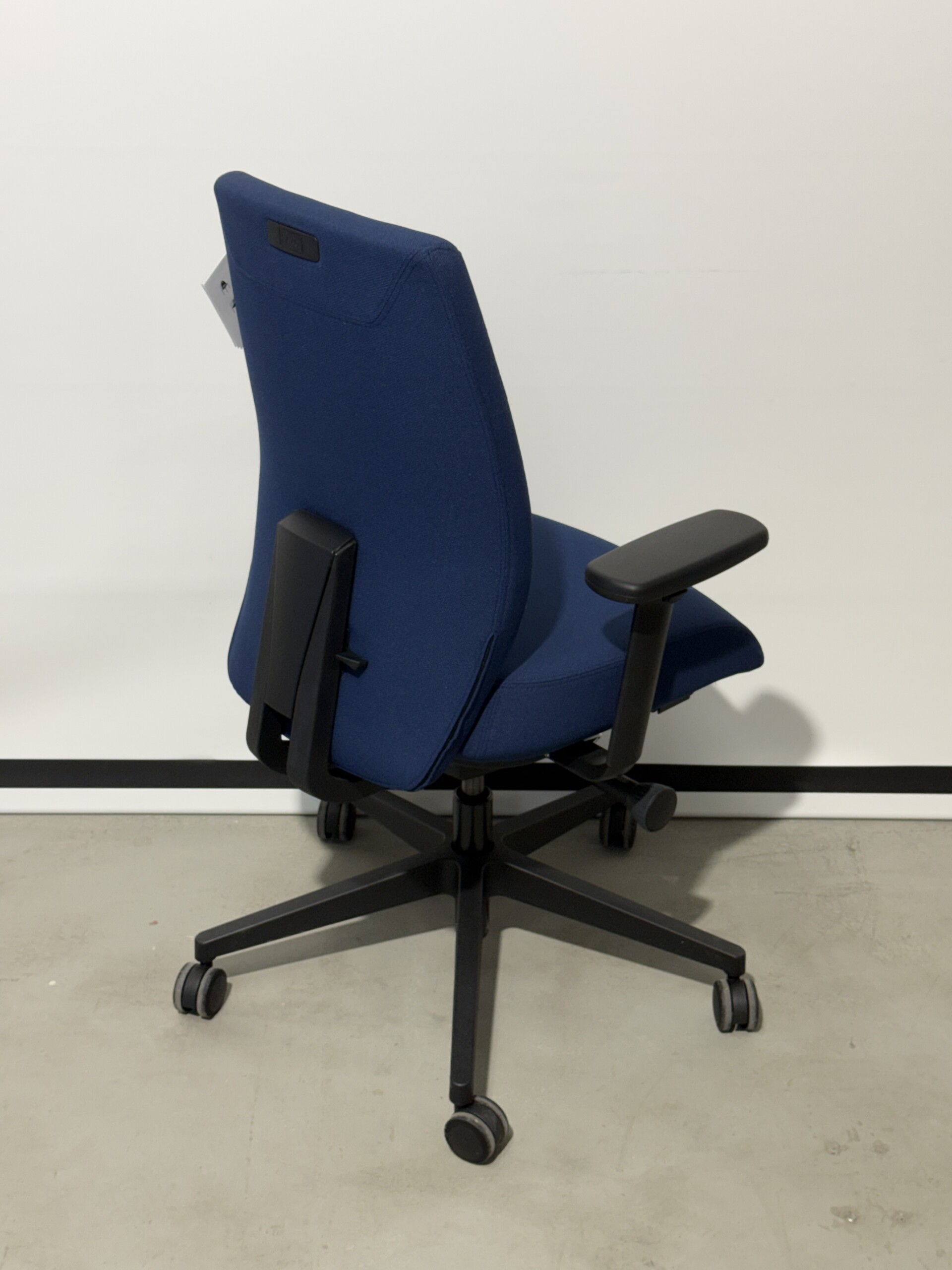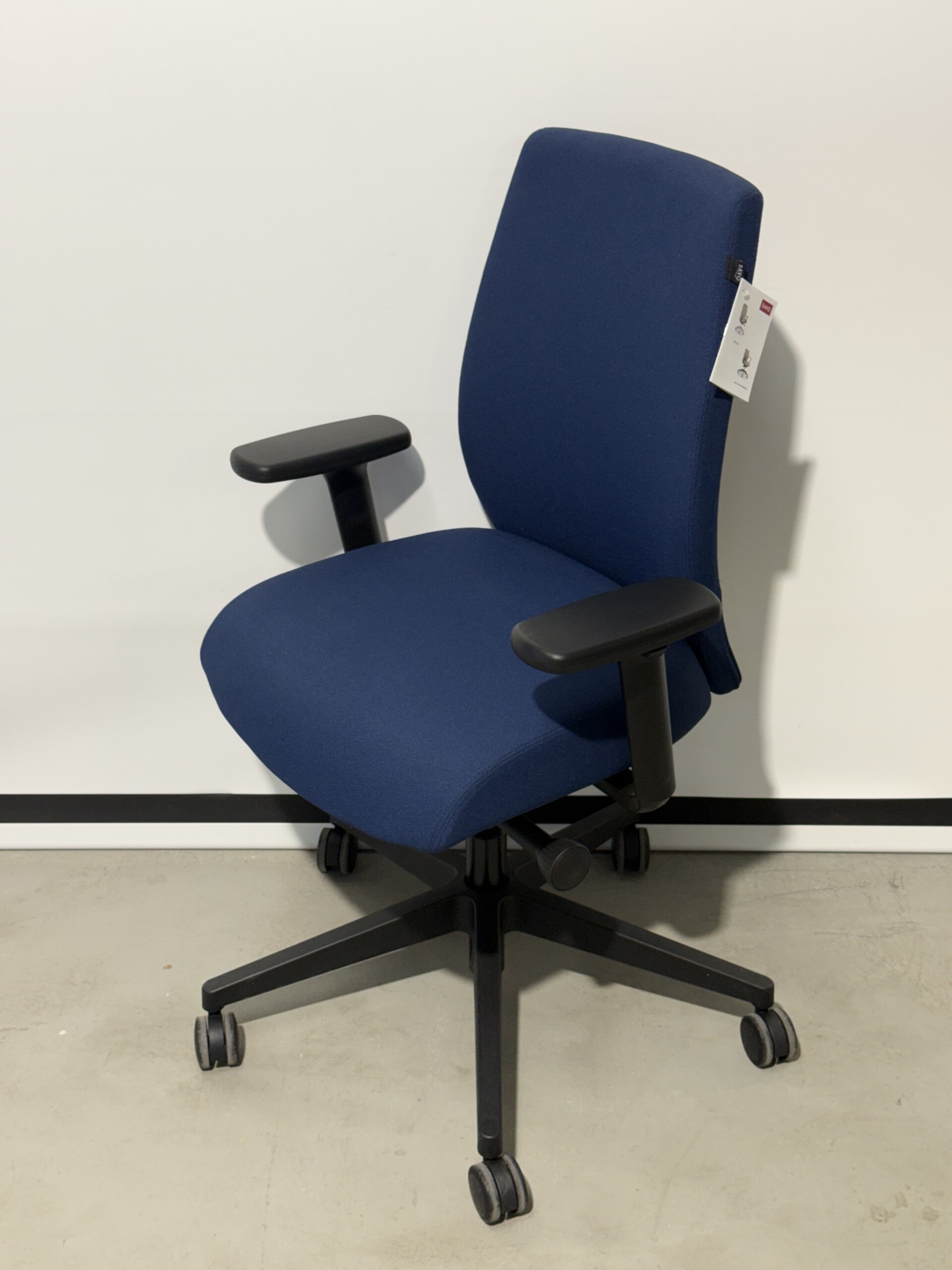 Sits och rygg i tyg (blå). Kryssfot i plast (svart). Höj- och sänkbar.