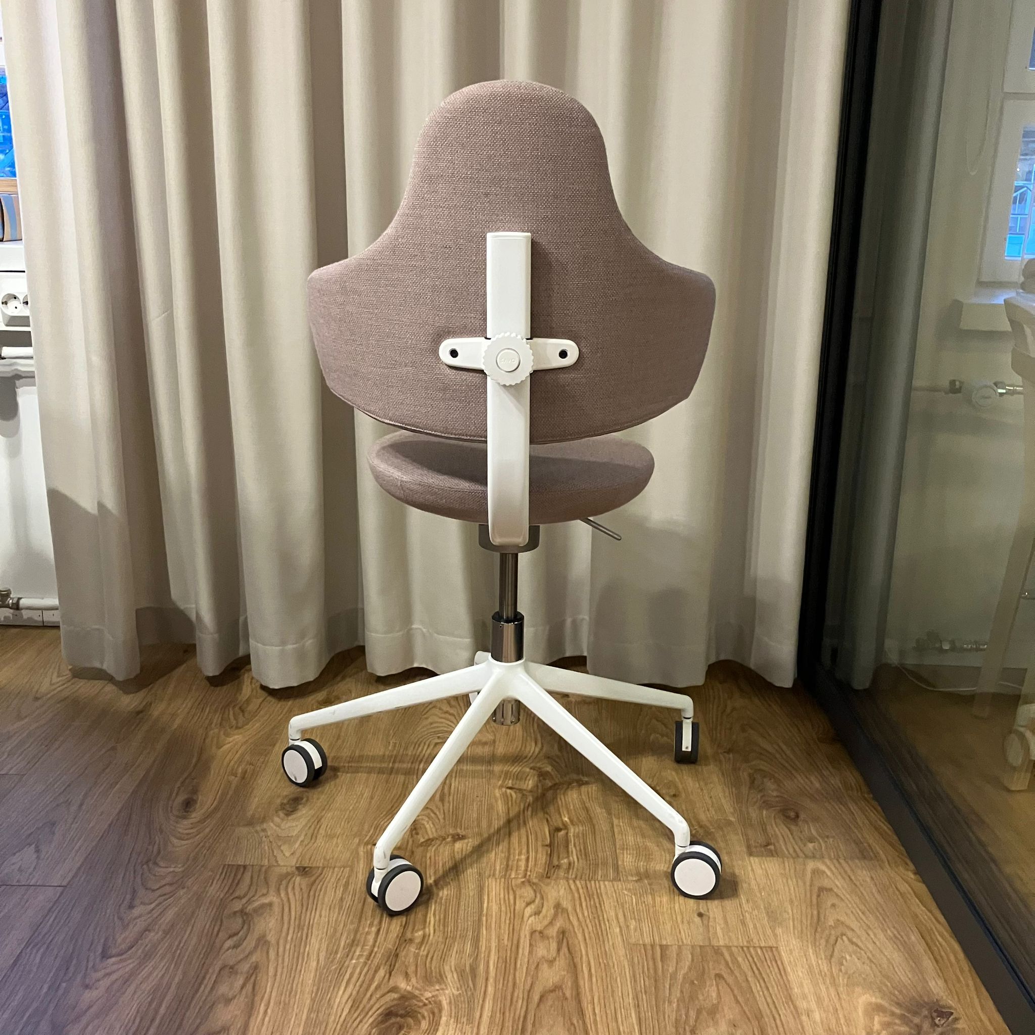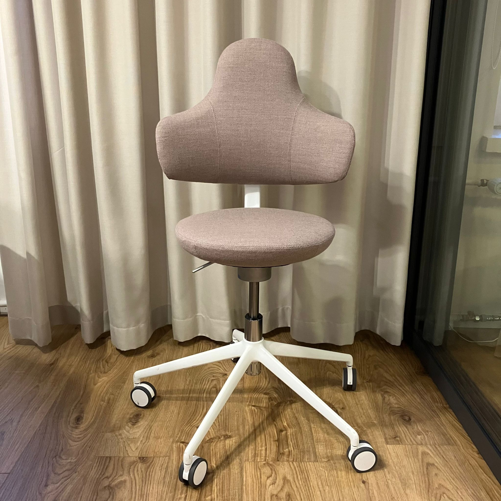 Sits och rygg i tyg (rosa). Kryssfot i metall (vit). Höj- och sänkbar.