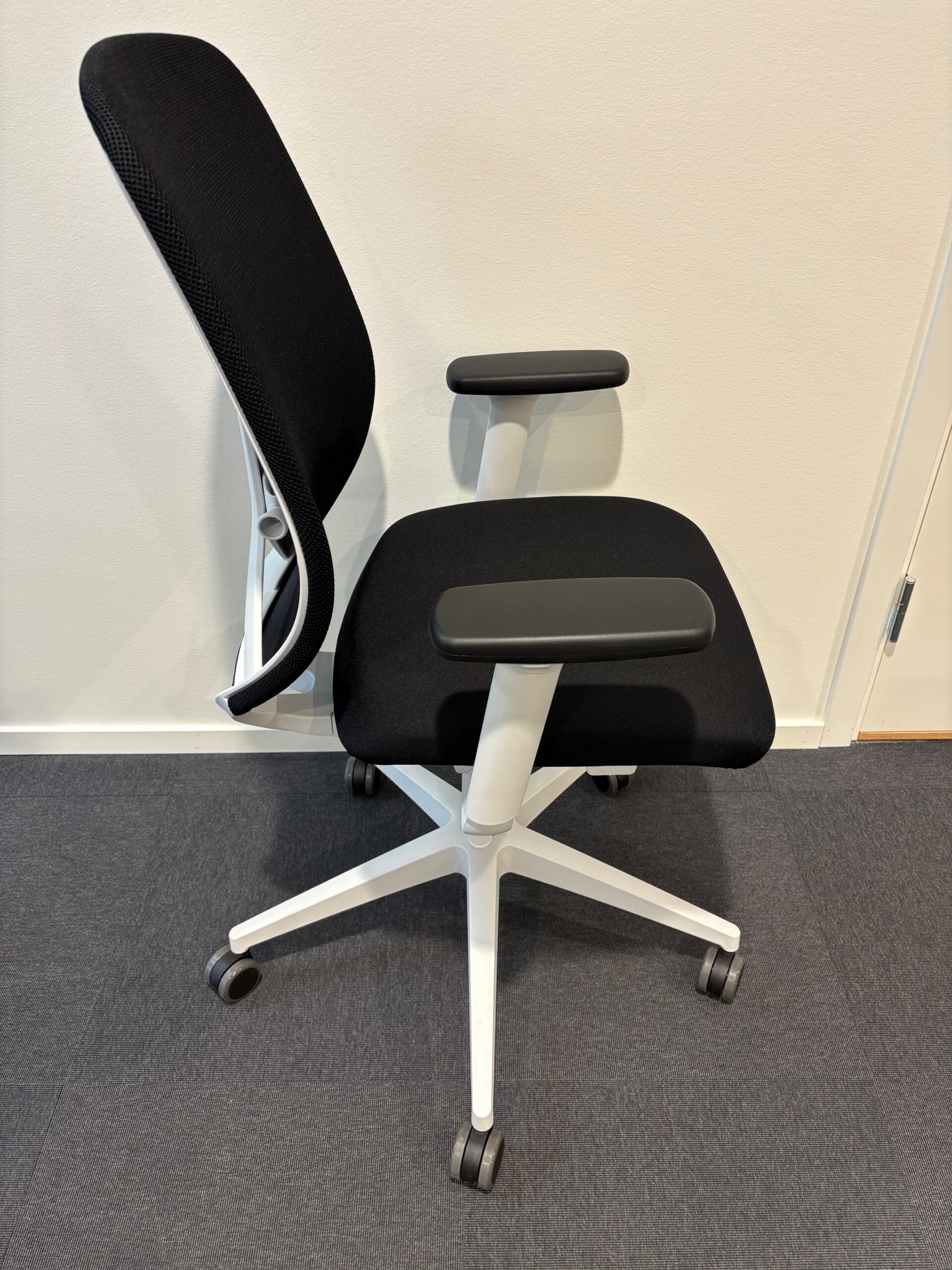 Sits i tyg (svart). Rygg i mesh (svart). Kryssfot i plast (vit). Höj- och sänkbar.