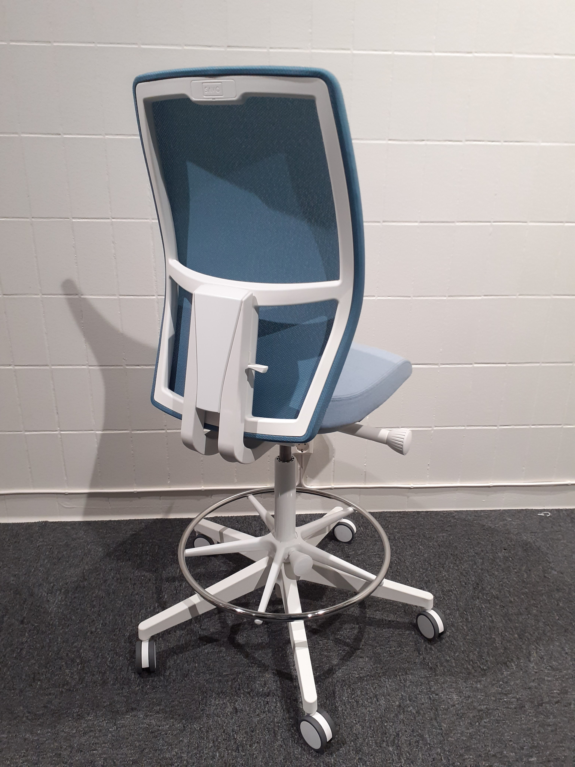 Sits i tyg (blå). Rygg i mesh (blå). Kryssfot i plast (vit). Höj- och sänkbar.