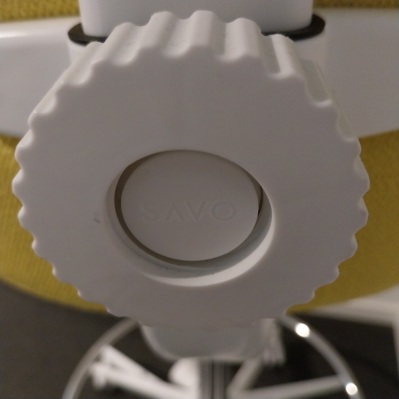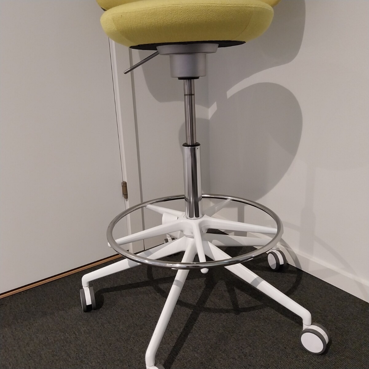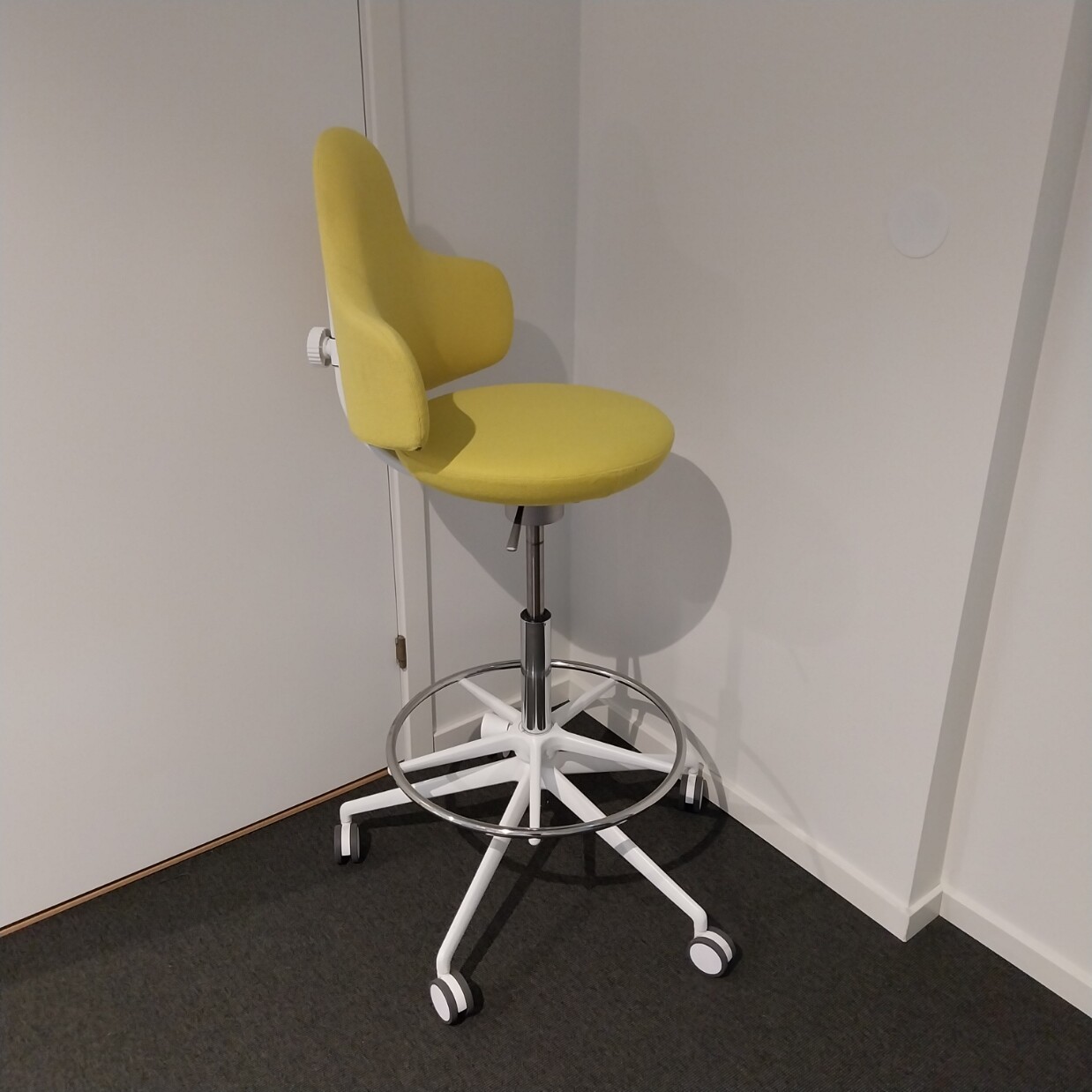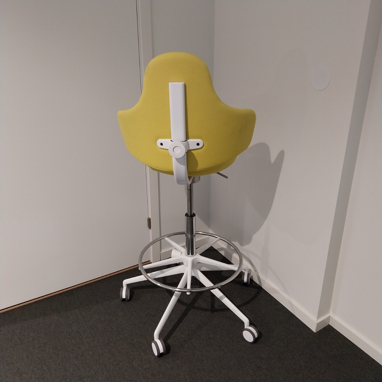 Sits och rygg i tyg (gul). Kryssfot i metall (vit). Höj- och sänkbar.