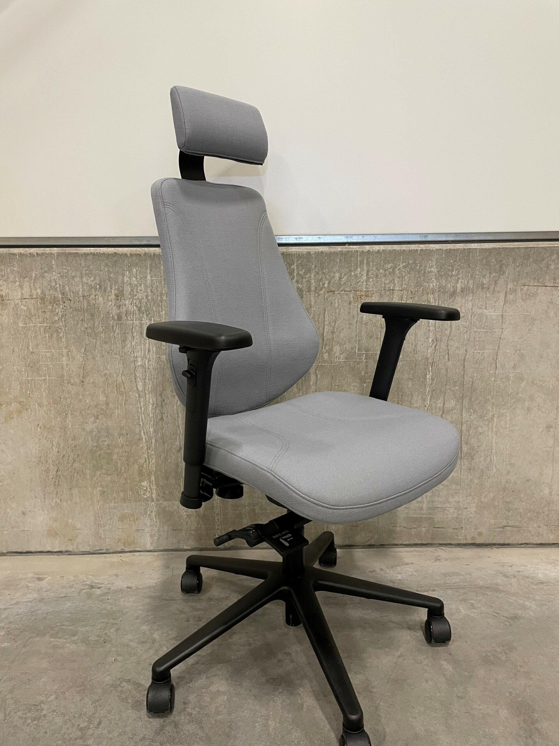 Sits och rygg i tyg (grå). Kryssfot i metall (svart). Höj- och sänkbar.