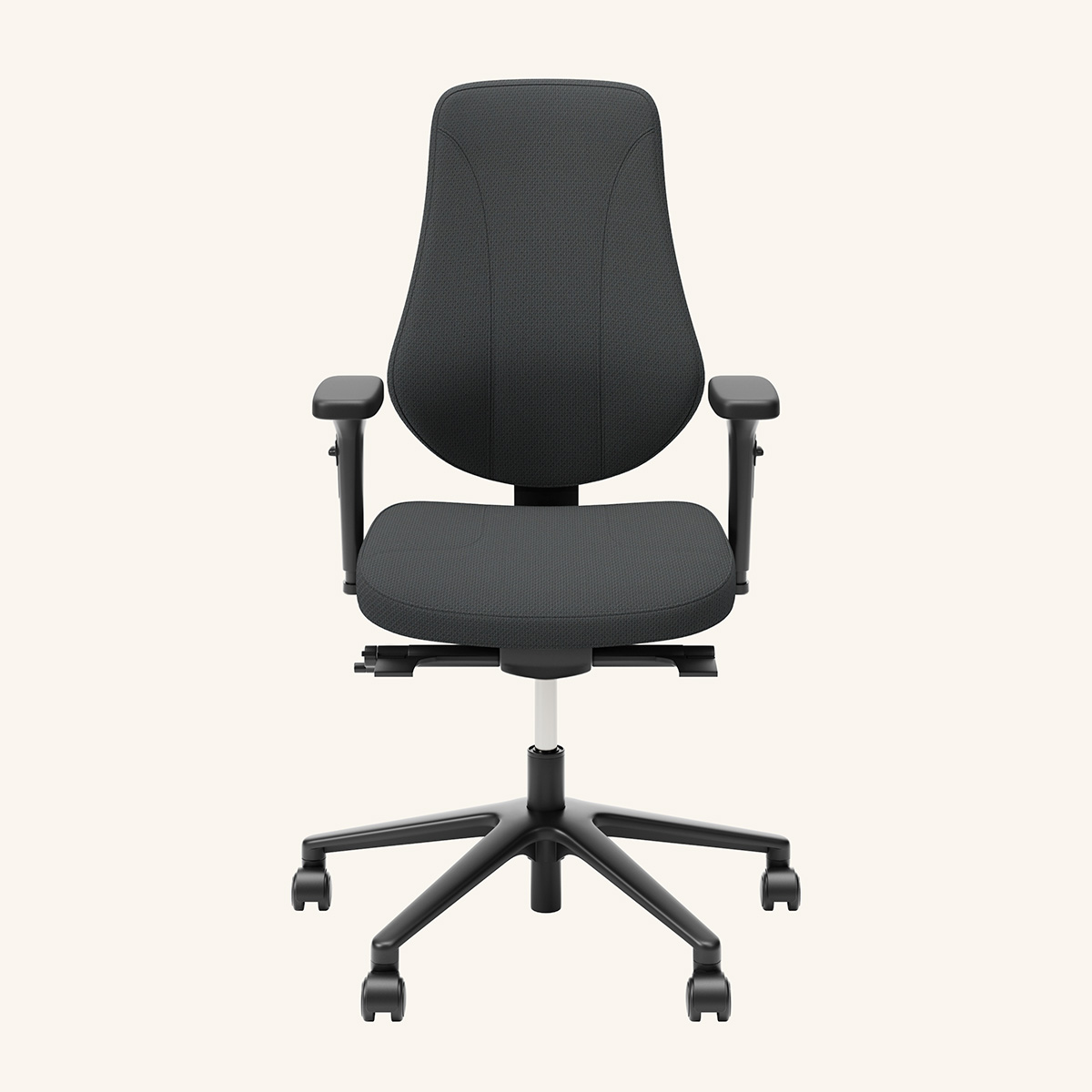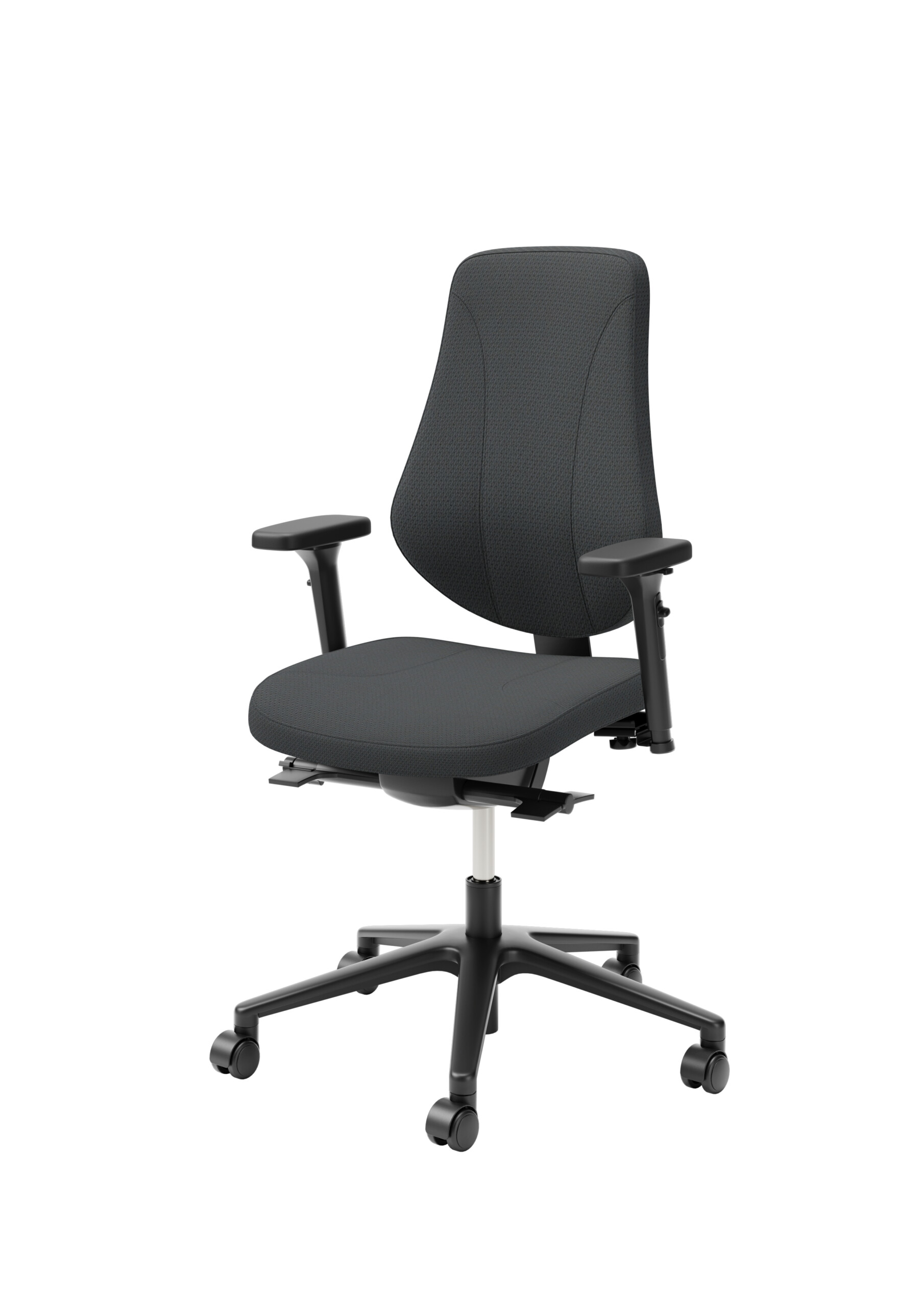 Sits och rygg i tyg (grå). Kryssfot i metall (svart). Höj- och sänkbar.