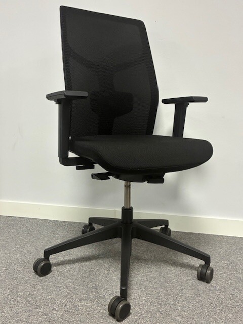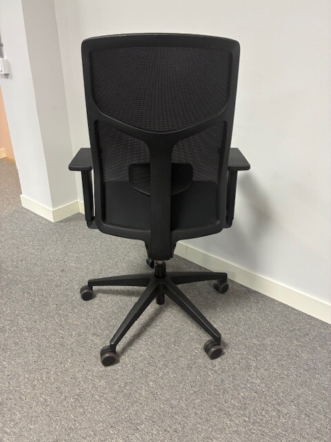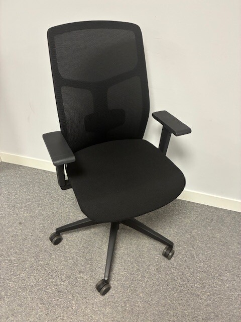 Sits i tyg (svart). Rygg i mesh (svart). Kryssfot i plast (svart). Höj- och sänkbar.