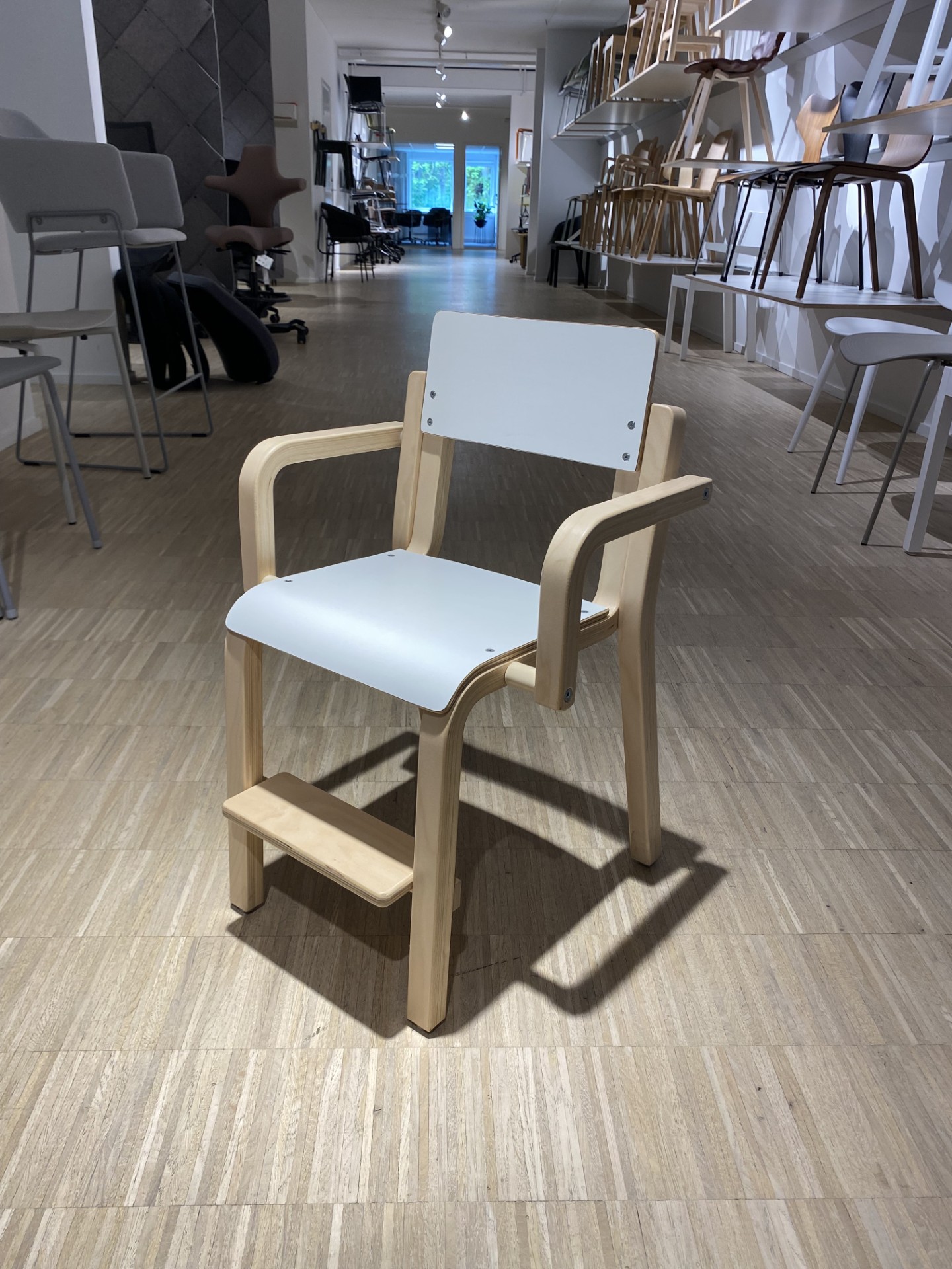 Sits och rygg i laminat (vit). Ben i trä (björk).