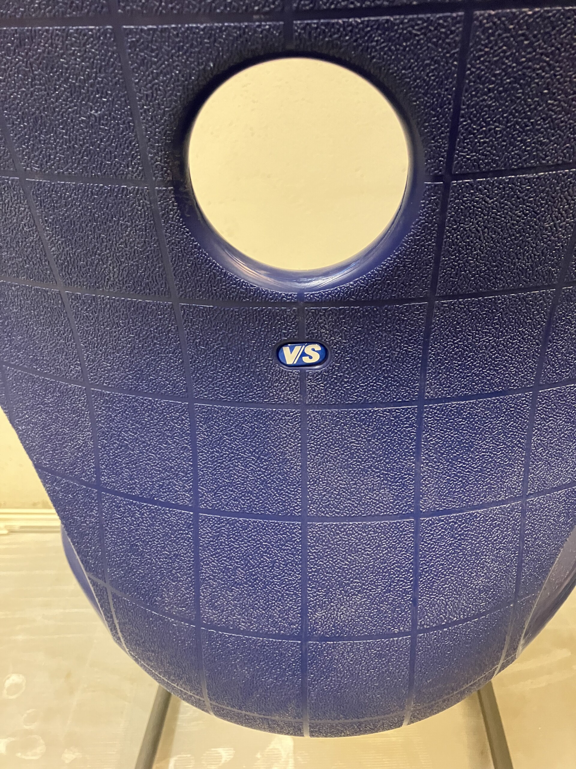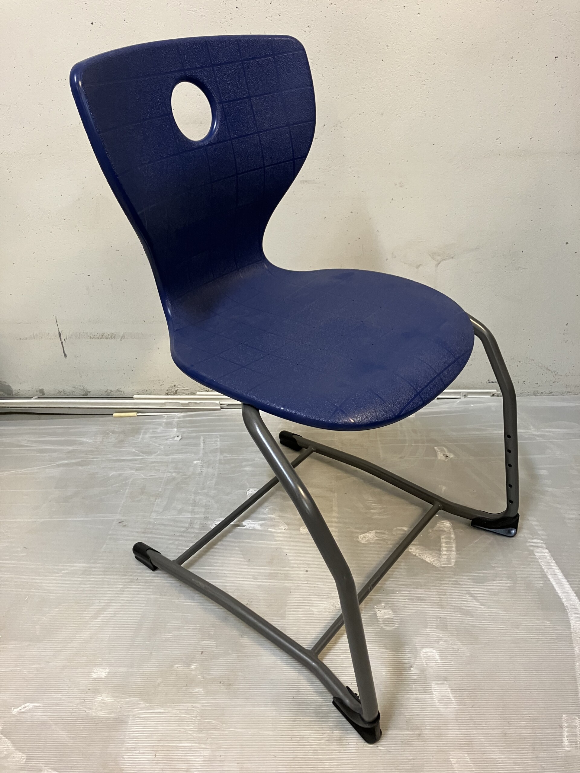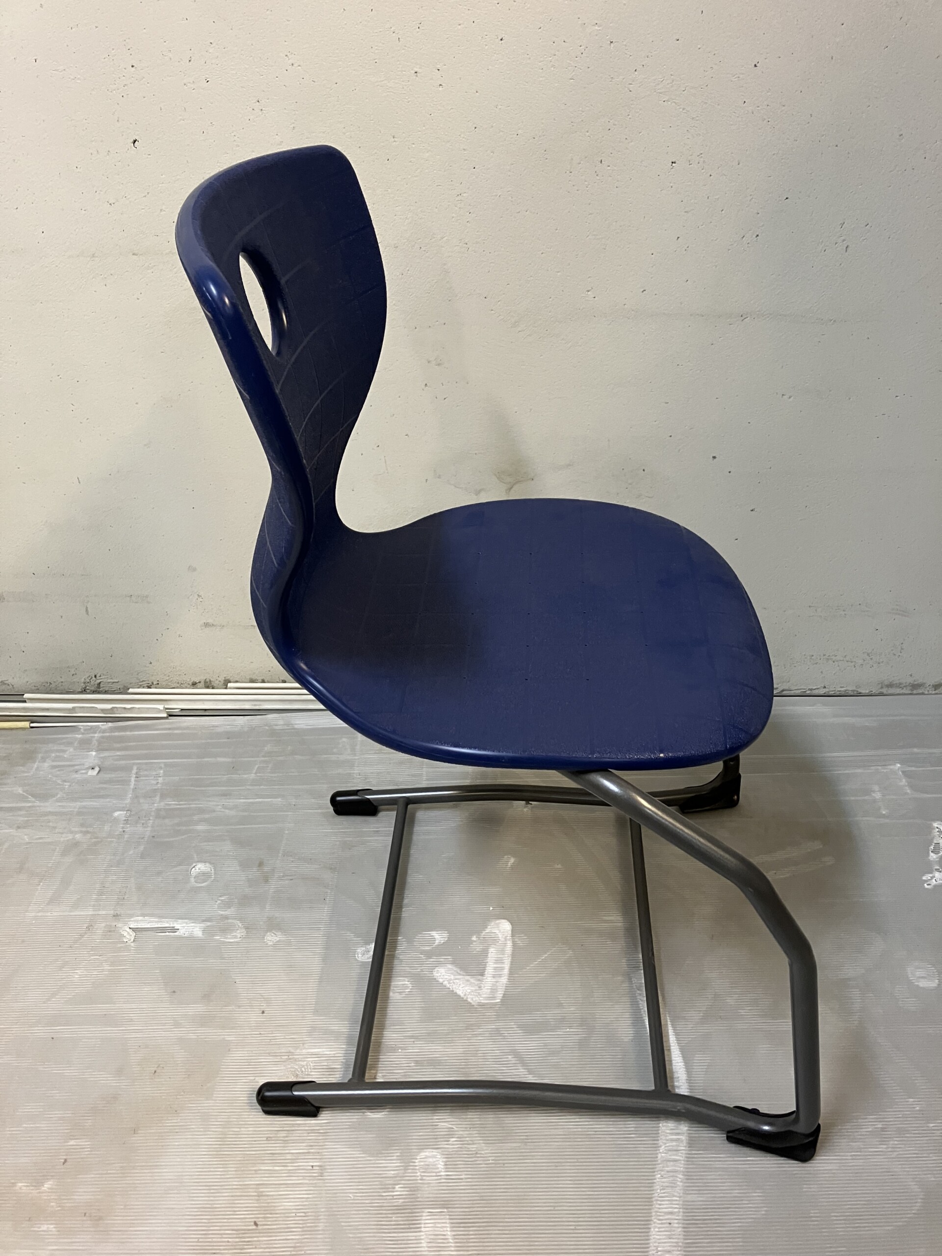Sits och rygg i plast (blå). Medstativ i metall (grå).