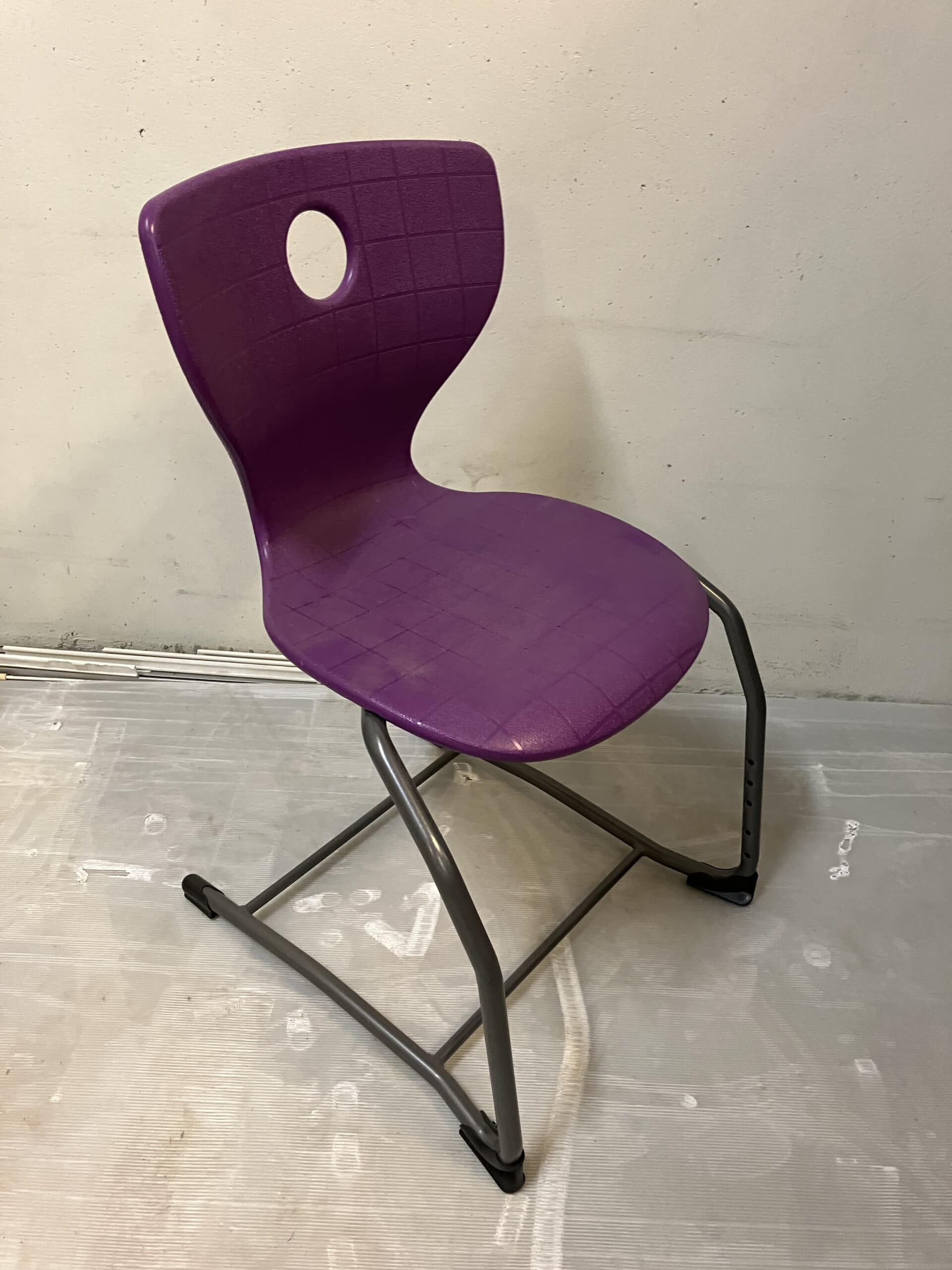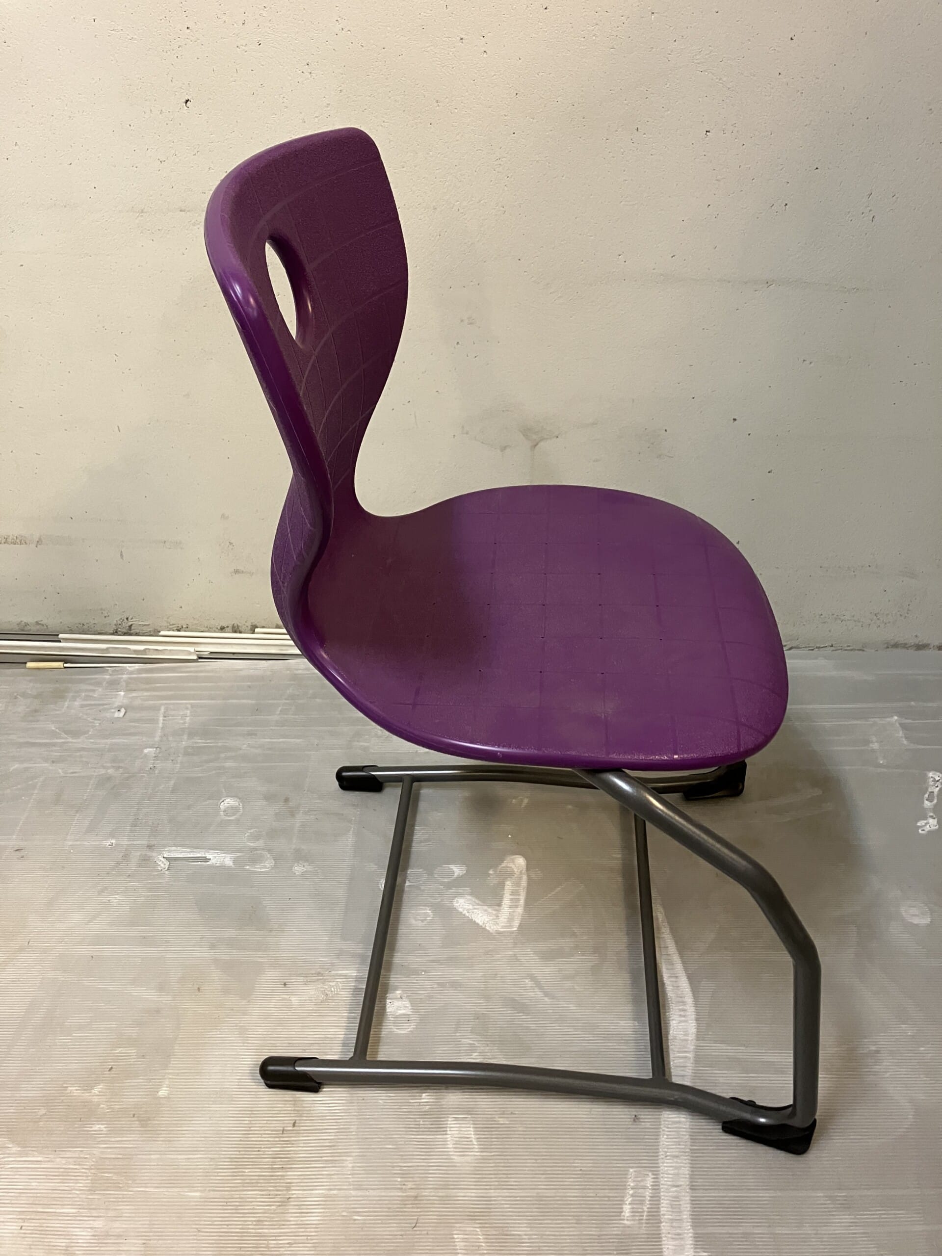 Sits och rygg i plast (lila). Medstativ i metall (grå).