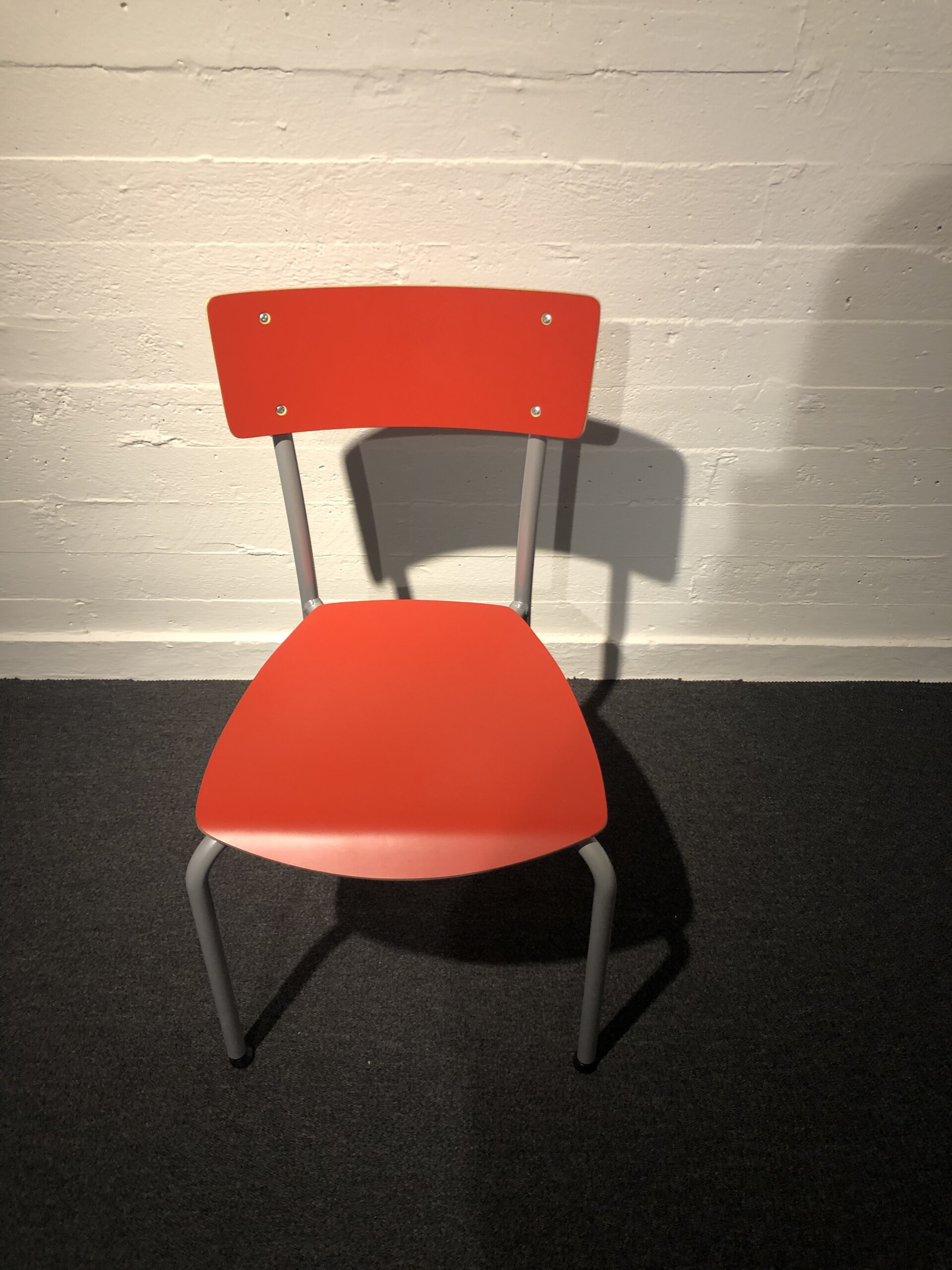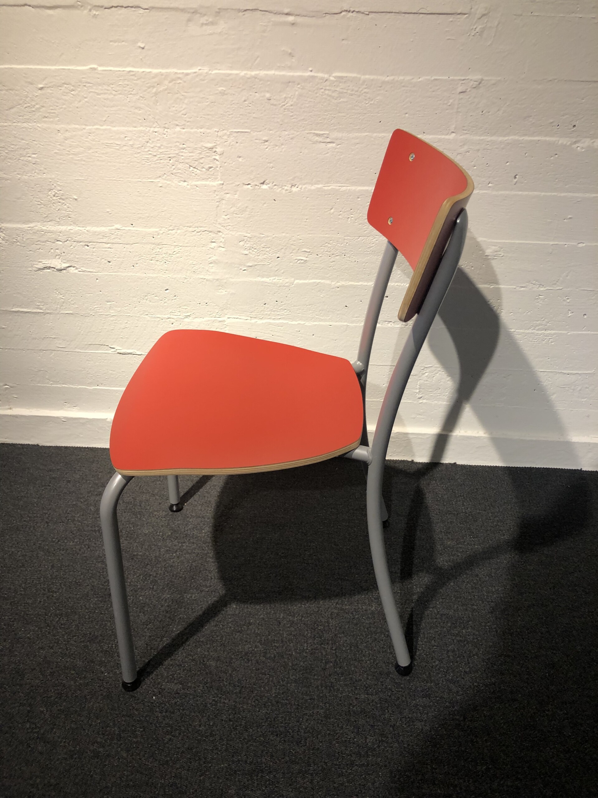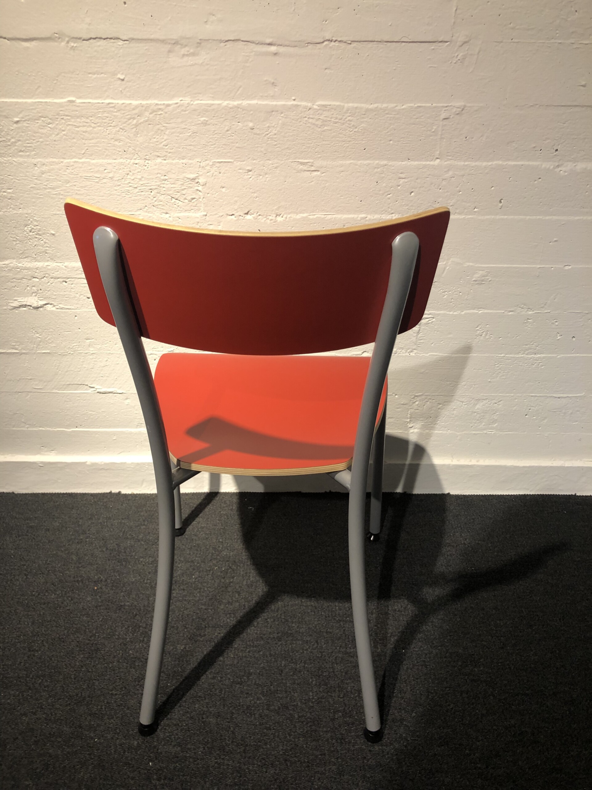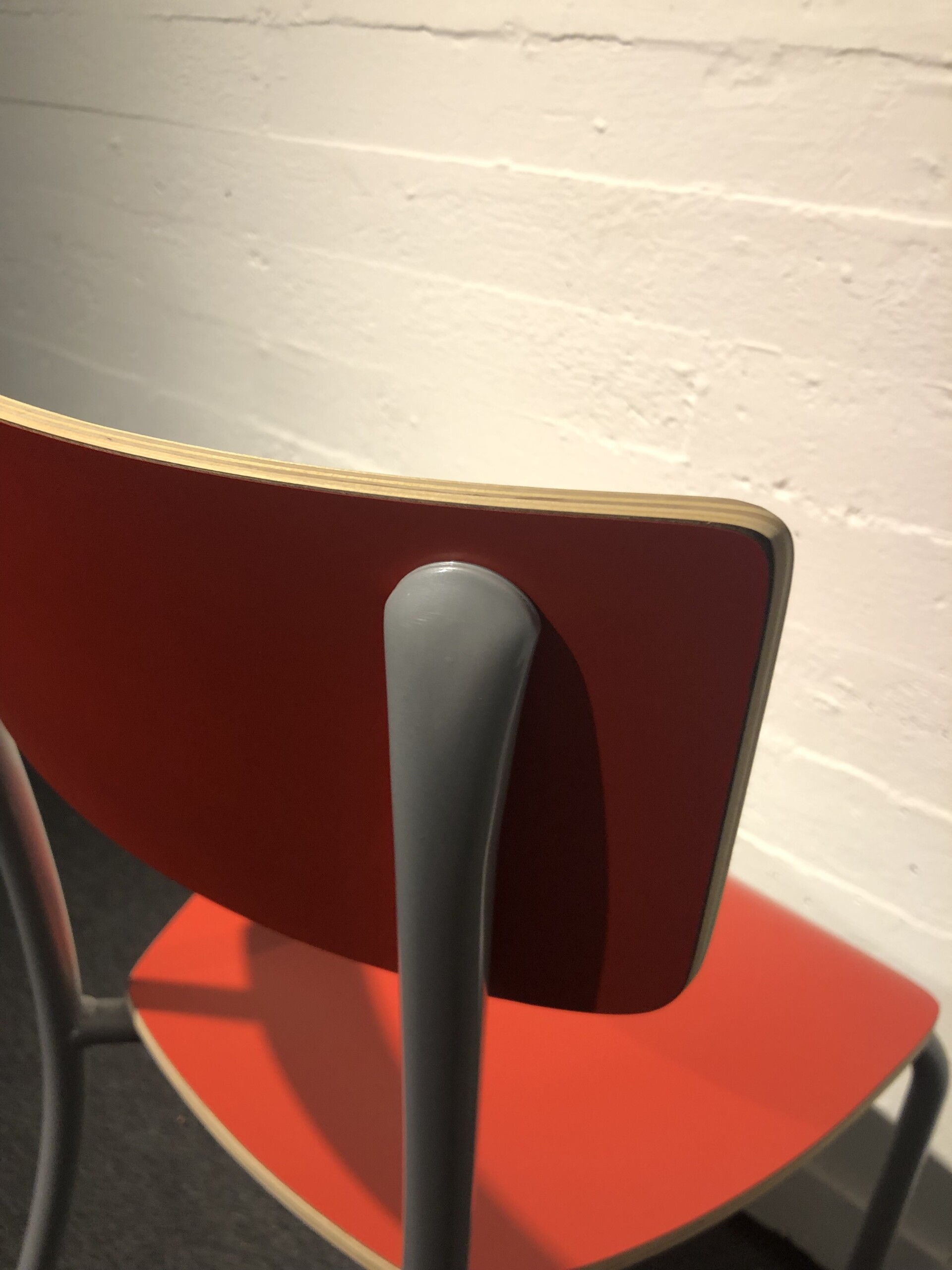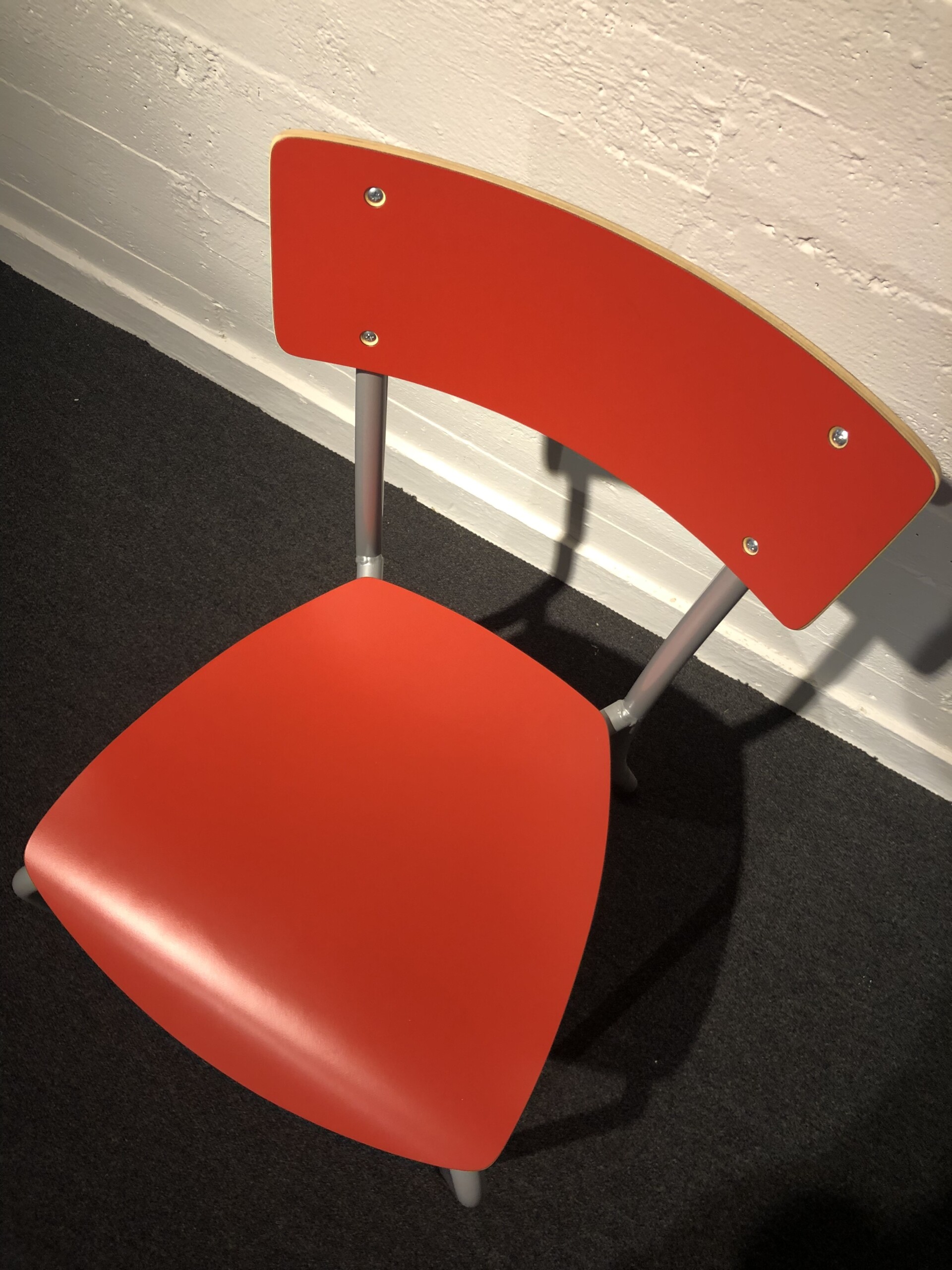 Sits och rygg i laminat (röd). Ben i metall (grå).