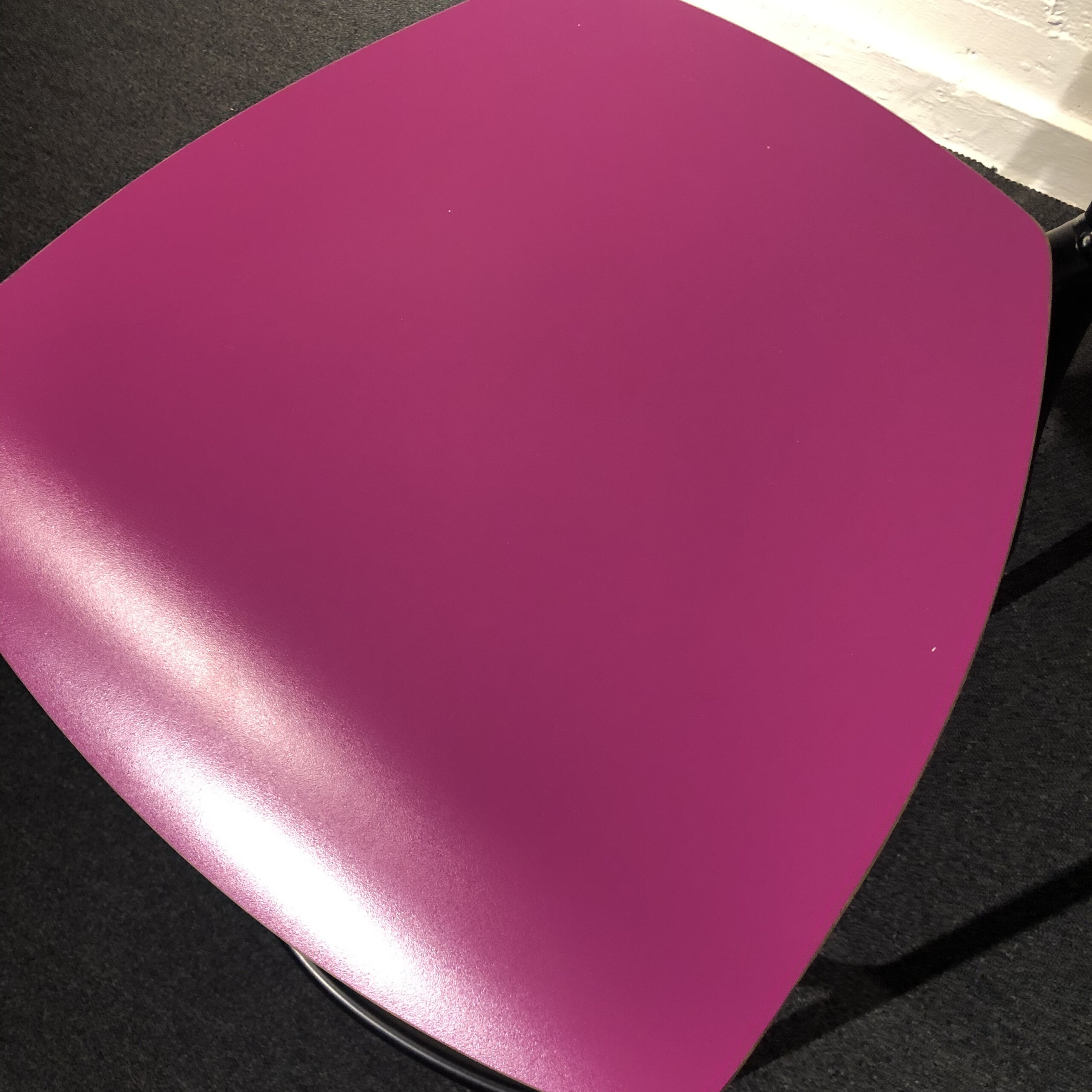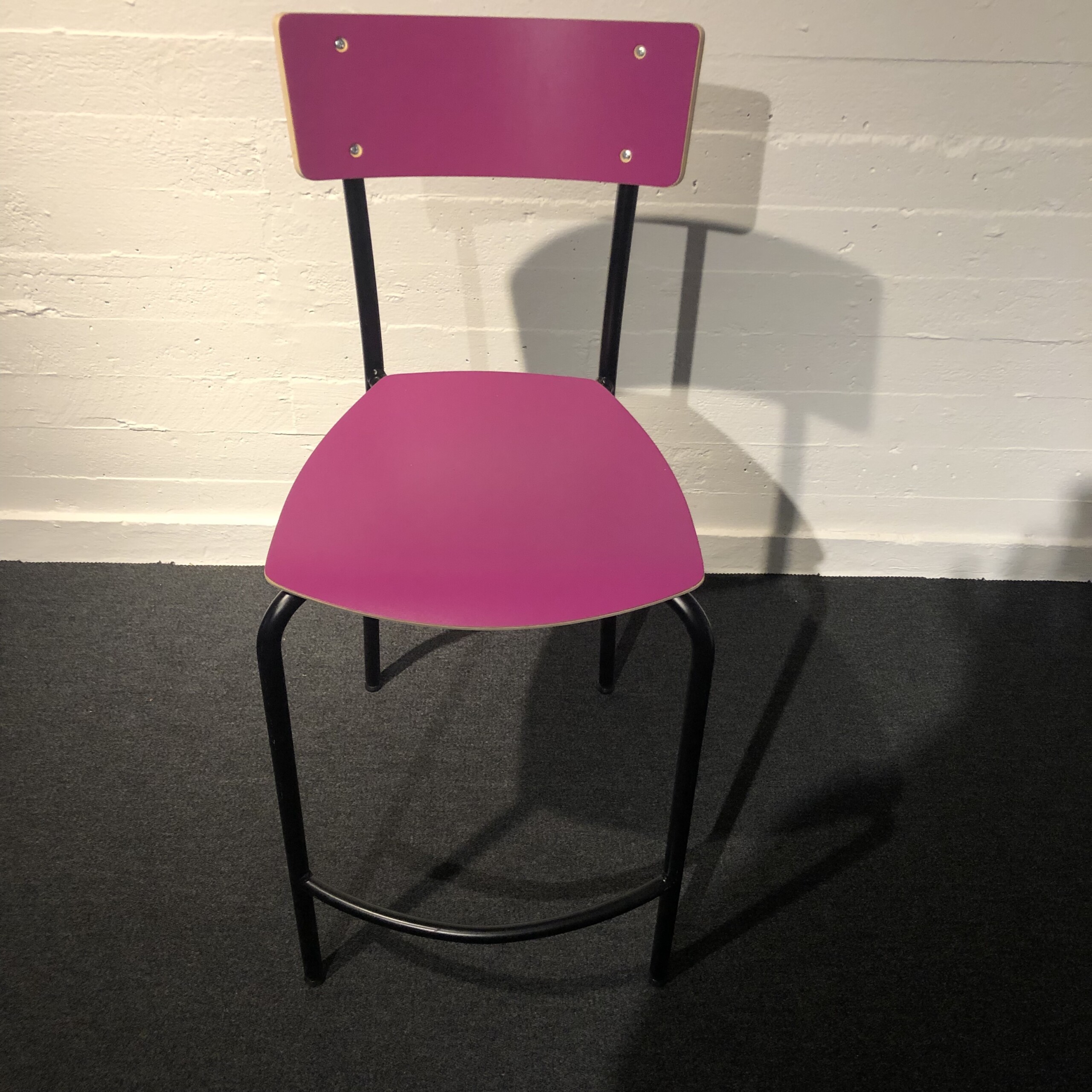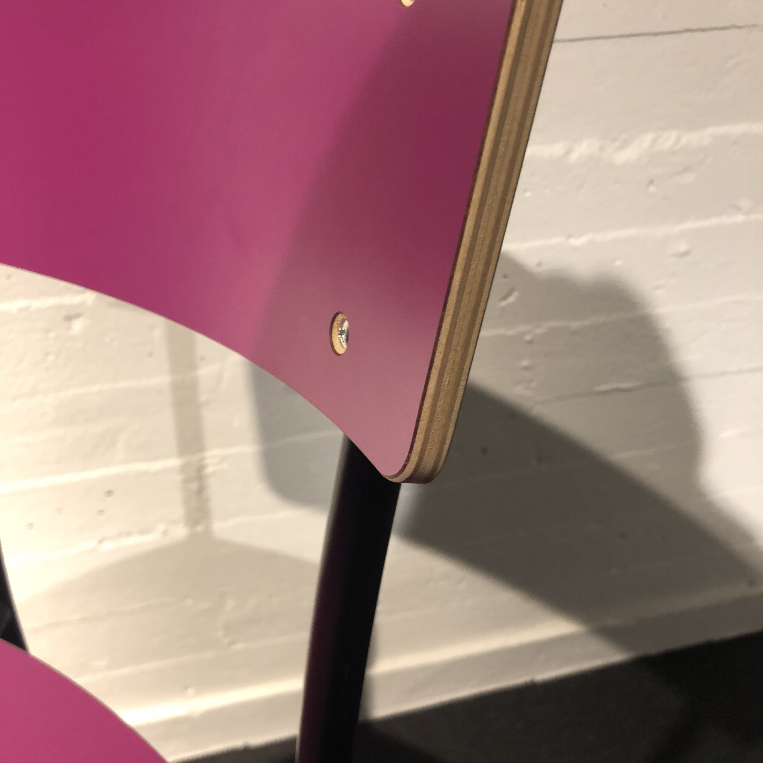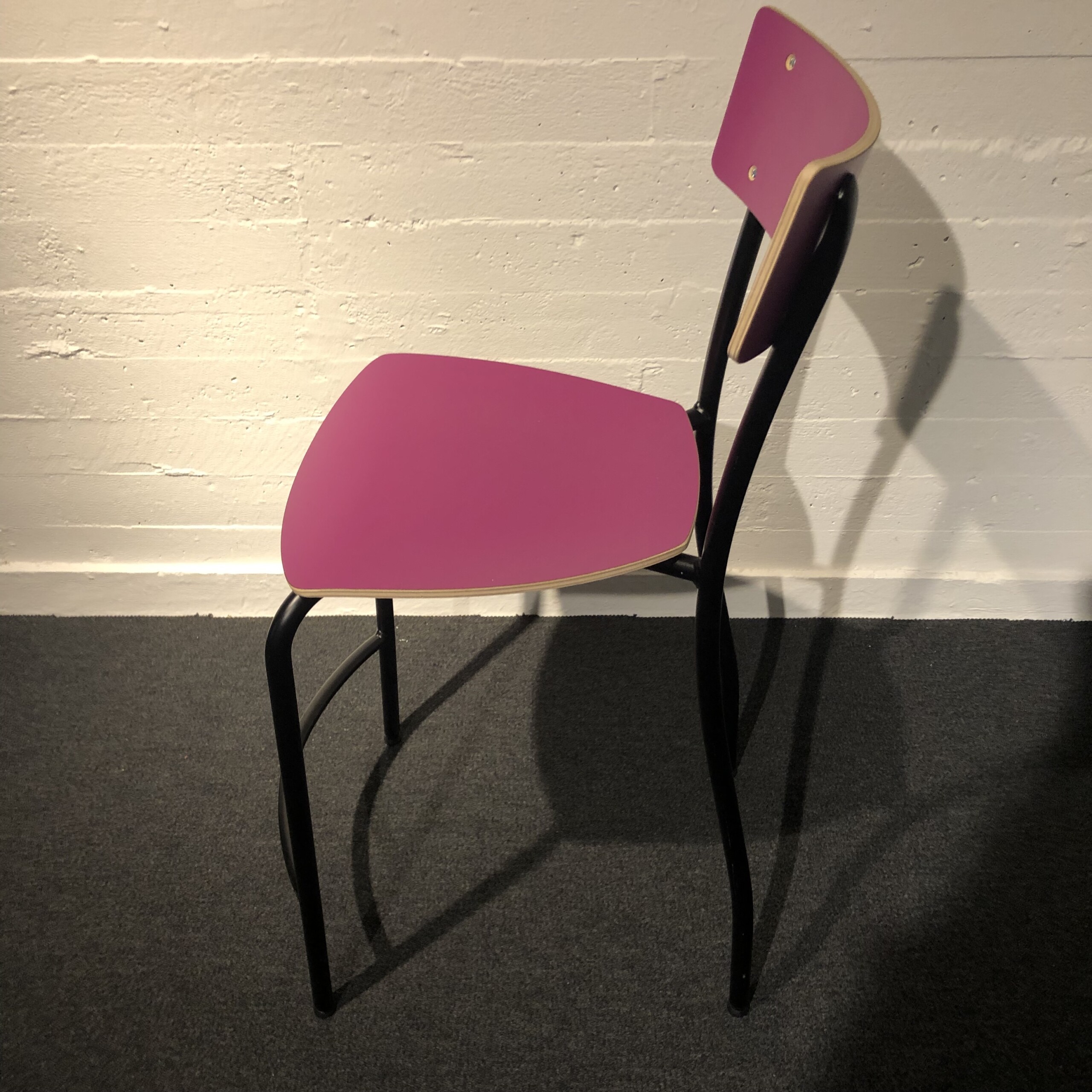 Sits och rygg i laminat (rosa). Ben i metall (svart).