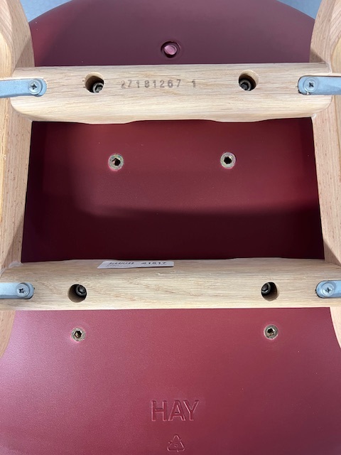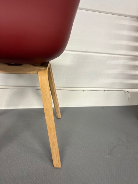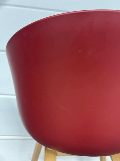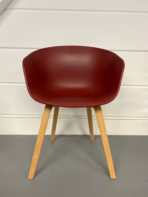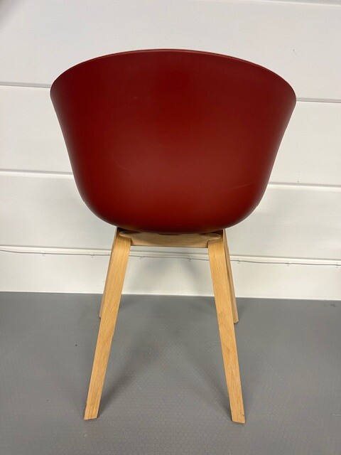 Sits och rygg i plast (röd). Ben i trä (ek).