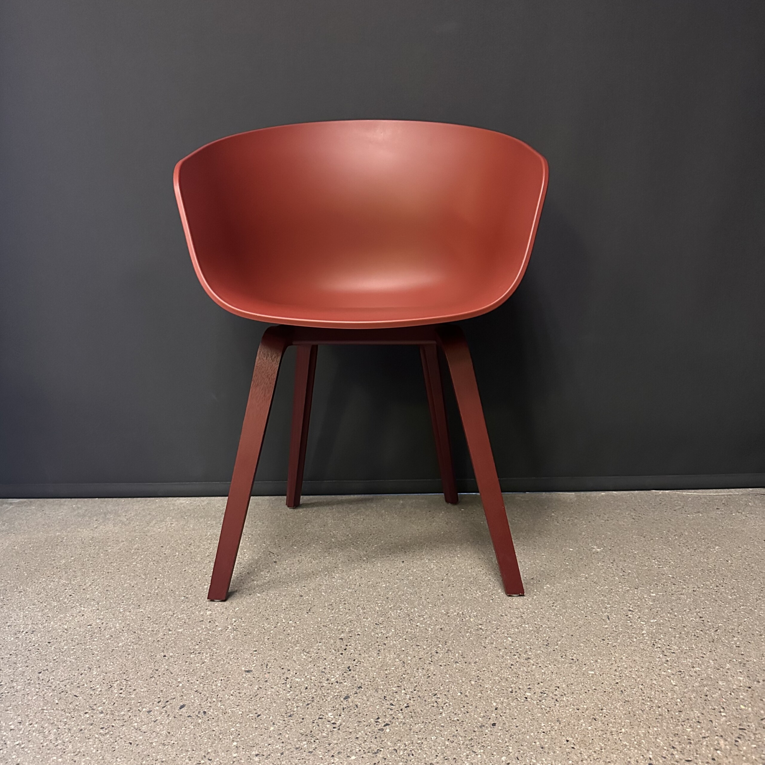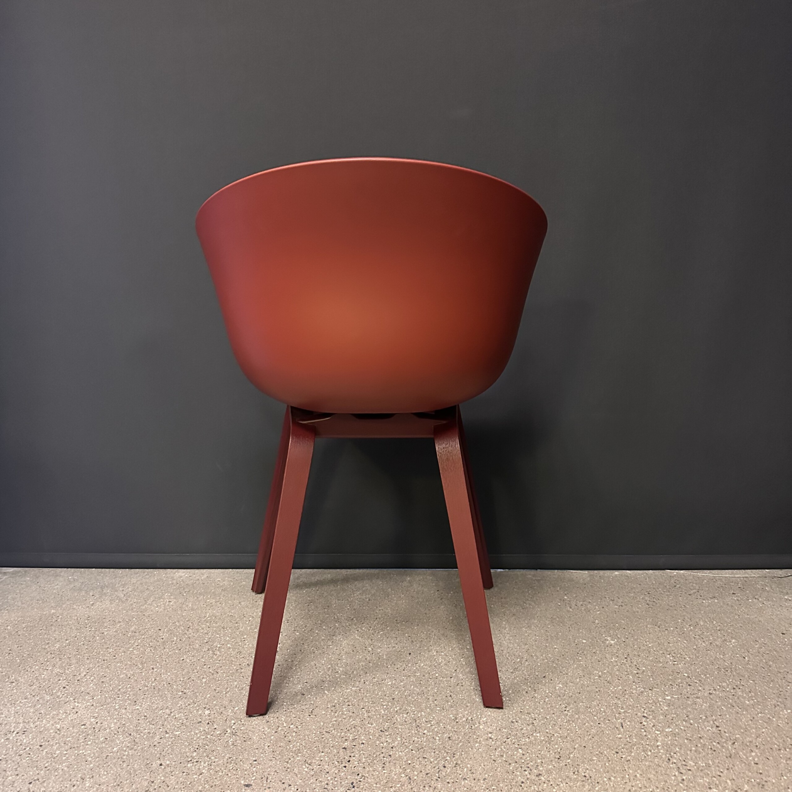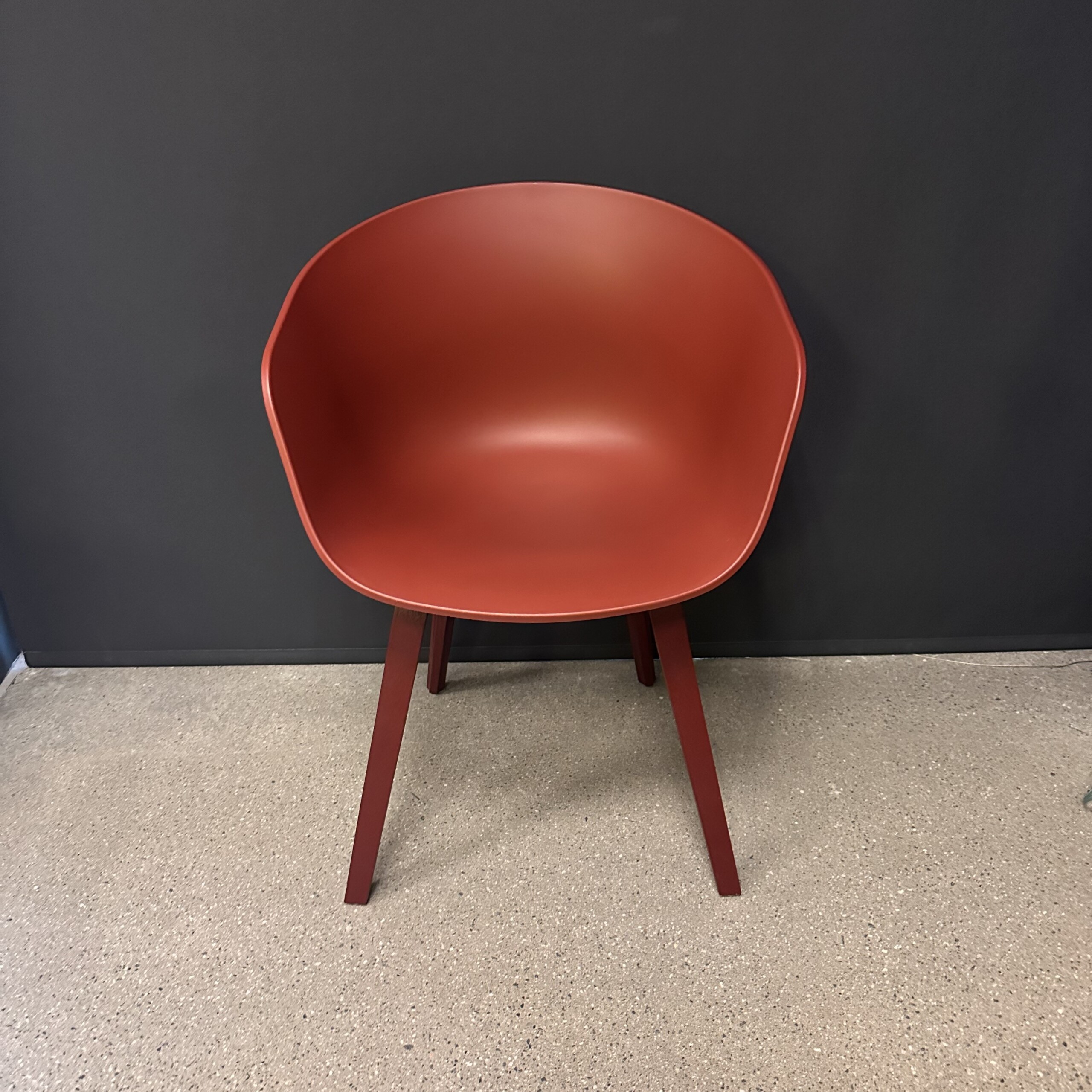 Sits och rygg i plast (röd). Ben i trä (röd).