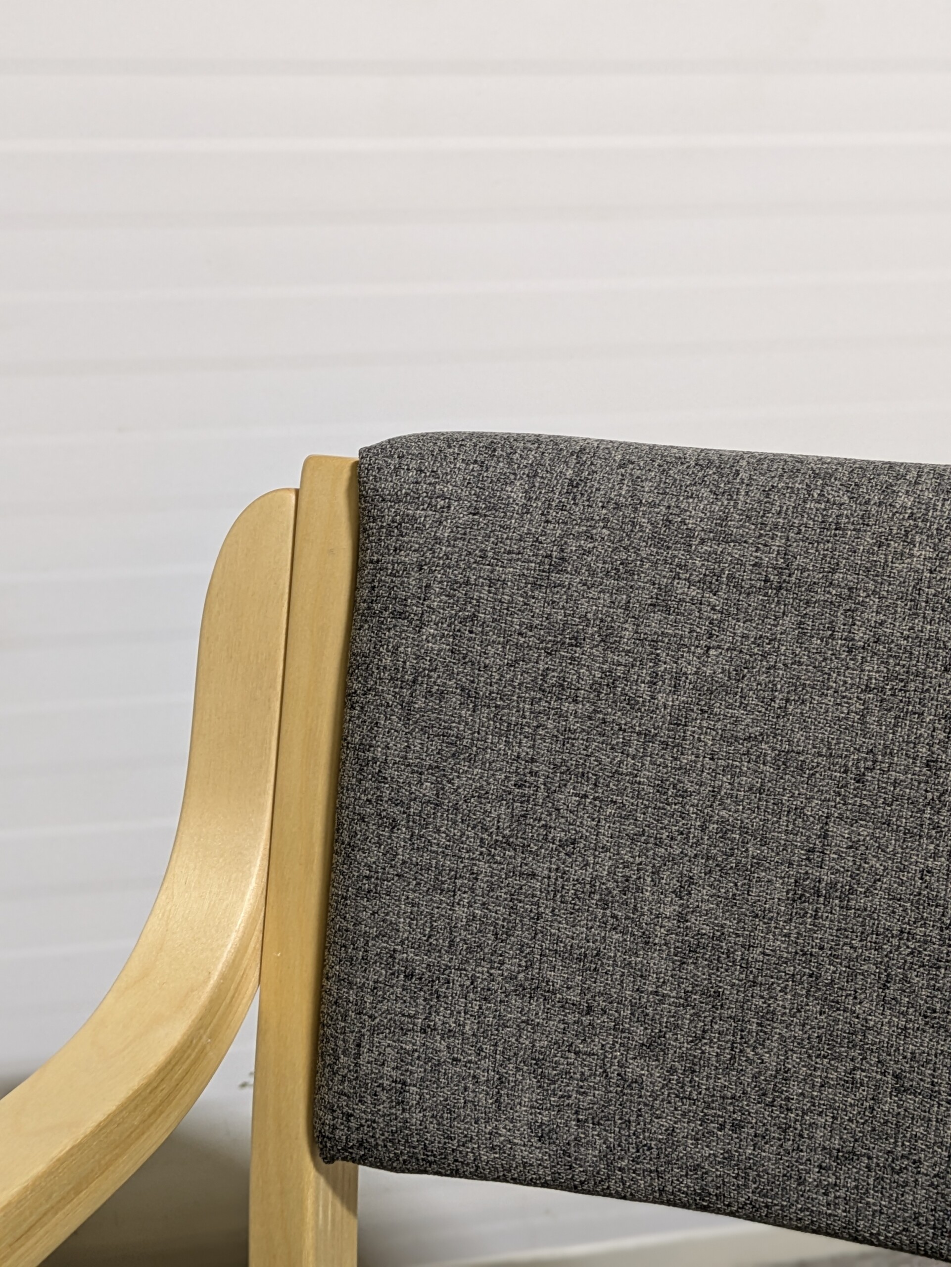 Sits och rygg i tyg (grå). Ben i trä (björk).