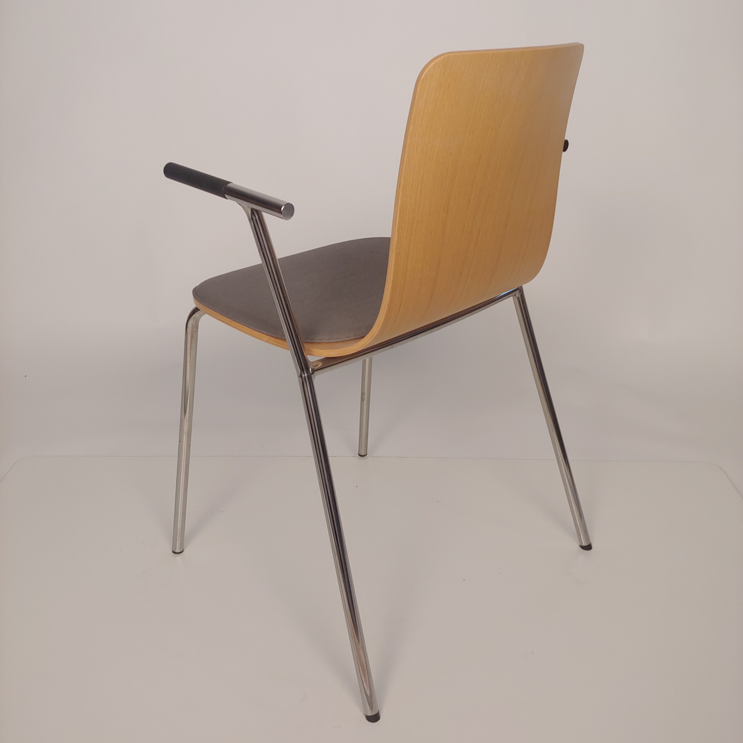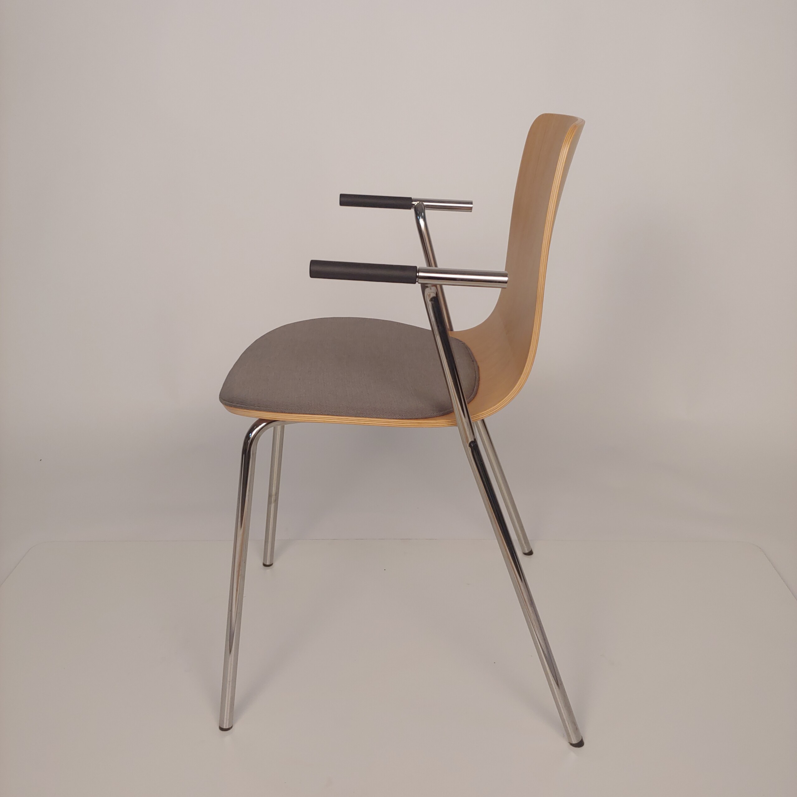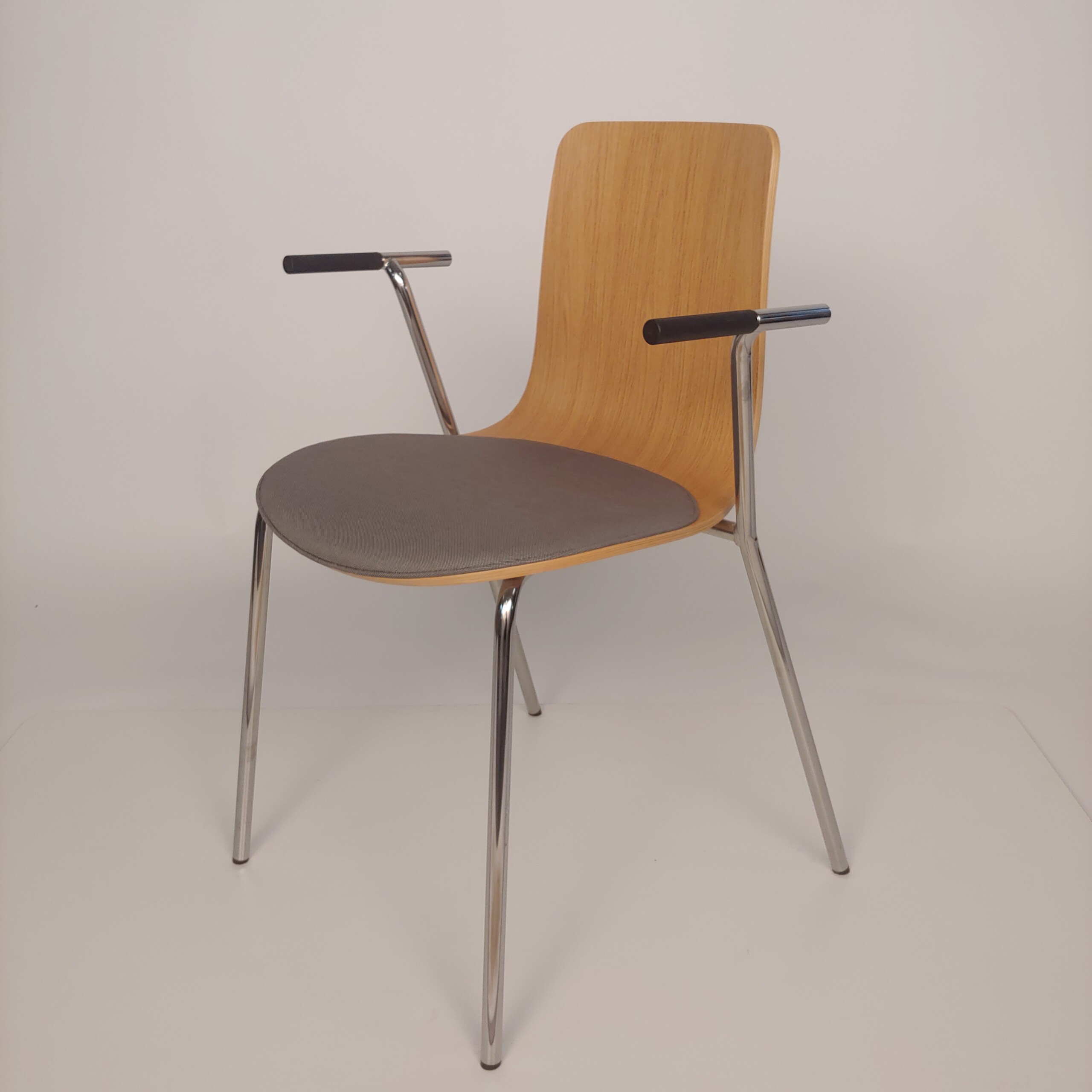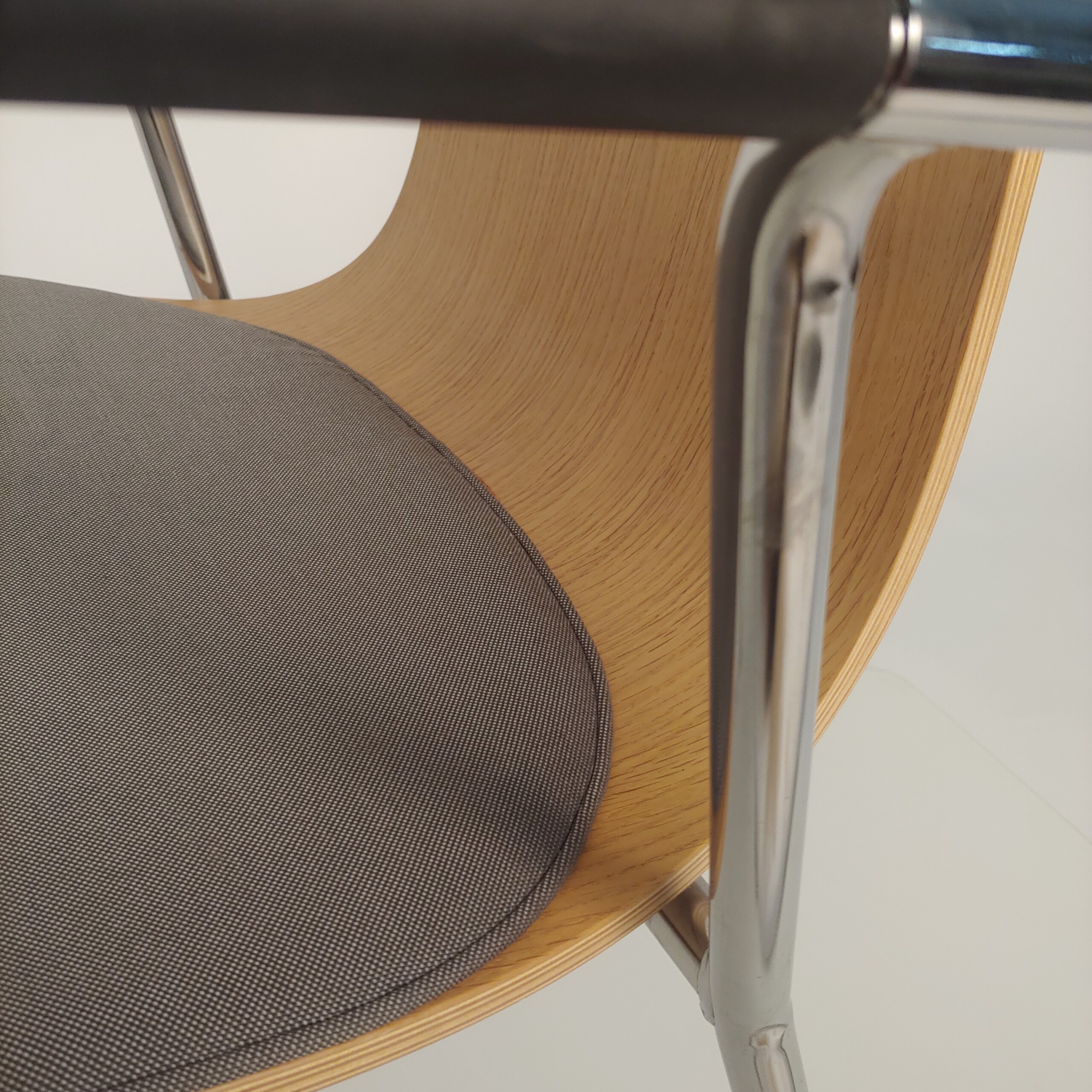 Sits i tyg (grå). Rygg i trä (ek). Ben i metall (krom).