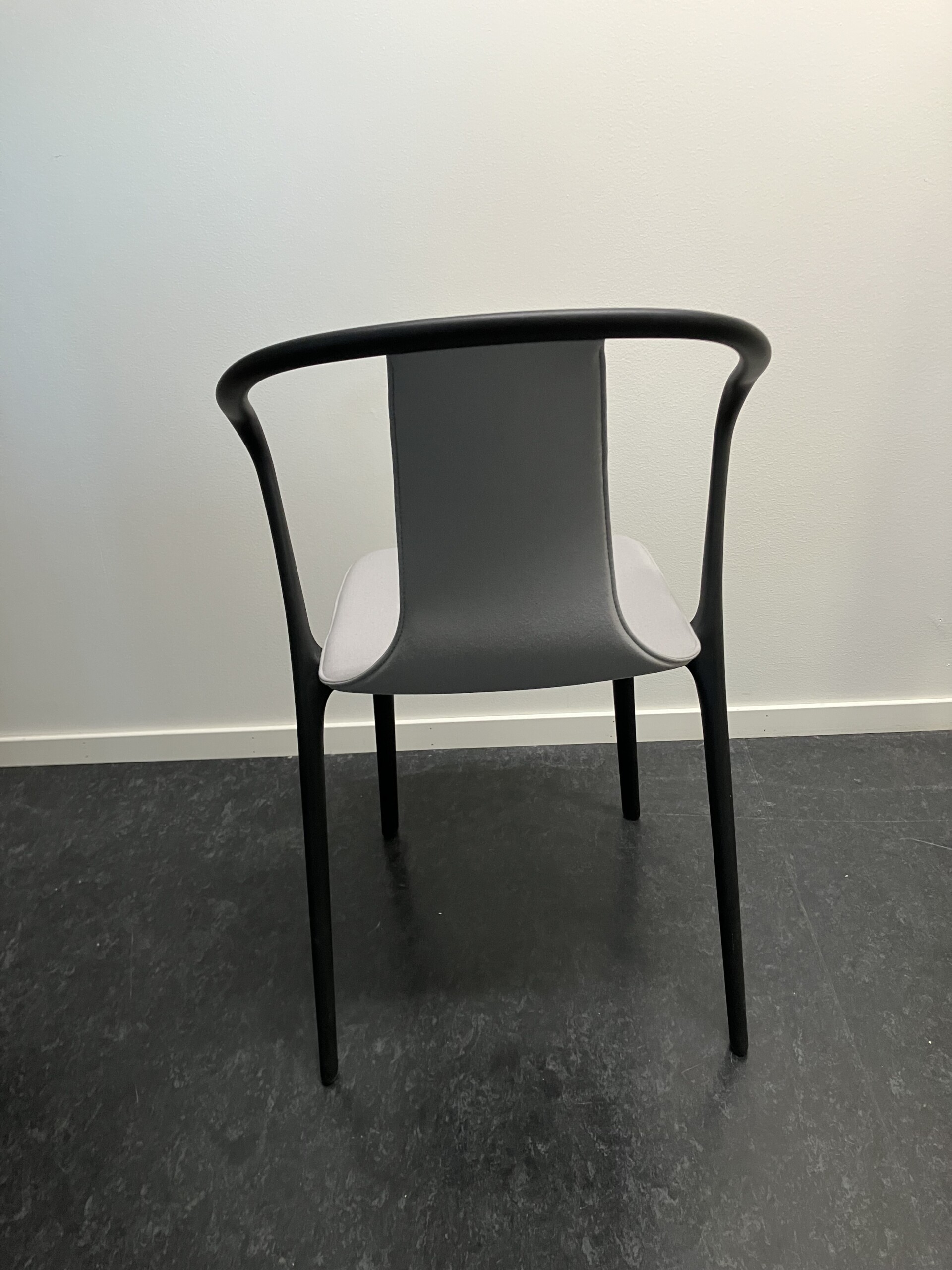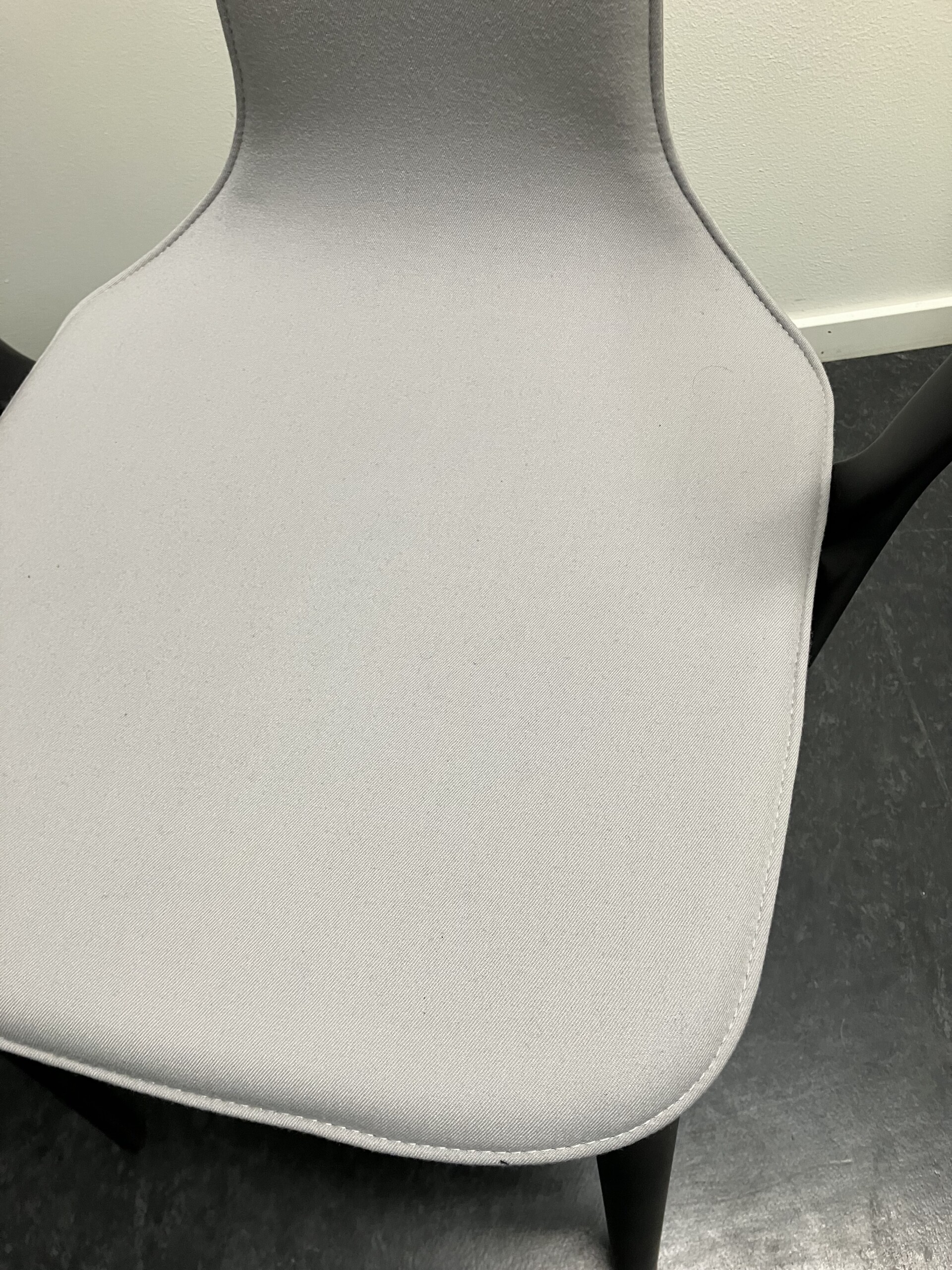 Sits och rygg i tyg (grå). Ben i plast (svart).