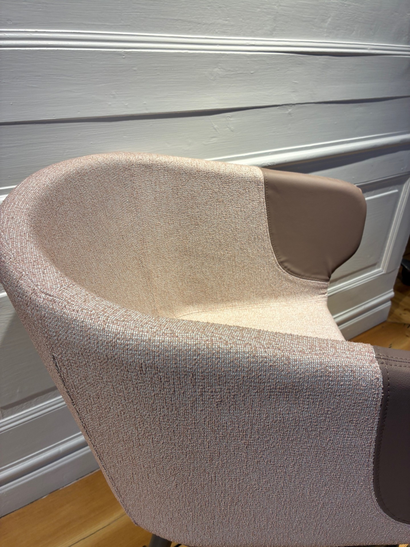Sits och rygg i tyg (rosa). Ben i metall (blå).