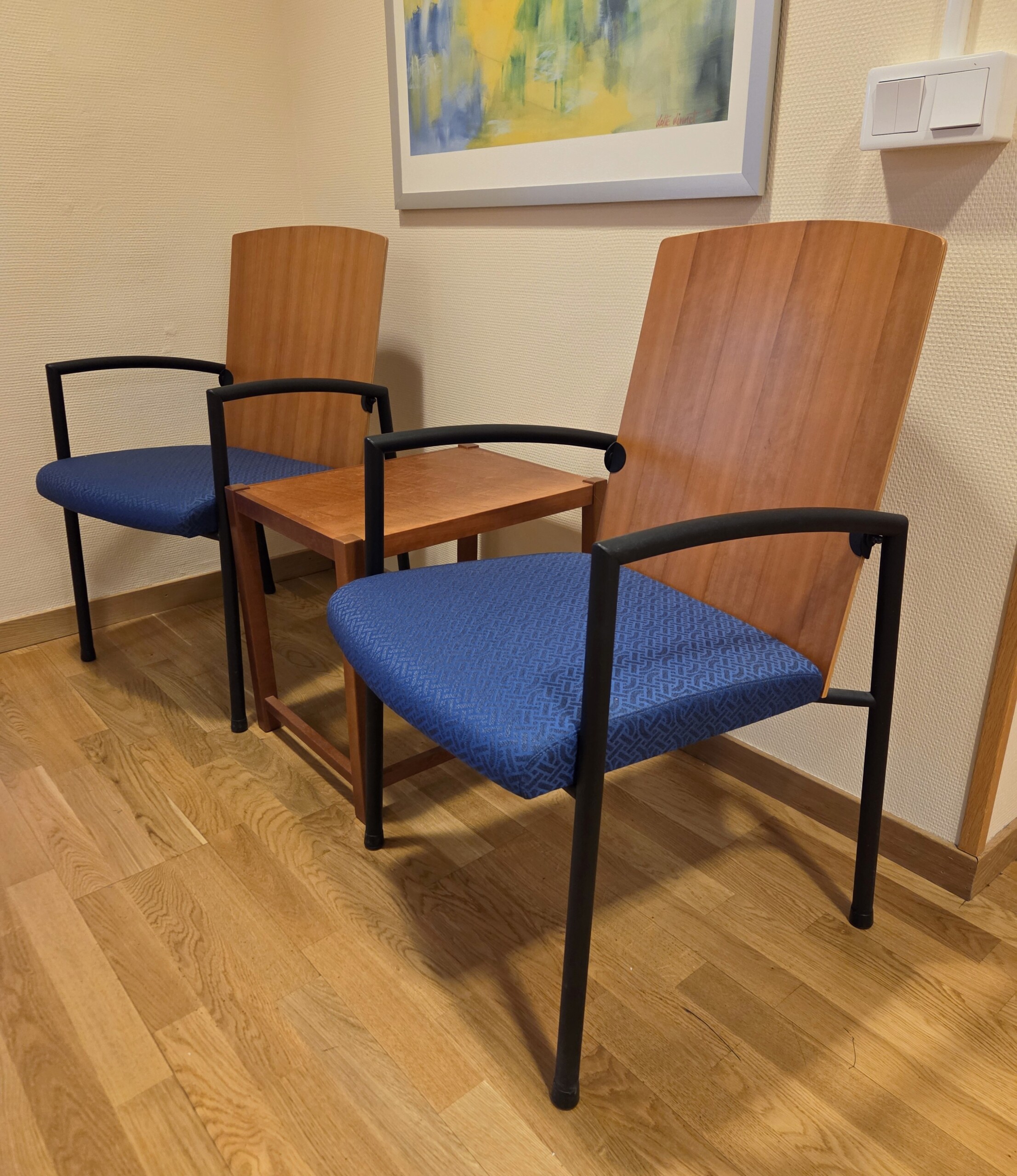Sits i tyg (blå). Rygg i trä. Ben i metall (svart).