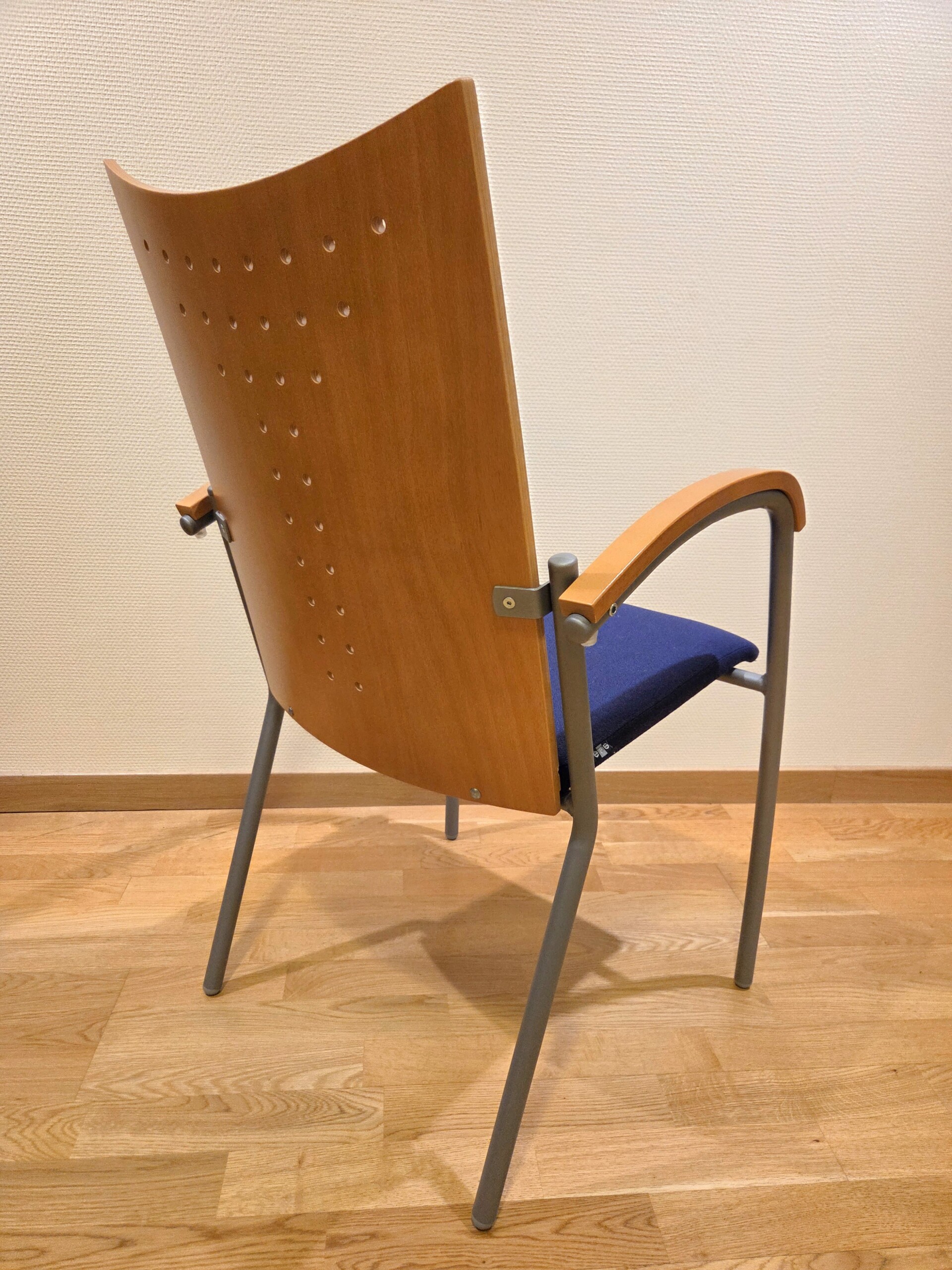 Sits i tyg (blå). Rygg i laminat. Ben i metall (grå).