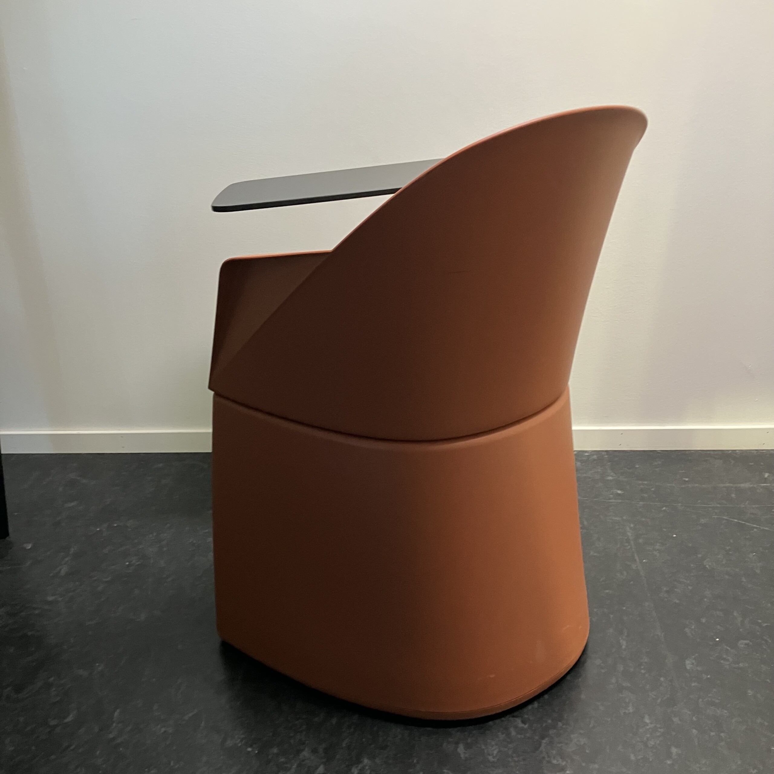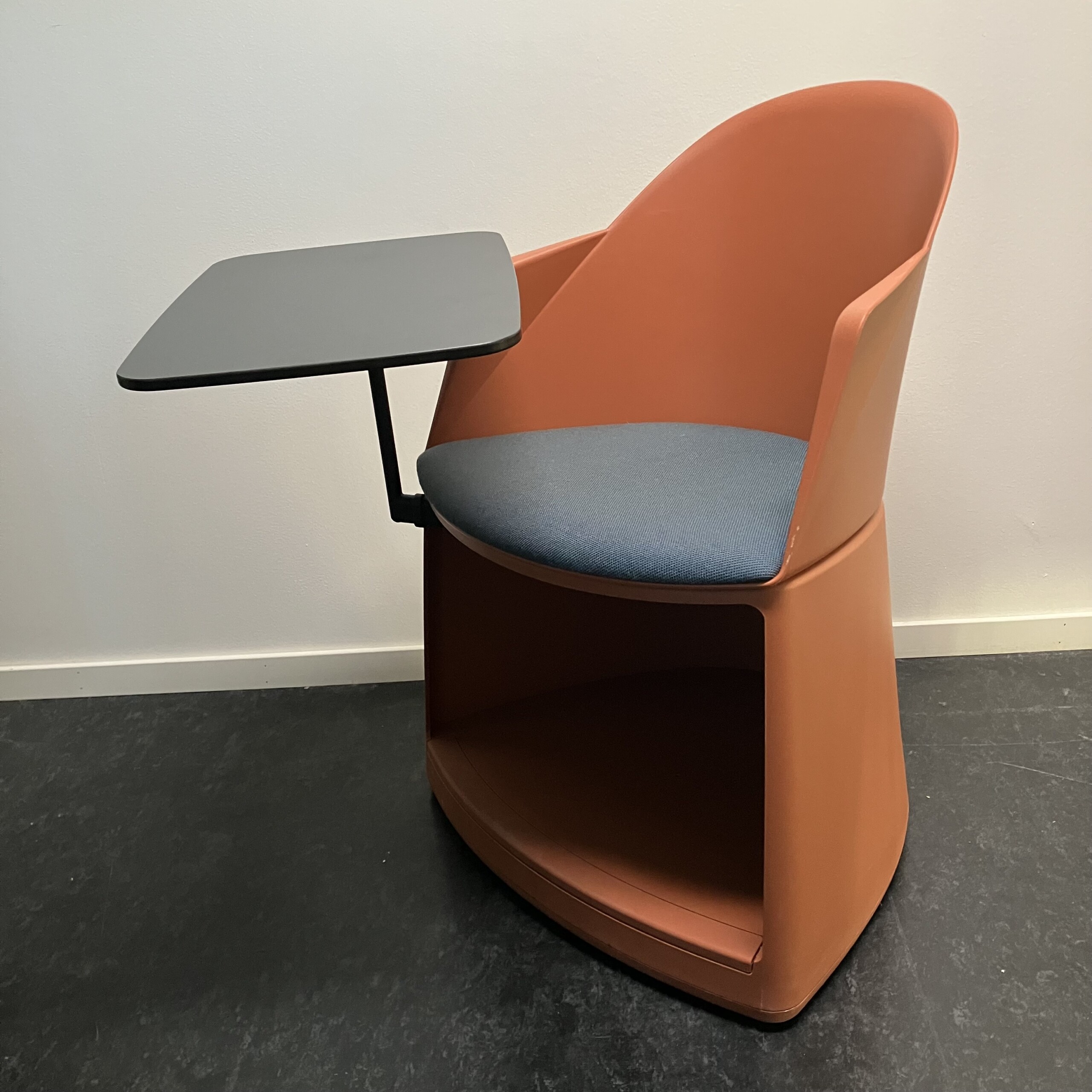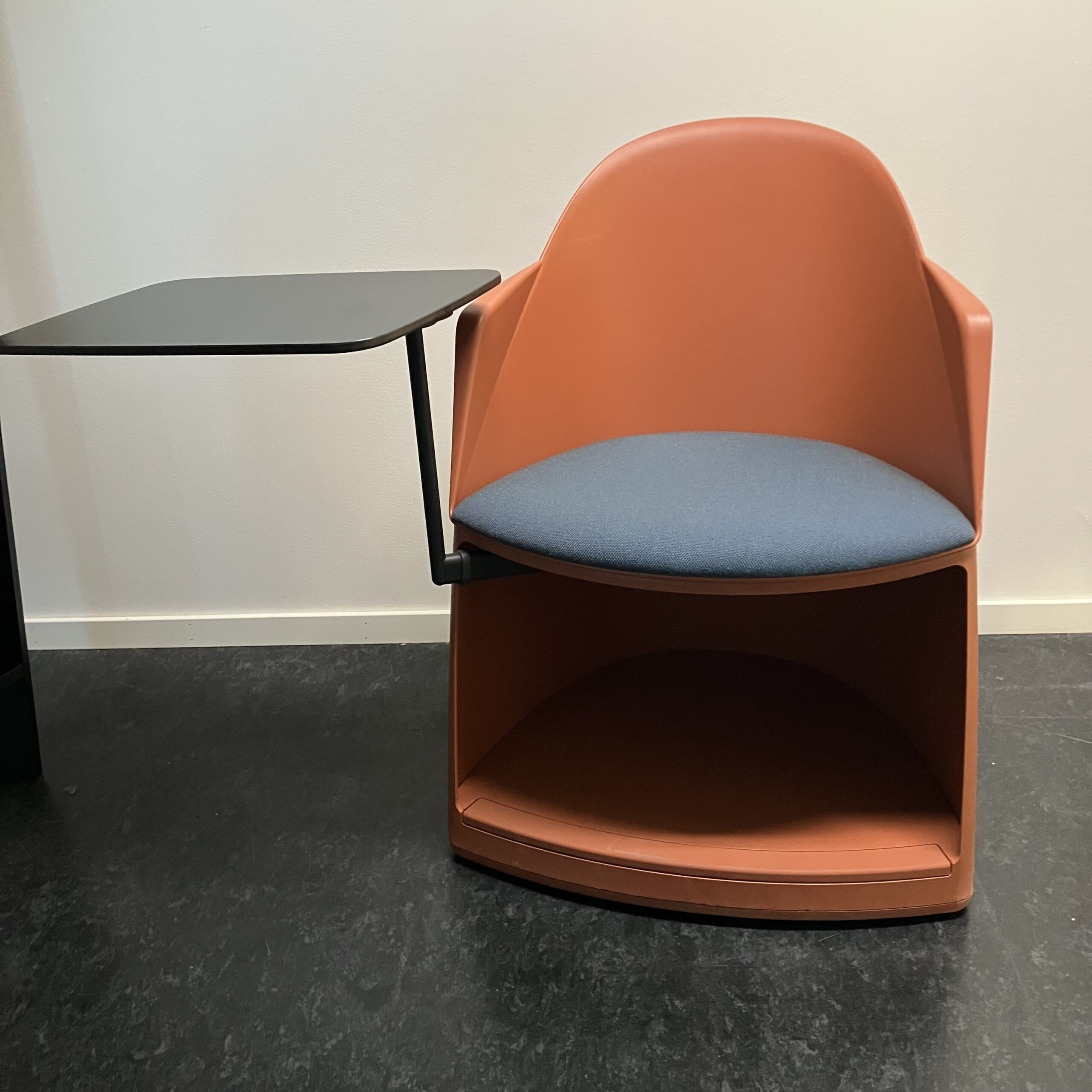 Sits i tyg (turkos). Rygg i plast (orange). Medstativ i plast (orange).