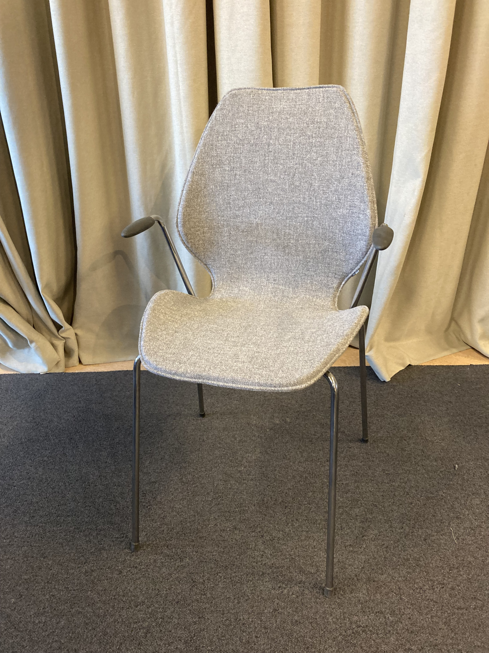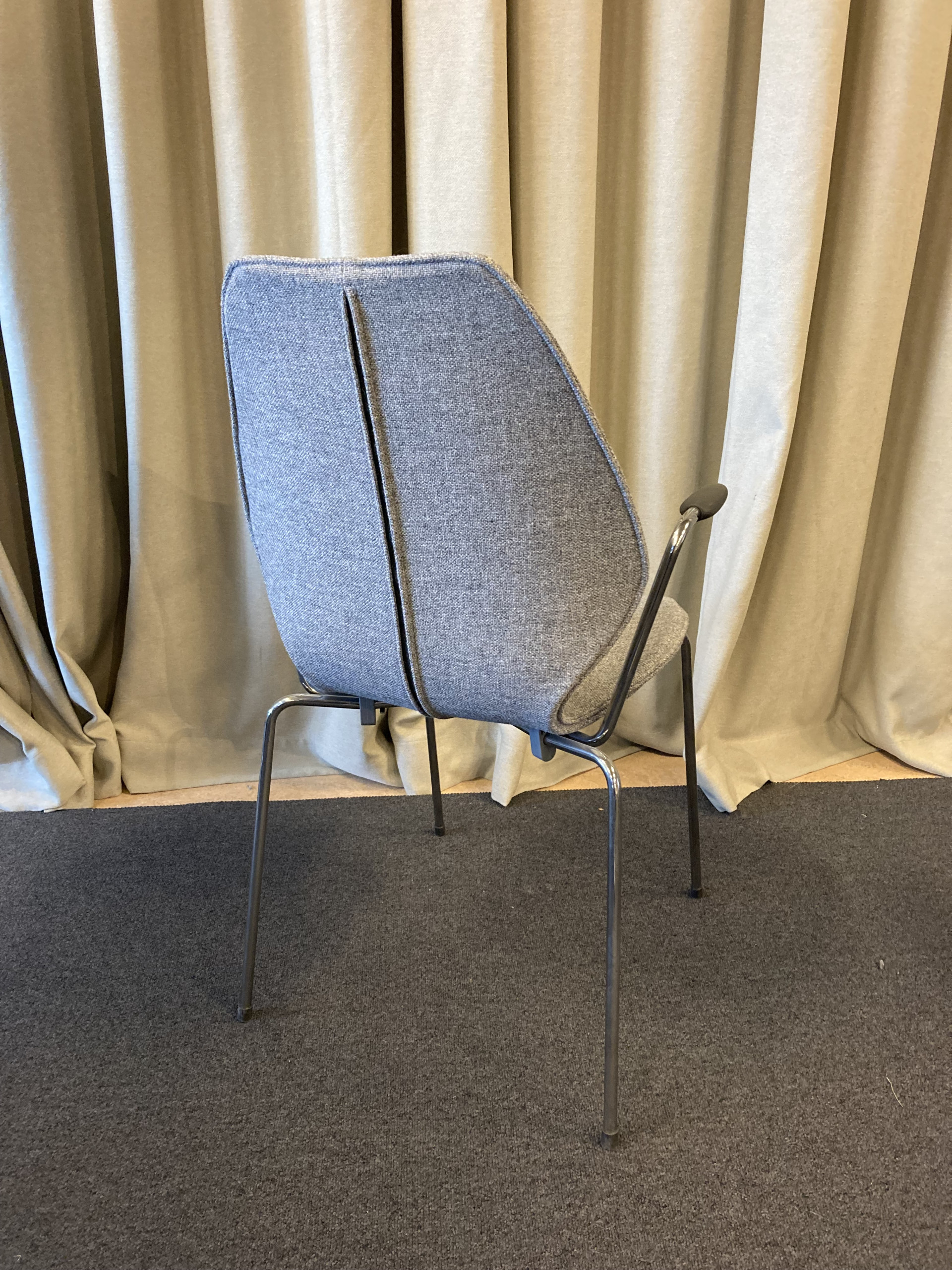 Sits och rygg i tyg (grå). Ben i metall (krom).