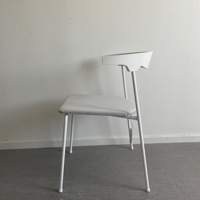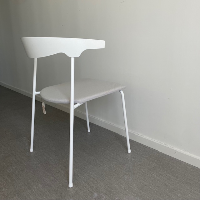 Sits i tyg (vit). Rygg i trä (vit). Ben i metall (vit).