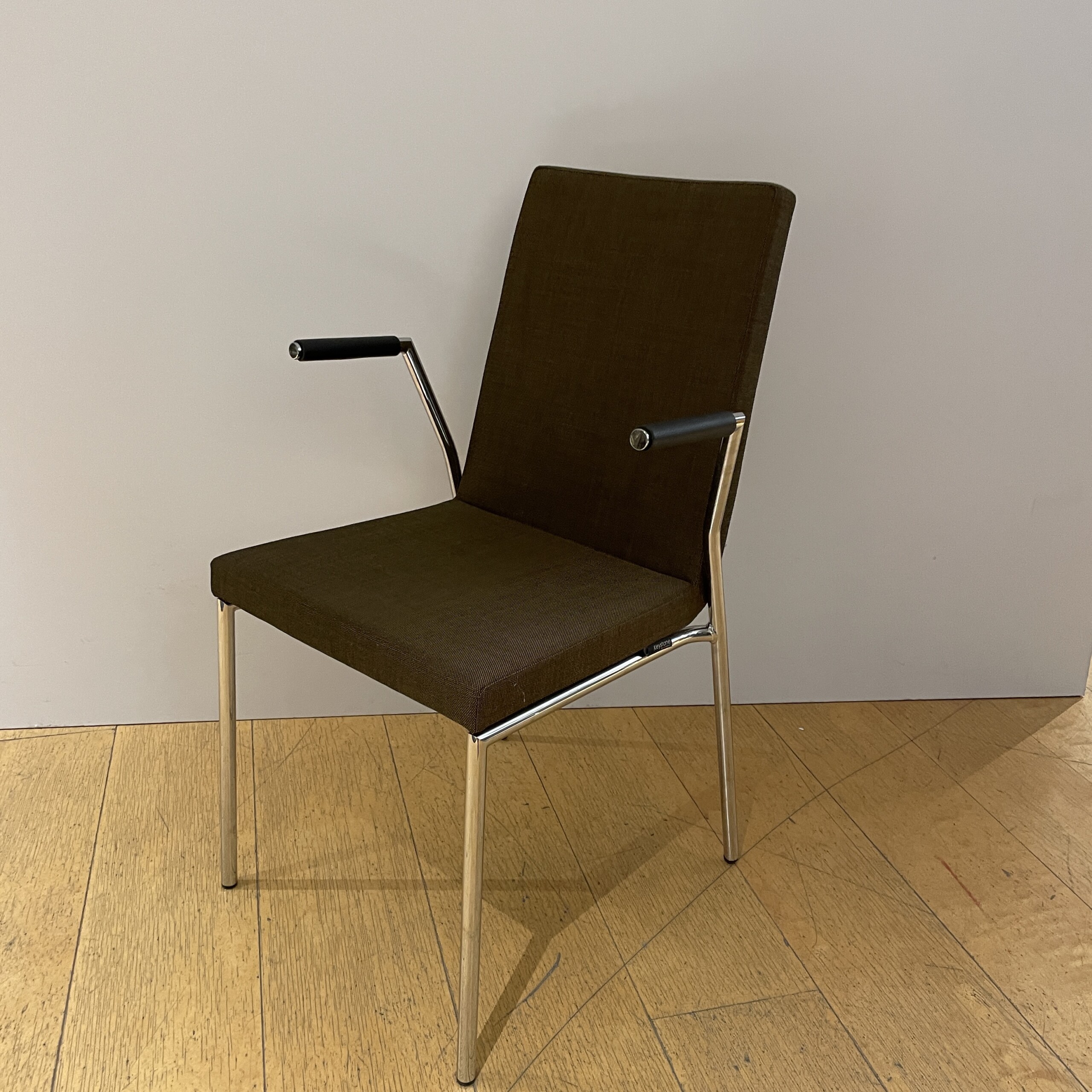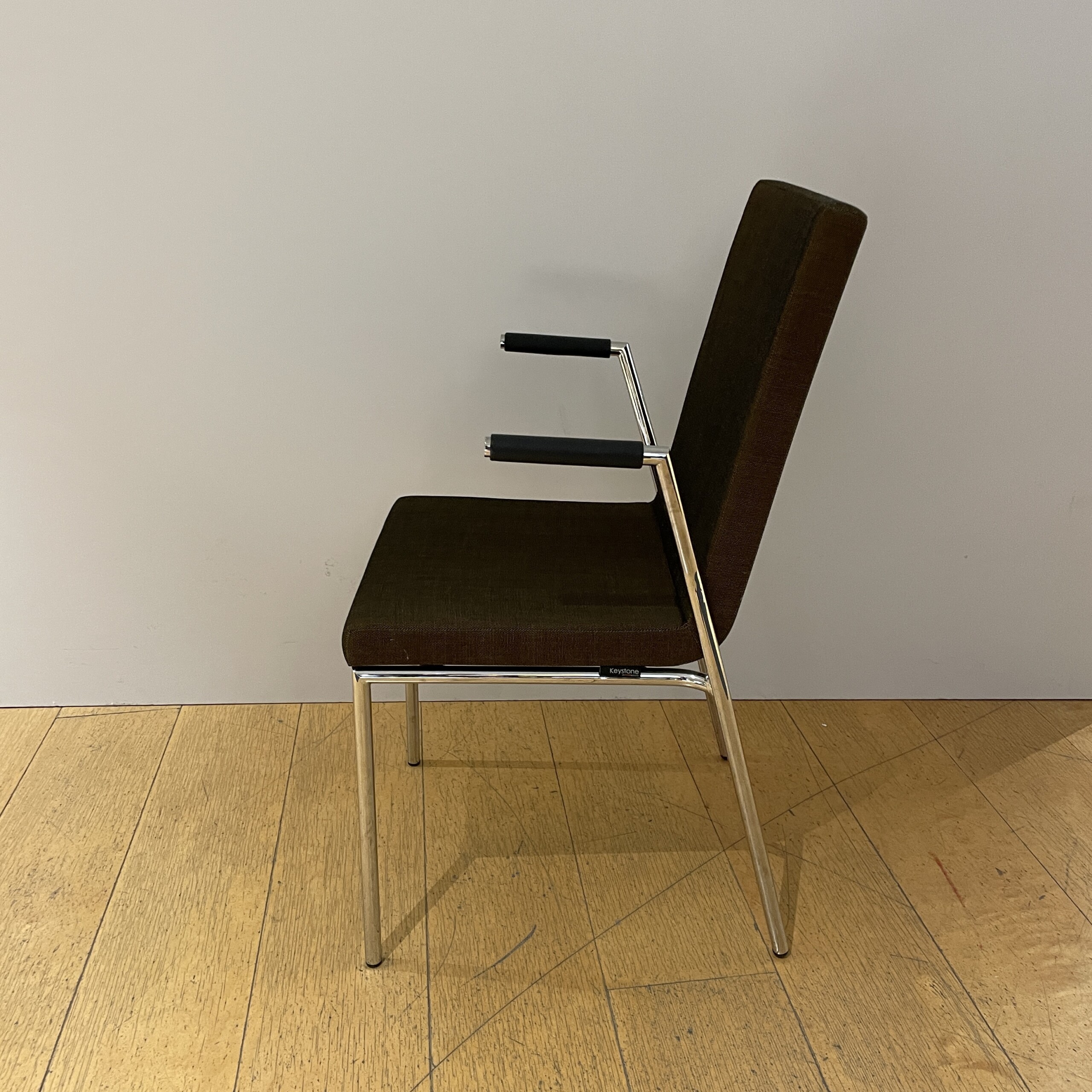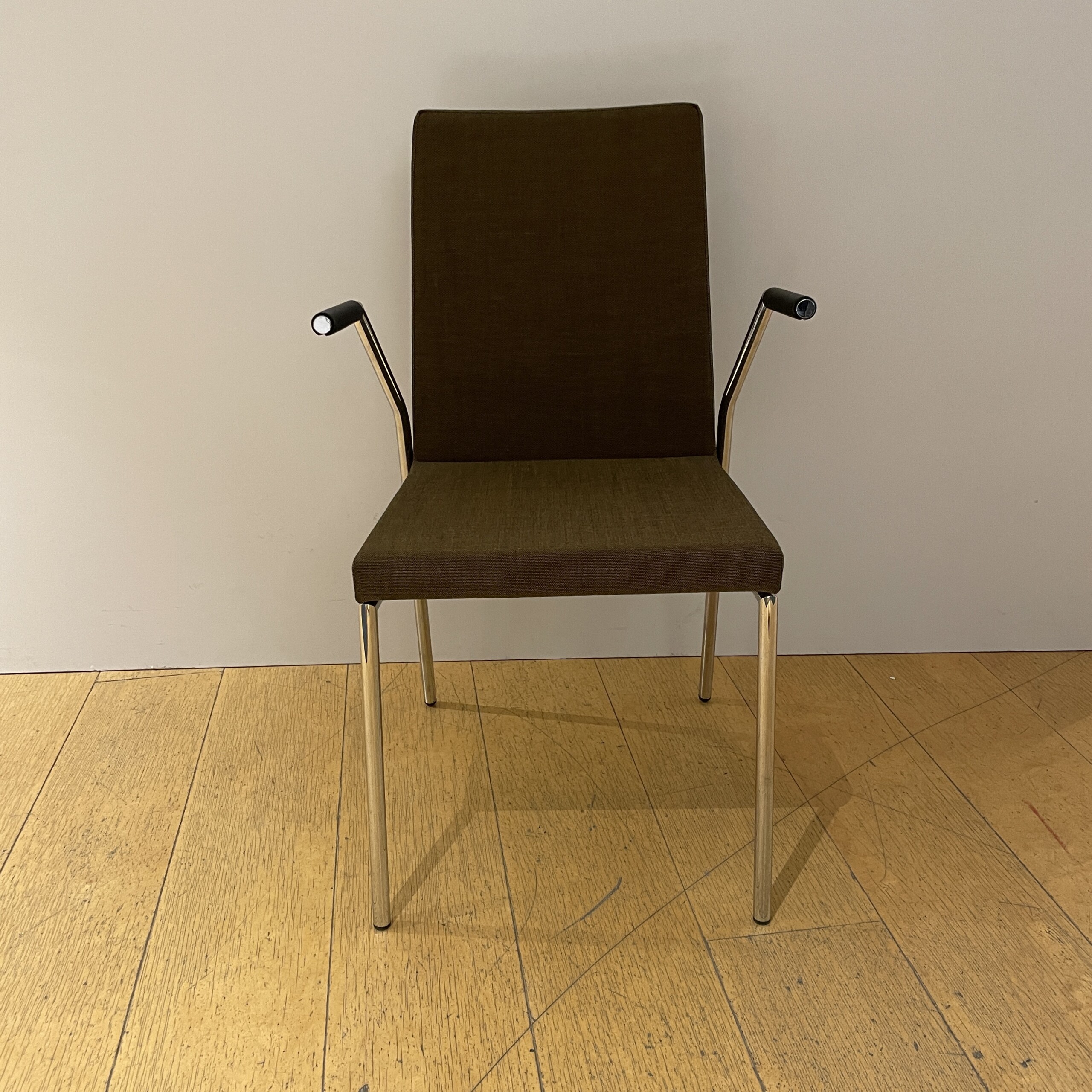 Sits och rygg i tyg (brun). Ben i metall (krom).