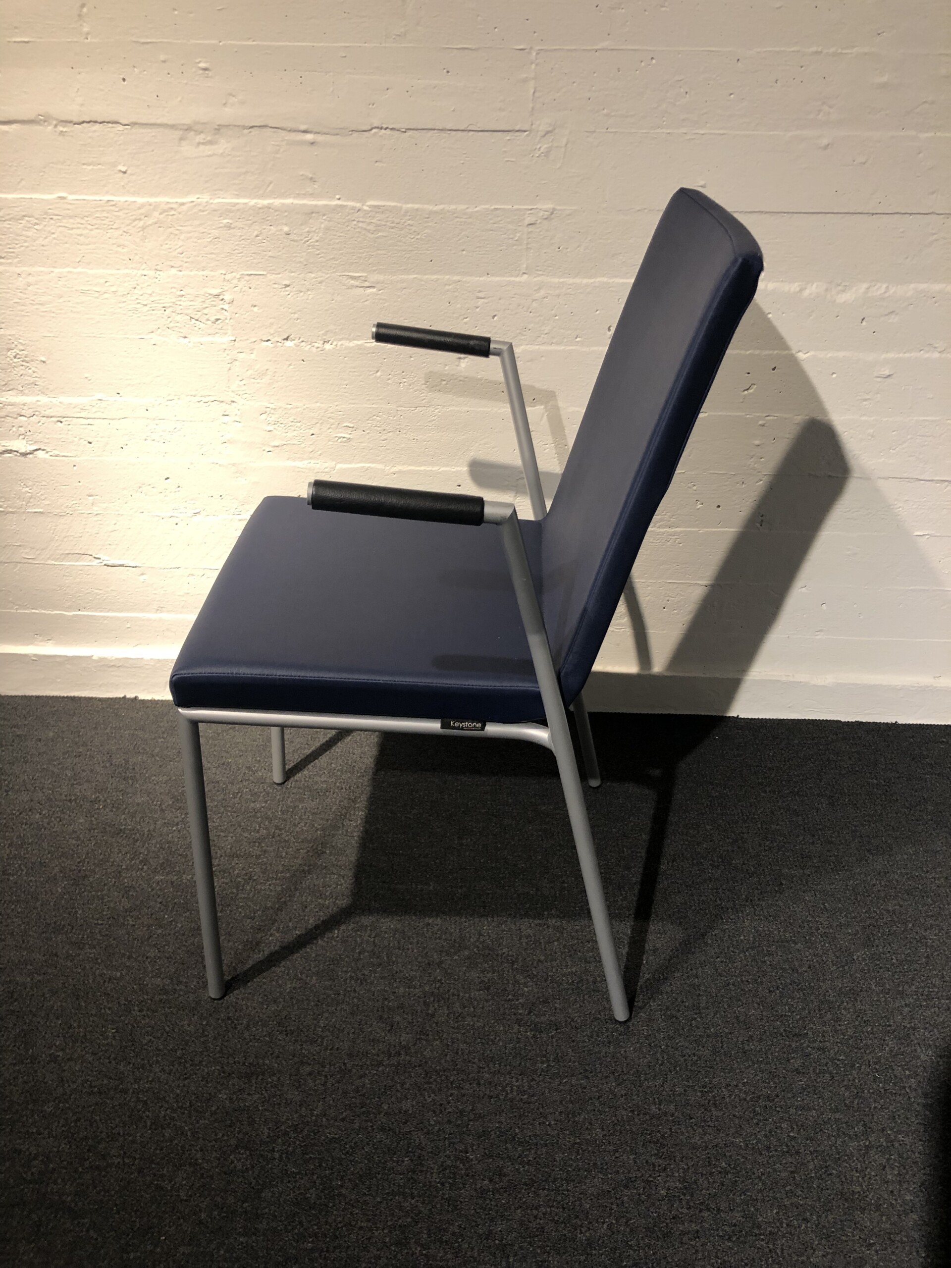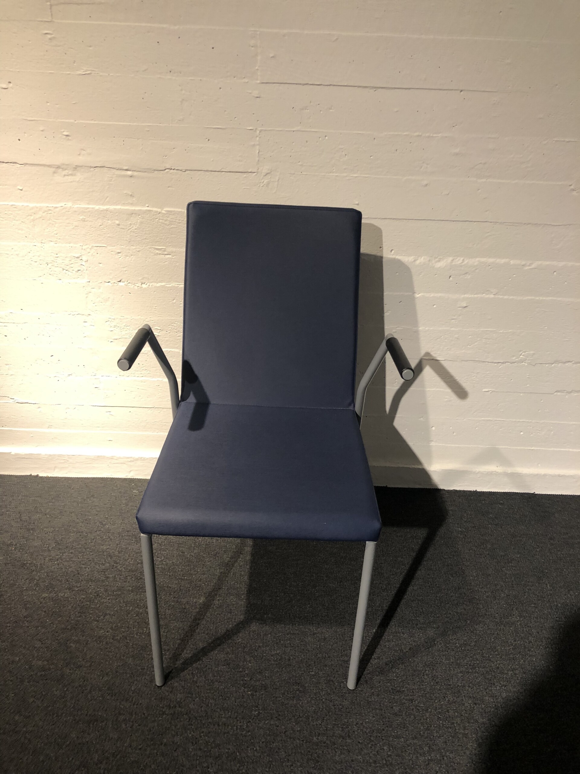 Sits och rygg i tyg (blå). Ben i metall (silver).