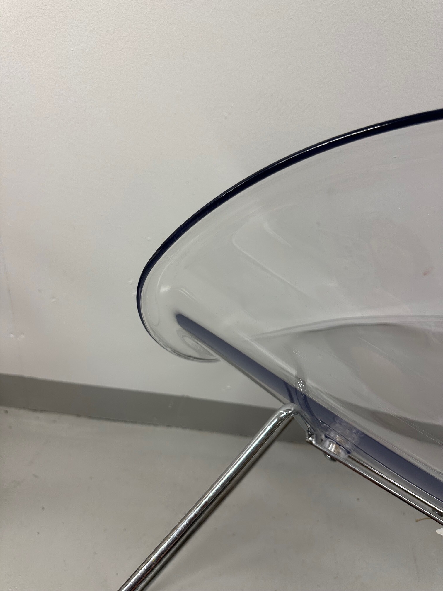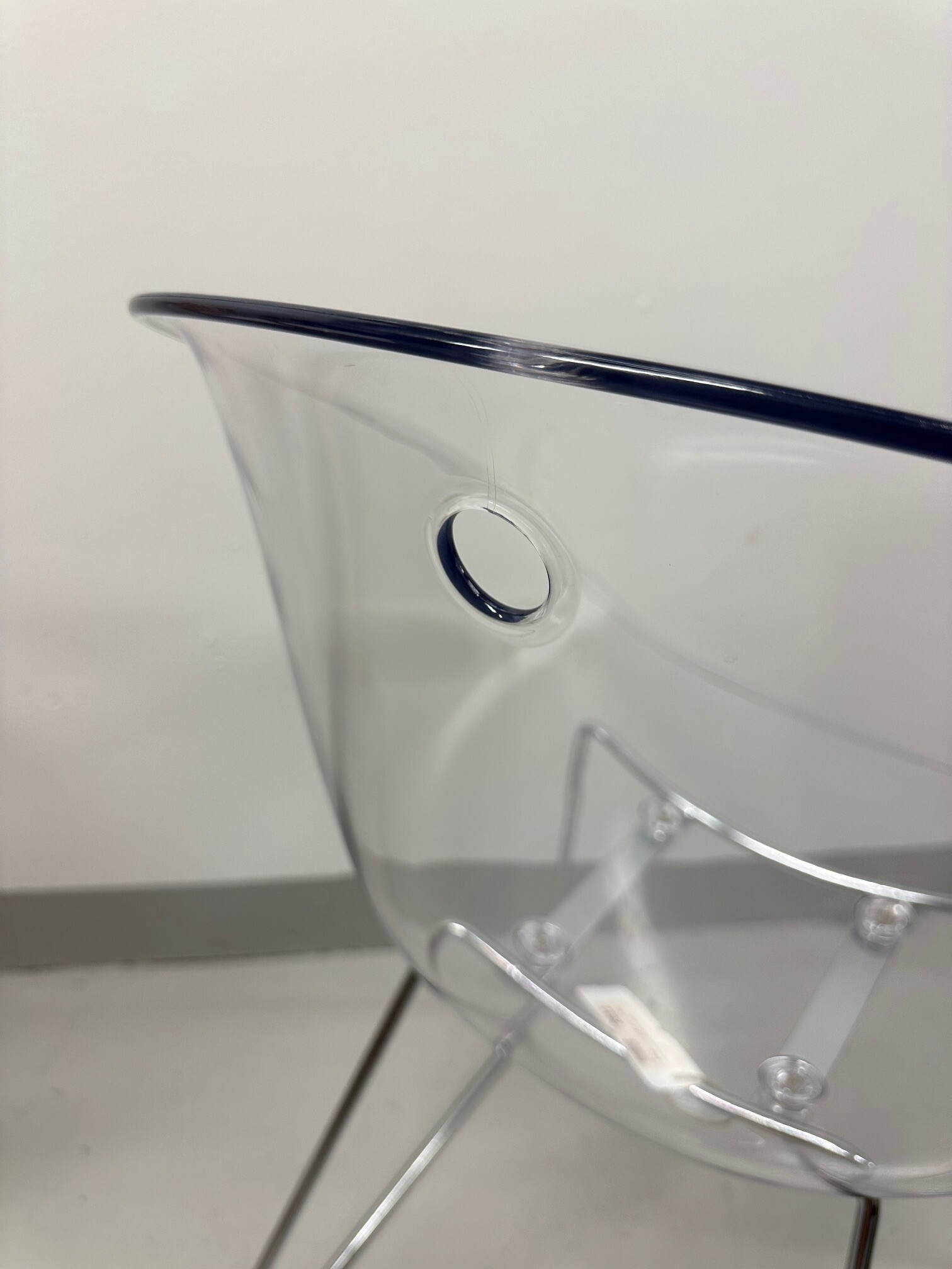 Sits och rygg i plast (transparent). Medstativ i metall (krom).