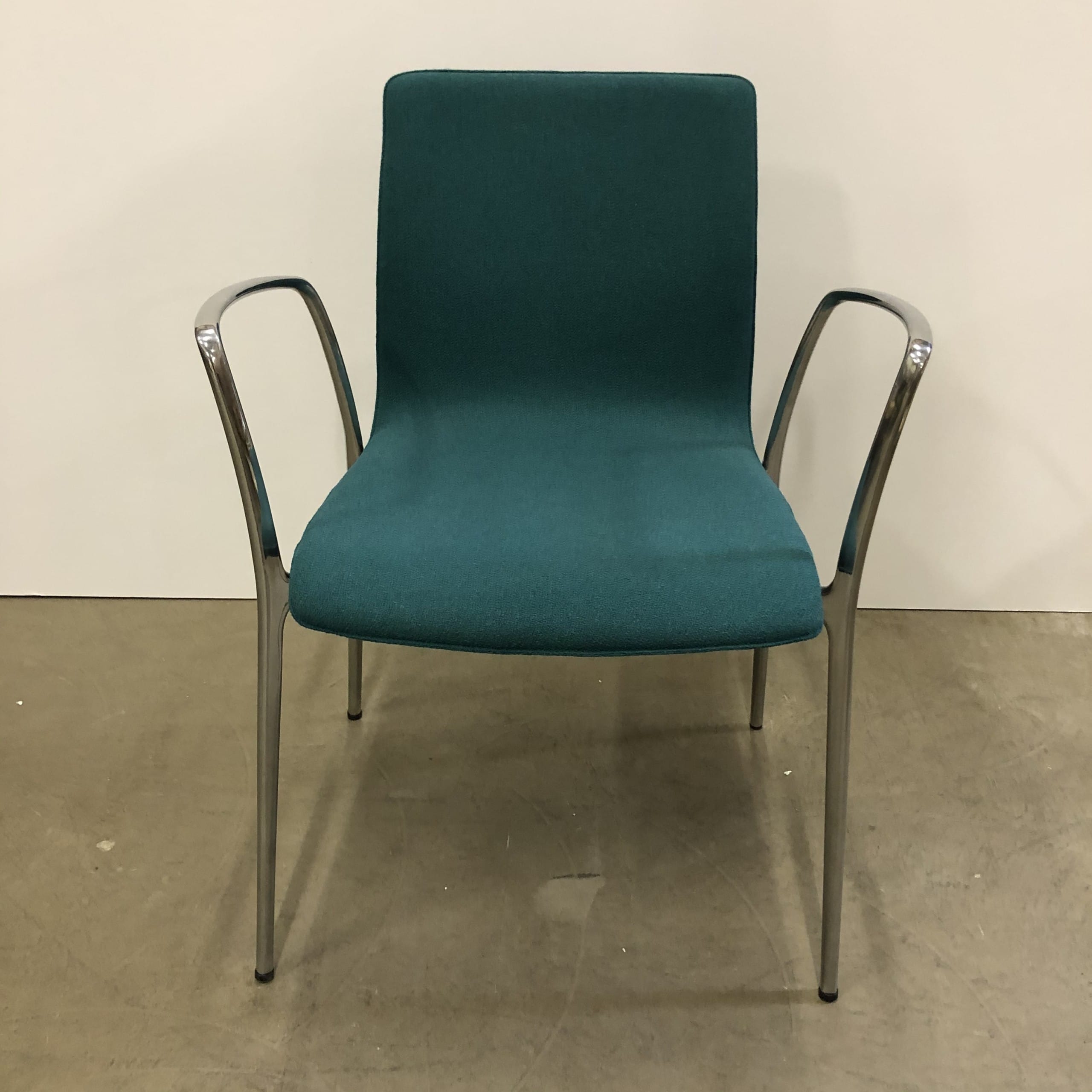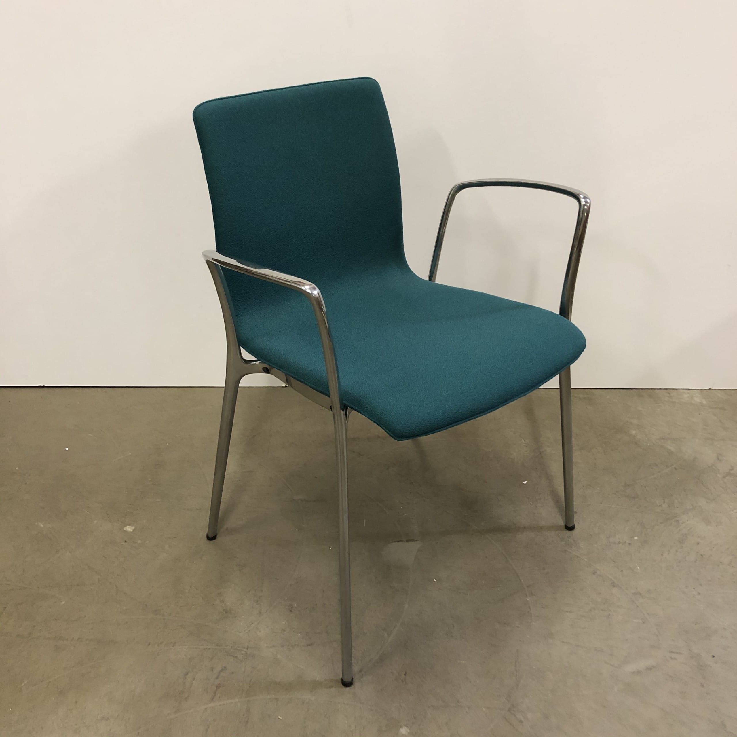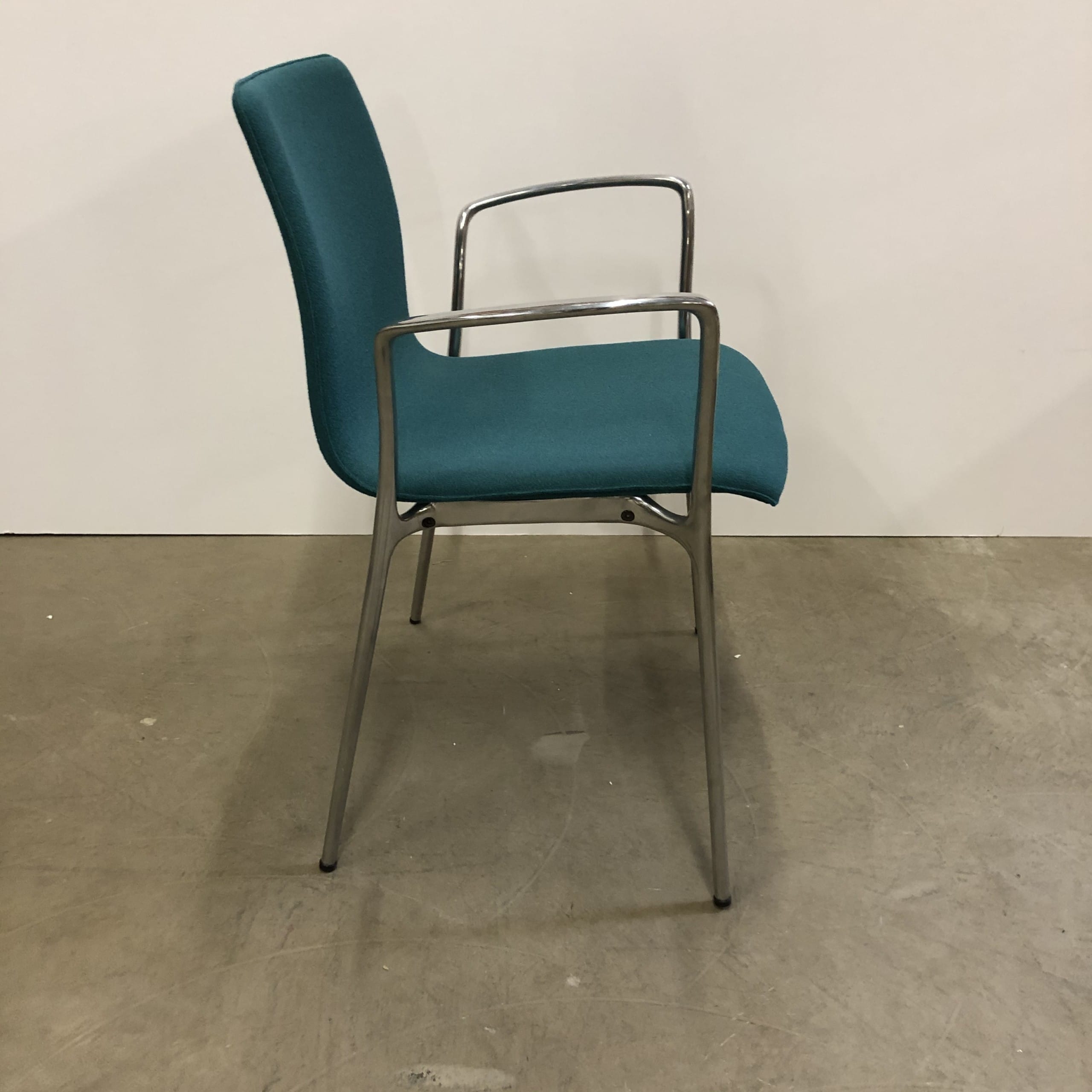 Sits och rygg i tyg (turkos). Ben i metall (aluminium).