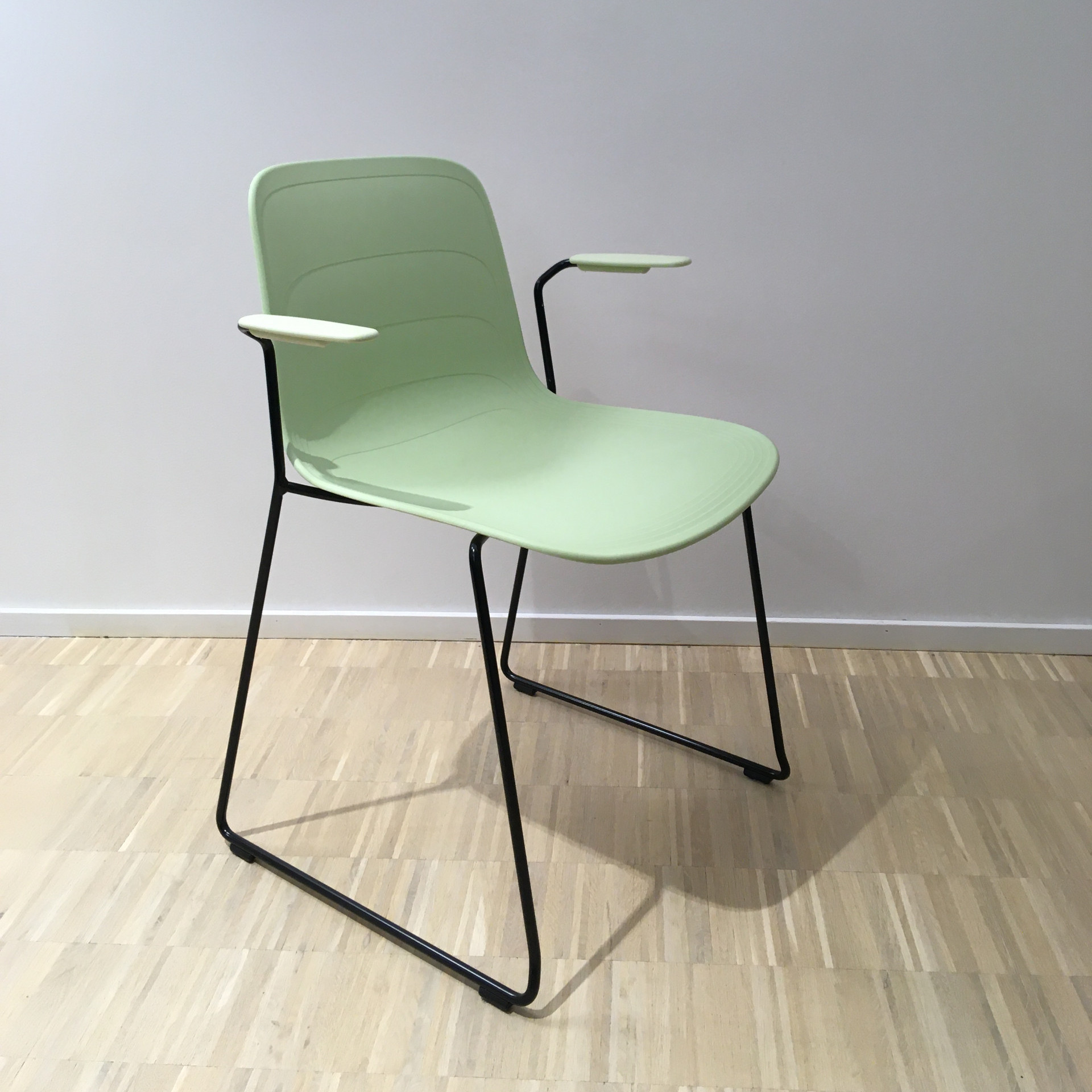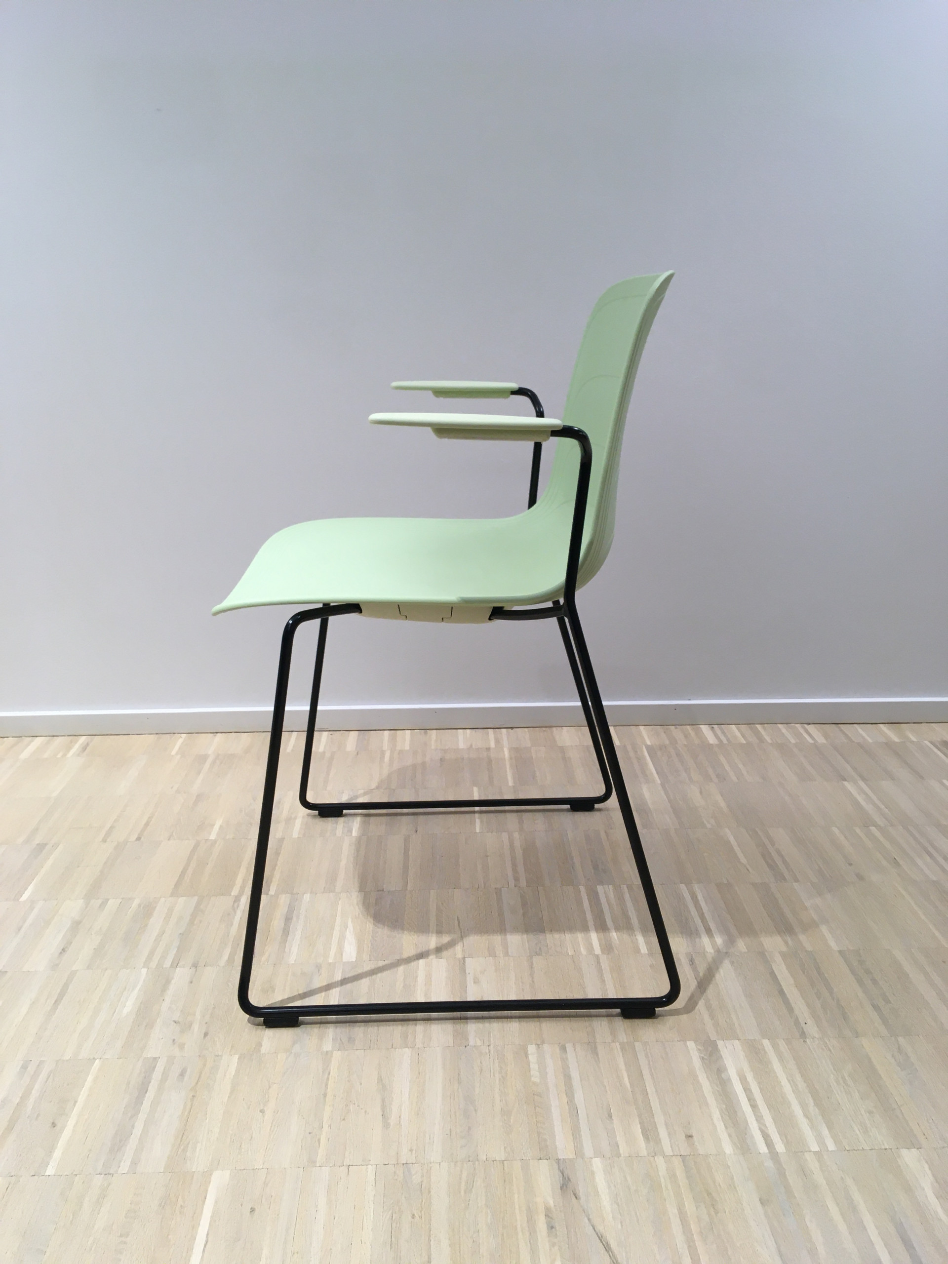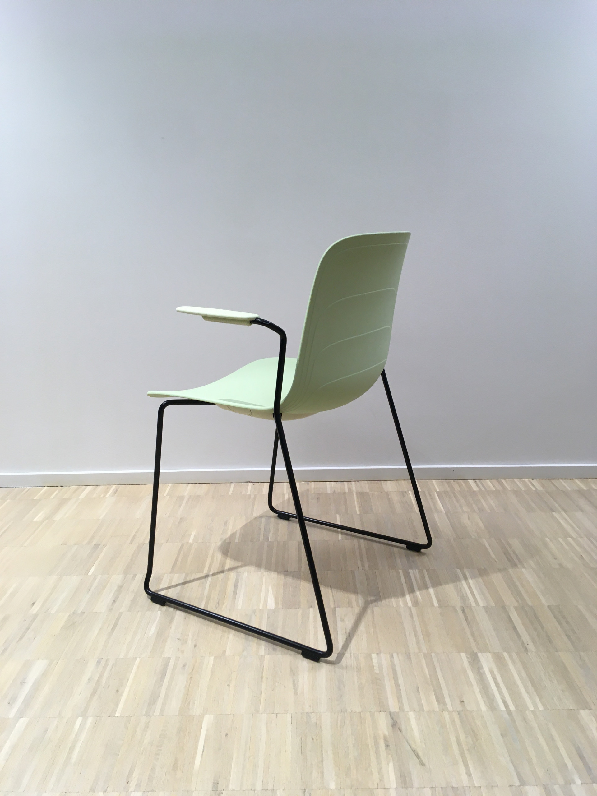 Sits och rygg i plast (grön). Medstativ i metall (aluminium).
