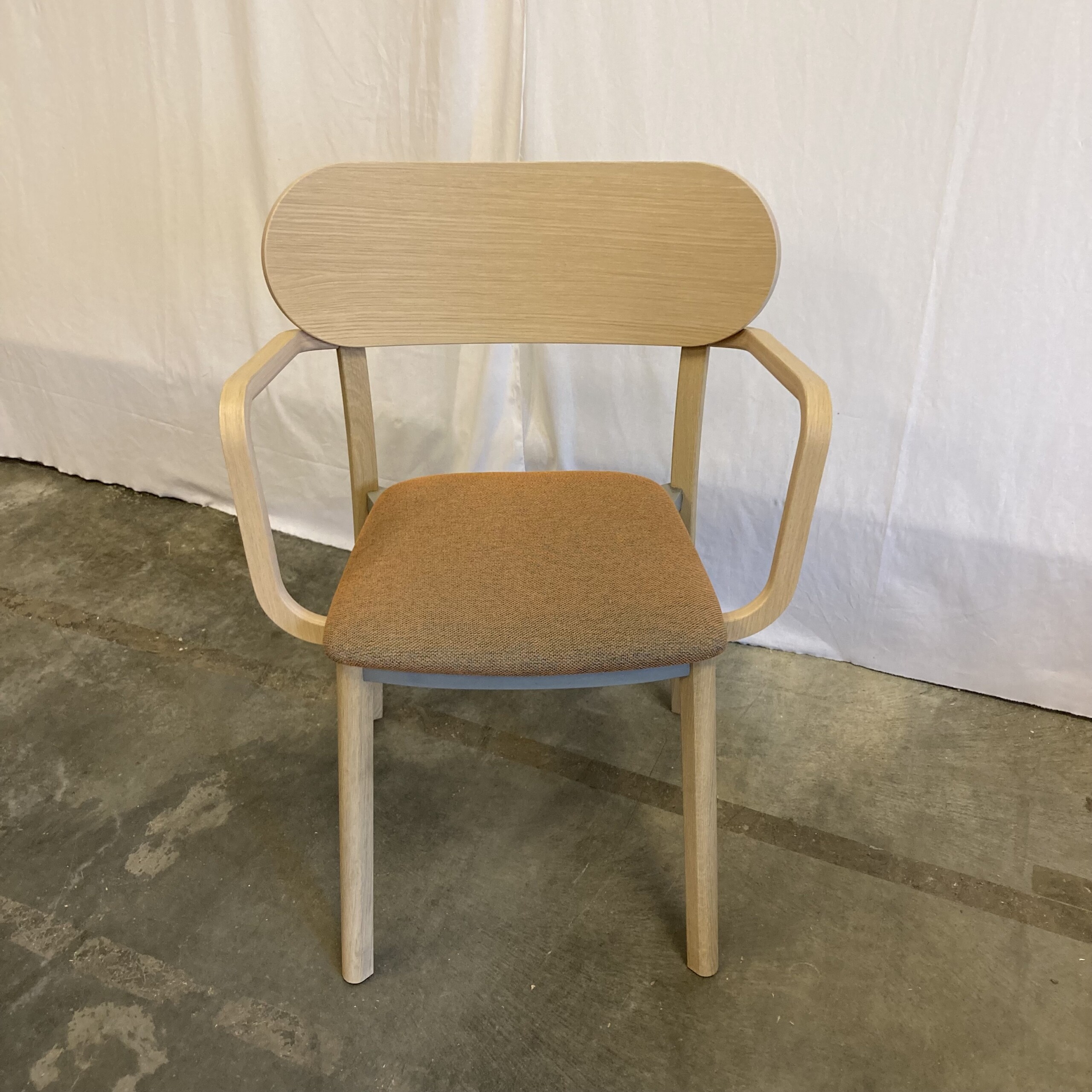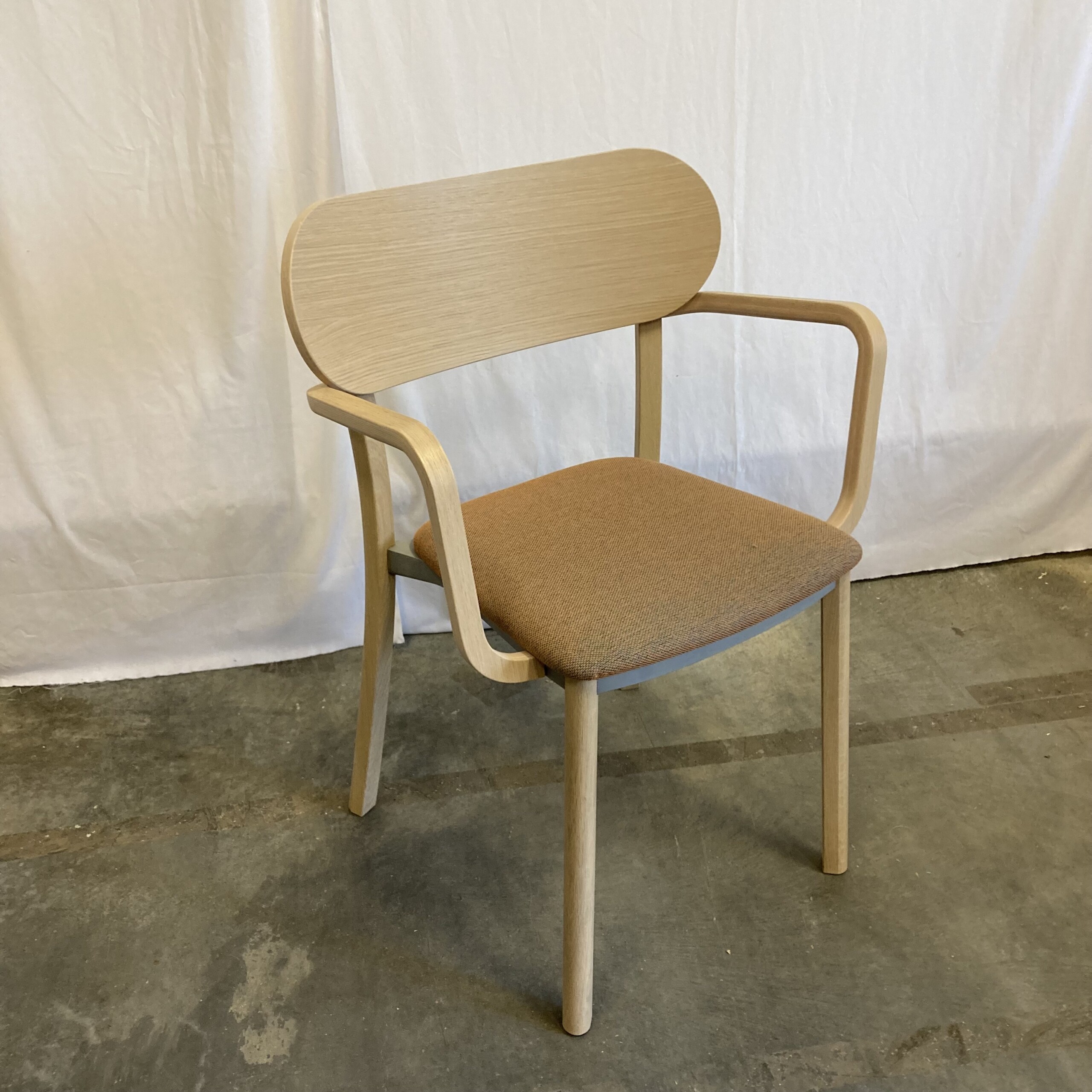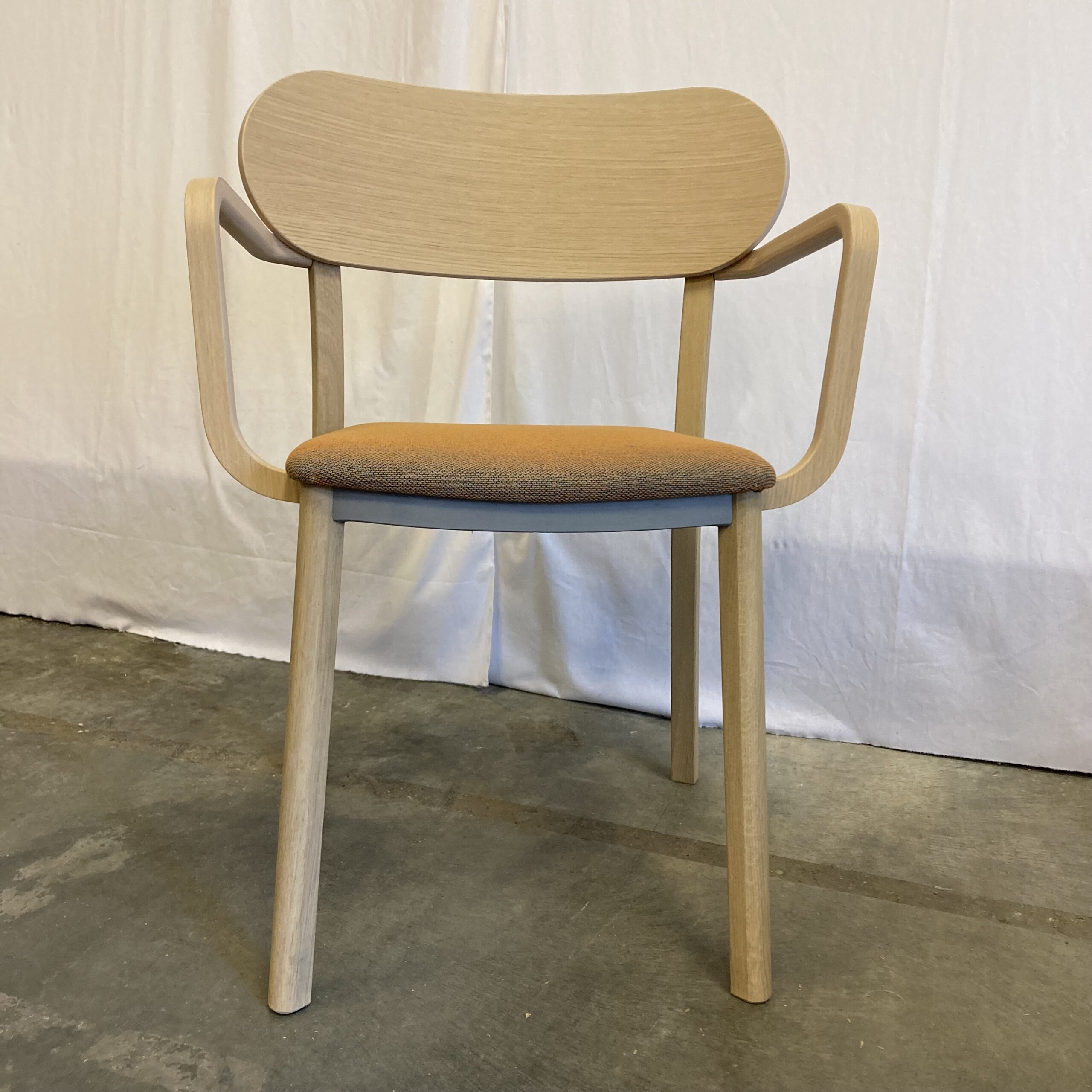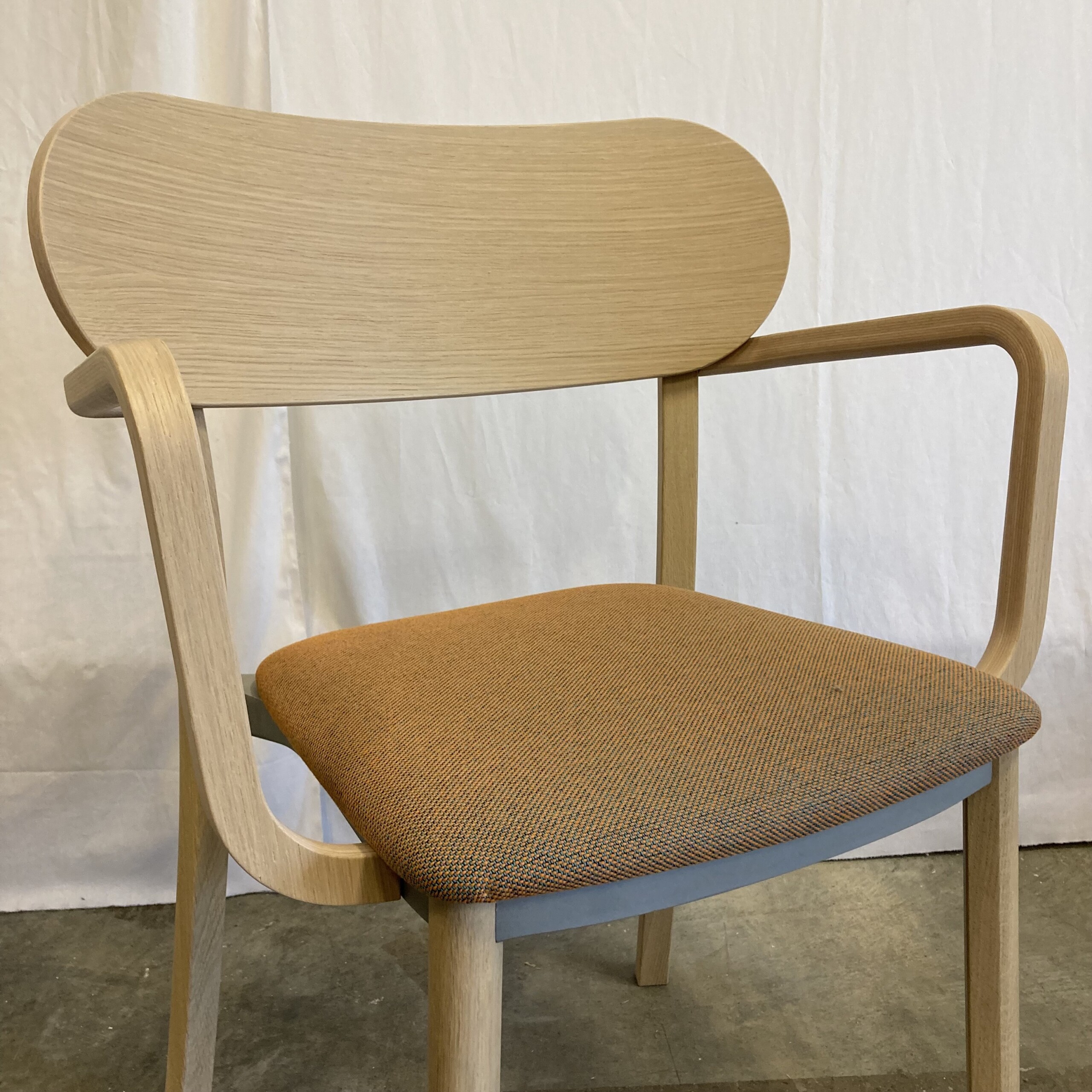 Sits i tyg (orange). Rygg i trä (ek). Ben i trä (ek).