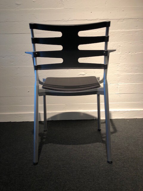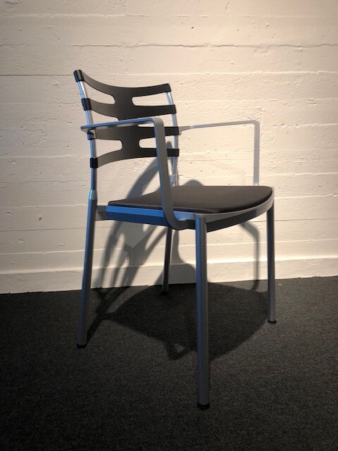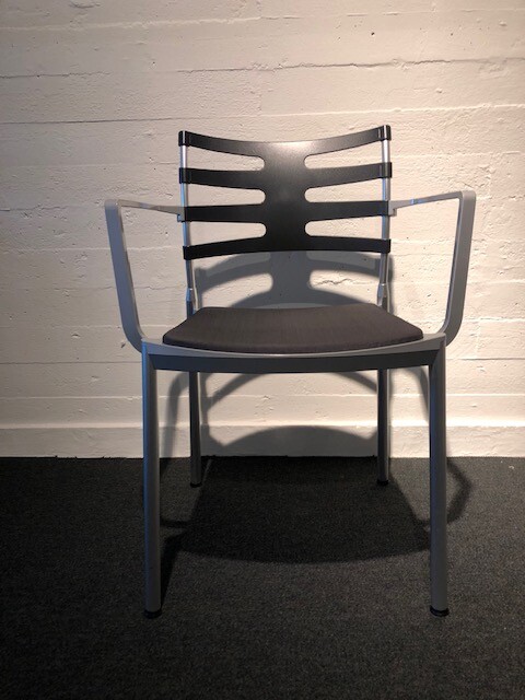 Sits i konstläder (grå). Rygg i plast (svart). Ben i metall (silver).
